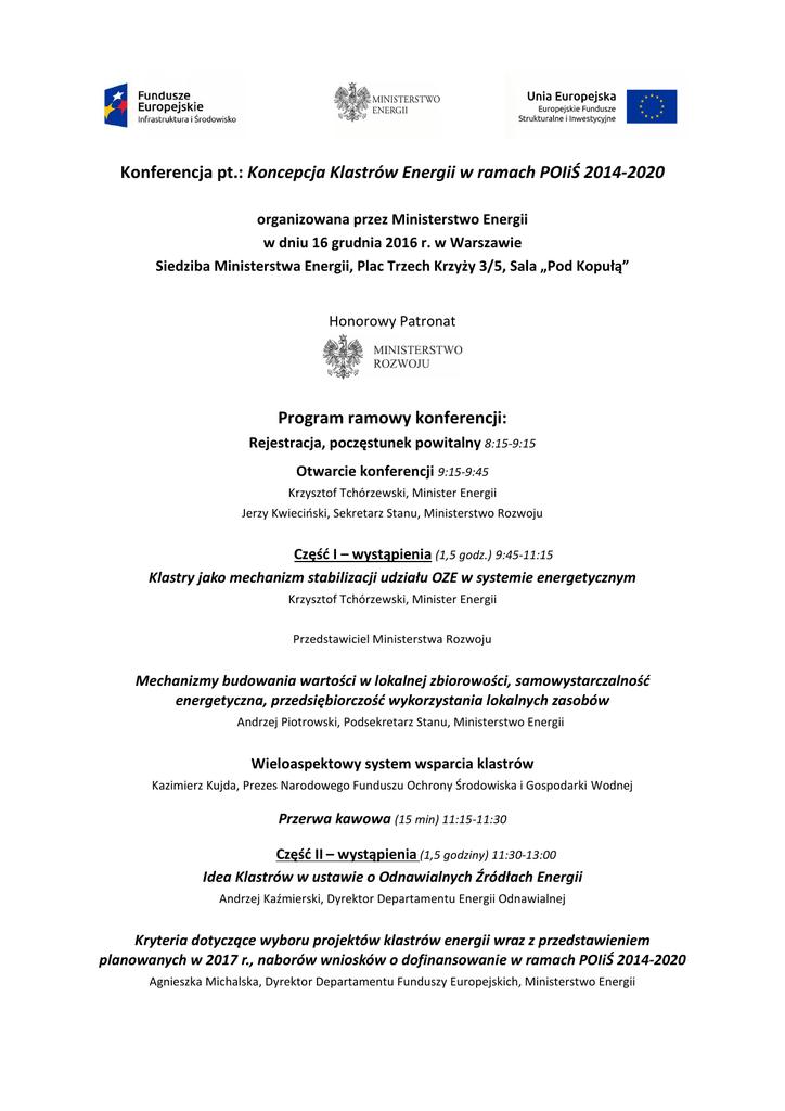 Konferencja pt.: Koncepcja Klastrów Energii w ramach POIiŚ 2014-2020 organizowana przez Ministerstwo Energii w dniu 16 grudnia 2016 r. w Warszawie Siedziba Ministerstwa Energii, Plac Trzech Krzyży 3/5, Sala „Pod Kopułą” Honorowy Patronat Program ramowy konferencji: Rejestracja, poczęstunek powitalny 8:15-9:15 Otwarcie konferencji 9:15-9:45 Krzysztof Tchórzewski, Minister Energii Jerzy Kwieciński, Sekretarz Stanu, Ministerstwo Rozwoju Część I – wystąpienia (1,5 godz.) 9:45-11:15 Klastry jako mechanizm stabilizacji udziału OZE w systemie energetycznym Krzysztof Tchórzewski, Minister Energii Przedstawiciel Ministerstwa Rozwoju Mechanizmy budowania wartości w lokalnej zbiorowości, samowystarczalność energetyczna, przedsiębiorczość wykorzystania lokalnych zasobów Andrzej Piotrowski, Podsekretarz Stanu, Ministerstwo Energii Wieloaspektowy system wsparcia klastrów Kazimierz Kujda, Prezes Narodowego Funduszu Ochrony Środowiska i Gospodarki Wodnej Przerwa kawowa (15 min) 11:15-11:30 Część II – wystąpienia (1,5 godziny) 11:30-13:00 Idea Klastrów w ustawie o Odnawialnych Źródłach Energii Andrzej Kaźmierski, Dyrektor Departamentu Energii Odnawialnej Kryteria dotyczące wyboru projektów klastrów energii wraz z przedstawieniem planowanych w 2017 r., naborów wniosków o dofinansowanie w ramach POIiŚ 2014-2020 Agnieszka Michalska, Dyrektor Departamentu Funduszy Europejskich, Ministerstwo Energii Przykłady funkcjonujących klastrów energii Marek Kolasiński, Prezes Zarządu, Centrum Rozwoju Komunalnego S.A. Tomasz Szmuc, Przewodniczący Rady Partnerów Klastra Zielone Podhale Przerwa kawowa (15 min) 13:00-13:15 Część III - prezentacja, panel dyskusyjny (1,15 godziny) 13:15-14:30 Prezentacja wyników ekspertyzy - Koncepcja funkcjonowania klastrów energii w Polsce Krajowa Agencja Poszanowania Energii S.A. Panel dyskusyjny Prof. dr hab. inż. Jan Popczyk, Politechnika Śląska Bogdan Dobrzeniecki, Ernst & Young sp. z o.o. dr Sławomir Kopeć, Dyrektor Centrum Zaawansowanych Technologii Miasta Przyszłości, Akademia GórniczoHutnicza w Krakowie Mariusz Stachnik, Prezes Zarządu, Mazowiecki Klaster ICT Obiad, rozmowy kuluarowe, zakończenie konferencji ( 1 godz.) 14.30-15.30