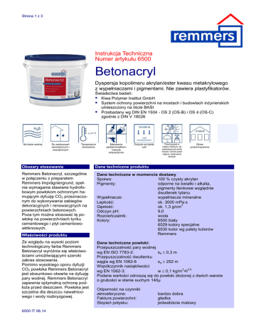 Strona 1 z 3 Instrukcja Techniczna Numer artykułu 6500 Betonacryl Dyspersja kopolimeru akrylan/ester kwasu metakrylowego z wypełniaczami i pigmentami. Nie zawiera plastyfikatorów. Świadectwa badań: Kiwa Polymer Institut GmbH System ochrony powierzchni na mostach i budowlach inżynierskich umieszczony na liście BASt Przebadany wg DIN EN 1504 - OS 2 (OS-B) i OS 4 (OS-C) zgodnie z DIN V 18026 Na bazie wodnej Do zastosowań wewnętrznych i zewnętrznych Temperatura stosowania Obszary stosowania Remmers Betonacryl, szczególnie w połączeniu z preparatem Remmers Imprägniergrund, spełnia wymagania stawiane hydrofobowym powłokom ochronnym hamującym dyfuzję CO2 przeznaczonym do wykonywania zabiegów dekoracyjnych i renowacyjnych na powierzchniach betonowych. Poza tym można stosować tę powłokę na powierzchniach tynku cementowego i płyt cementowowłóknowych. Właściwości produktu Ze względu na wysoki poziom technologiczny farba Remmers Betonacryl wyróżnia się właściwościami umożliwiającymi szeroki zakres stosowania. Pomimo wysokiego oporu dyfuzji CO2 powłoka Remmers Betonacryl jest stosunkowo otwarta na dyfuzję pary wodnej. Remmers Betonacryl zapewnia optymalną ochronę podłoża przed deszczem. Powłoka jest szczelna dla deszczu nawałnicowego i wody rozbryzgowej. 6500 IT 06.14 Malowanie pędzlem/wałkiem /natrysk airless/airmix Zużycie na każdy cykl Przechowywać w miejscu chłodnym, ale zabezpieczonym przed mrozem. Chronić przed wilgocią. Opakowanie zamykać Okres przechowywania Dane techniczne produktu Dane techniczne w momencie dostawy Spoiwo: 100 % czysty akrylan Pigmenty: odporne na światło i alkalia, pigmenty tlenkowe względnie dwutlenek tytanu Wypełniacze: wypełniacze mineralne Lepkość: ok. 3000 mPa⋅s 3 Gęstość: ok. 1,3 g/cm Odczyn pH: 9,0 Rozcieńczalnik: woda Kolory: 6500 biały 6529 kolory specjalne 6530 kolor wg palety kolorów Remmers Dane techniczne powłoki: Przepuszczalność pary wodnej wg EN ISO 7783-2: sd ≤ 0,3 m Przepuszczalność dwutlenku węgla wg EN 1062-6 sd ≥ 252 m Współczynnik nasiąkliwości 2 0,5 wg EN 1062-3: w ≤ 0,1 kg/m •h Podane wartości odnoszą się do powłoki złożonej z dwóch warstw o grubości w stanie suchym 140µ Odporność na czynniki atmosferyczne: Faktura powierzchni: Stopień połysku: bardzo dobra gładka jedwabiście matowy Strona 2 z 3 Narzędzia, czyszczenie Pędzel, pędzel angielski, wałek futrzany, urządzenie natryskowe airless. Wszystkie narzędzia i urządzenie natryskowe należy czyścić na świeżo wodą. Rodzaj opakowania, zużycie, składowanie Rodzaj opakowania: Pojemniki z tworzywa sztucznego 5 l i 15 l Materiał nie żółknie, jest wybitnie odporny na czynniki atmosferyczne i całkowicie odporny na zmydlenie. Farba Remmers Betonacryl jest łatwa w stosowaniu. Dzięki dobrej elastyczności dwuwarstwowa powłoka mostkuje niewielkie, ustabilizowane rysy włoskowe w podłożu. Remmers Betonacryl cechuje się bardzo dobrą zdolnością krycia. Dobra przyczepność na starym i nowym betonie elewacyjnym jak również na betonowych powierzchniach poddanych renowacji oraz możliwość nakładania na stare, mocne powłoki malarskie o spoiwie mineralnym lub opartym na żywicach organicznych otwiera przed farbą Remmers Betonacryl szerokie spektrum stosowania. Systemy ochrony powierzchni Remmers OS-B / OS 2-System Imprägniergrund + Betonacryl Remmers OS-C / OS 4-System Betofix Spachtel + Imprägniergrund + Betonacryl OS Concre-Fill + Betonacryl Podłoże Przygotowanie podłoża: Podłoża muszą być nośne, wolne od zabrudzeń (mleczka cementowego), mikroflory (glonów, porostów, mchów), rys (z wyjątkiem rys włoskowych) i substancji antyadhezyjnych. Sposób stosowania Powierzchnie tynków cementowych, nie piaszczące, nośne podłoża, takie jak beton, należy zagruntować preparatem Remmers Imprägniergrund. Zużycie materiału: 0,10-0,30 l/m², zależnie od chłonności podłoża. Powierzchnie zwietrzałych i piaszczących tynków cementowych i płyt cementowo-włóknowych oraz powłoki krzemianowe zniszczone przez czynniki atmosferyczne należy gruntować preparatem Grundierung SV lub alternatywnie preparatem Hydro-Tiefengrund. Zużycie materiału: ok. 0,20 l/m² Warstwa nawierzchniowa: W zależności od właściwości podłoża 2 - 3 warstwy na wszystkich wspomnianych podłożach. Zużycie materiału zależy od chłonności podłoża i wynosi ok. 0,20 l/m² na każdą warstwę. Zużycie: ok. 200 ml/m² na jedną warstwę zależnie od właściwości podłoża. Składowanie: Co najmniej 12 miesięcy w oryginalnych, zamkniętych opakowaniach, w miejscu zabezpieczonym przed mrozem i chronionym przed bezpośrednim nasłonecznieniem. Bezpieczeństwo, ochrona środowiska, usuwanie Bliższe informacje na temat bezpieczeństwa podczas transportu, składowania i stosowania oraz na temat usuwania i ochrony środowiska znajdują się w aktualnej karcie charakterystyki produktu. Kod produktu M-DF02 Remmers Baustofftechnik GmbH DIN V 18026 OS 2 OS 4 Wskazówki Gdy konieczne jest nakładanie wielowarstwowe, pomiędzy poszczególnymi cyklami roboczymi należy przestrzegać czasu schnięcia wynoszącego co najmniej 8 godzin. Farby Remmers Betonacryl nie należy nakładać przy bezpośrednim nasłonecznieniu i w temperaturach poniżej +5°C, zgodnie z regułami rzemiosła. Świeżą powłokę należy chronić przed deszczem. 6500 IT 06.14 Remmers 8168100fax: fax:610-61 8168111 Remmers Polska Polska Sp. Sp. zz o.o. o.o. •• ul. ul. Sowia Sowia 88 •• 62-080 62-080 Tarnowo Tarnowo Podgórne Podgórne •• tel. tel. 0-61 61 8168100 8168111 www.remmers.pl www.remmers.pl Strona 3 z 3 1119 – CPD – 0818 Remmers Baustofftechnik GmbH Bernhard-Remmers-Str. 13 D – 49624 Löningen 09 GBI F 020 EN 1504-2:2004 Wyroby do ochrony powierzchniowej – powłoka EN 1504-2: ZA.1d oraz ZA.1e Nacinanie ≤ GT 2 Przepuszczalność CO2 sd > 50 m Przepuszczalność pary wodnej klasa I Absorpcja kapilar