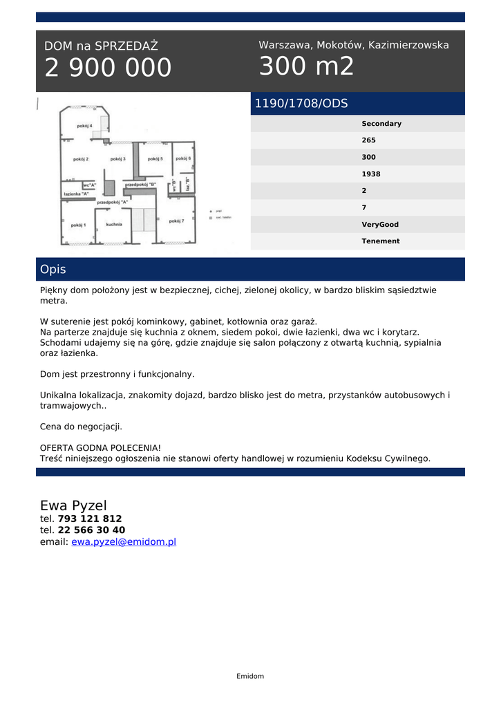 DOM na SPRZEDAŻ 2 900 000 Warszawa, Mokotów, Kazimierzowska 300 m2 1190/1708/ODS Secondary 265 300 1938 2 7 VeryGood Tenement Opis Piękny dom położony jest w bezpiecznej, cichej, zielonej okolicy, w bardzo bliskim sąsiedztwie metra. W suterenie jest pokój kominkowy, gabinet, kotłownia oraz garaż. Na parterze znajduje się kuchnia z oknem, siedem pokoi, dwie łazienki, dwa wc i korytarz. Schodami udajemy się na górę, gdzie znajduje się salon połączony z otwartą kuchnią, sypialnia oraz łazienka. Dom jest przestronny i funkcjonalny. Unikalna lokalizacja, znakomity dojazd, bardzo blisko jest do metra, przystanków autobusowych i tramwajowych.. Cena do negocjacji. OFERTA GODNA POLECENIA! Treść niniejszego ogłoszenia nie stanowi oferty handlowej w rozumieniu Kodeksu Cywilnego. Ewa Pyzel tel. 793 121 812 tel. 22 566 30 40 email: [email protected] Emidom Powered by TCPDF (www.tcpdf.org)