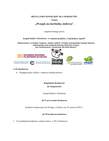 REGULAMIN KONKURSU DLA RODZICÓW: Temat: „Przepis na herbatkę ziołową”. organizowanego przez: Zespół Szkół w Pawłowie- w ramach projektu „Tajemniczy ogród”. Cele Konkursu: Propagowanie wiedzy z zakresu ziołolecznictwa. Regulamin Konkursu: §1 Organizator Zespół Szkół w Pawłowie §2 Czas trwania Konkursu Konkurs rozpoczyna się 20 maja, a kończy się 10 czerwca 2015 r. §3 Warunki uczestnictwa 1. Uczestnikami Konkursu: rodzice dzieci z ZS w Pawłowie. 2. Uczestnicy przygotowują przepisy na ziołową herbatę w formie pisemnej, podają w nim skład herbaty- nazwy ziół oraz krótki opis dotyczący zdrowego oddziaływania. 3. Biorąc udział w Konkursie uczestnik wyraża zgodę na zastosowanie się do niniejszego regulaminu. §4 Termin i warunki dostarczenia prac 1. Prace należy dostarczyć osobiście do Organizatora Konkursu, do sekretariatu Zespołu Szkół w Pawłowie lub do wychowawcy klasy lub przedszkola , z dopiskiem na odwrocie : „Przepis na herbatkę ziołową”, imię i nazwisko rodzica, adres, nr telefonu. W terminie do 10 czerwca 2015 r. 2. Prace dostarczone po terminie nie będą oceniane. 3. Prace przechodzą na własność Organizatora. §5 Zasady przyznawania nagród 1. Komisja wyłoniona przez Organizatora Konkursu, wybierze do 24 czerwca zwycięskie prace. 2. Decyzja Komisji jest ostateczna i nieodwołalna. 3. Wyniki Konkursu ogłoszone zostaną na stronie internetowej Organizatora Konkursu. 4. Termin uroczystego wręczenia nagród : 25 czerwiec 2015 roku- na festynie rodzinnym podsumowującym projekt „Tajemniczy ogród”.