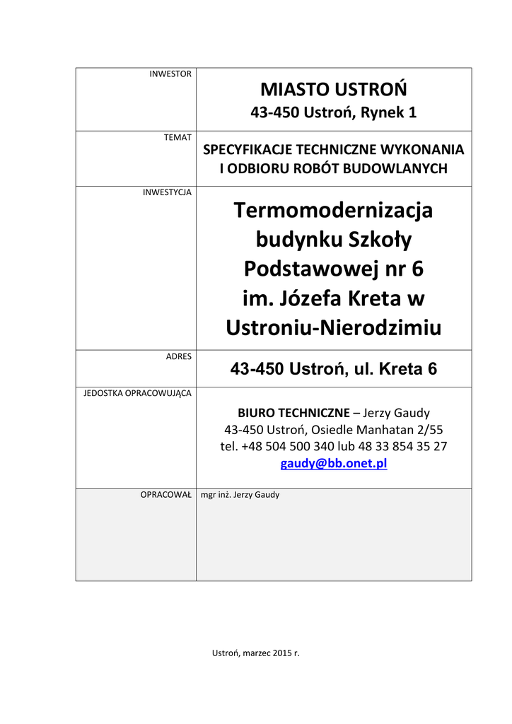 INWESTOR MIASTO USTROŃ 43-450 Ustroń, Rynek 1 TEMAT SPECYFIKACJE TECHNICZNE WYKONANIA I ODBIORU ROBÓT BUDOWLANYCH INWESTYCJA Termomodernizacja budynku Szkoły Podstawowej nr 6 im. Józefa Kreta w Ustroniu-Nierodzimiu ADRES 43-450 Ustroń, ul. Kreta 6 JEDOSTKA OPRACOWUJĄCA BIURO TECHNICZNE – Jerzy Gaudy 43-450 Ustroń, Osiedle Manhatan 2/55 tel. +48 504 500 340 lub 48 33 854 35 27 [email protected] OPRACOWAŁ mgr inż. Jerzy Gaudy Ustroń, marzec 2015 r. SPECYFIKACJE TECHNICZNE WYKONANIA I ODBIORU ROBÓT BUDOWLANYCH Opracowano na podstawie: • • • Projekty techniczne. Rozporządzenie Ministra Infrastruktury z dnia 2 września 2004 roku w sprawie szczegółowego zakresu i formy dokumentacji projektowej, specyfikacji technicznych wykonania i odbioru robót budowlanych oraz programu funkcjonalno-użytkowego (Dz. U. nr 202, poz. 2072 z dnia 16 września 2004). Przy pomocy programu komputerowego SEKO-SPEC do sporządzania specyfikacji technicznych – Ośrodek Wdrożeń Ekonomiczno-Organizacyjnych Budownictwa „PROMOCJA” 2005 ÷ 2010 – Licencja nr 492/k dla BIURO TECHNICZNE w Ustroniu. Niniejszy zestaw Specyfikacji Technicznych zawiera: NR SPECYKIKACJI KOD CPV SST-01 SST-056 SST-057 SST-090 SST-100 45000000-7 45312310-3 45310000-3 45450000-6 45331000-6 NAZWA Wymagania ogólne Roboty w zakresie ochrony odgromowej Instalacje elektryczne wewnętrzne Bezspoinowe systemy ocieplenia ścian budynków Montaż instalacji solarnej ILOŚĆ STRON 14 10 17 9 3 Inne roboty nieujęte w SST wykonywać wg „sztuki budowlanej”, zgodnie z instrukcjami producentów materiałów, Polskimi Normami stosując odpowiednio zasady wg SST-001 Wymagania ogólne. W SST poszerzono zakres robót i materiałów (poza przewidzianymi projektem) – dla umożliwienia ewentualnych zmian w czasie zlecania i wykonywania robót budowlanych. SST-01 WYMAGANIA OGÓLNE Kod CPV 45000000-7 [dotyczące wszystkich Specyfikacji Technicznych dla obiektów budowlanych] 1. WSTĘP Przedmiot ST Przedmiotem niniejszej standardowej specyfikacji technicznej (ST) są wymagania ogólne dotyczące wy-konania i odbioru robót w obiektach budowlanych. 1.1. Zakres stosowania ST Specyfikacja techniczna (ST) stanowi podstawę opracowania szczegółowej specyfikacji technicznej (SST) stosowanej jako dokument przetargowy i kontraktowy przy zlecaniu i realizacji robót wymienionych w pkt. 1.1. 1.2. Projektant sporządzający dokumentację projektową i odpowiednie szczegółowe specyfikacje techniczne wykonania i odbioru robót budowlanych może wprowadzać do niniejszej standardowej specyfikacji zmiany, uzupełnienia lub uściślenia, odpowiednie dla przewidzianych projektem zadania, obiektu i robót, uwzględniające wymagania Zamawiającego oraz konkretne warunki realizacji zadania, obiektu i robót, które są niezbędne do określania ich standardu i jakości. Odstępstwa od wymagań podanych w niniejszej specyfikacji mogą mieć miejsce tylko w przypadkach małych prostych robót i konstrukcji drugorzędnych o niewielkim znaczeniu, dla których istnieje pewność, że podstawowe wymagania będą spełnione przy zastosowaniu metod wykonania na podstawie doświadczenia i przy przestrzeganiu zasad sztuki budowlanej. Zaleca się wykorzystanie niniejszej ST przy zlecaniu robót budowlanych realizowanych ze środków pozabudżetowych (nie objętych ustawą Prawo zamówień publicznych). Zakres robót objętych ST Ustalenia zawarte w niniejszej specyfikacji obejmują wymagania ogólne, wspólne dla robót budowlanych objętych specyfikacjami technicznymi (ST) i szczegółowymi specyfikacjami technicznymi (SST) wydanymi przez OWEOB „Promocja”. 1.3. 1.4. Określenia podstawowe Ilekroć w ST jest mowa o: 1.4.1. obiekcie budowlanym – należy przez to rozumieć: a) budynek wraz z instalacjami i urządzeniami technicznymi, b) budowlę stanowiącą całość techniczno-użytkową wraz z instalacjami i urządzeniami, c) obiekt małej architektury; 1.4.2. budynku – należy przez to rozumieć taki obiekt budowlany, który jest trwale związany z gruntem, wydzielony z przestrzeni za pomocą przegród budowlanych oraz posiada fundamenty i dach. 1.4.3. budynku mieszkalnym jednorodzinnym – należy przez to rozumieć budynek wolno stojący albo budynek o zabudowie bliźniaczej, szeregowej lub grupowej, służący zaspokajaniu potrzeb mieszkaniowych, stanowiący konstrukcyjnie samodzielną całość, w którym dopuszcza się wydzielenie nie więcej niż dwóch lokali mieszkalnych albo jednego lokalu mieszkalnego i lokalu użytkowego o powierzchni całkowitej nieprzekraczającej 30% powierzchni całkowitej budynku. 1.4.4. budowli – należy przez to rozumieć każdy obiekt budowlany nie będący budynkiem lub obiektem małej architektury, jak: lotniska, drogi, linie kolejowe, mosty, estakady, tunele, sieci techniczne, wolno stojące maszty antenowe, wolno stojące trwale związane z gruntem urządzenia reklamowe, budowle ziemne, obronne (fortyfikacje), ochronne, hydrotechniczne, zbiorniki, wolno stojące instalacje przemysłowe lub urządzenia techniczne, oczyszczalnie ścieków, składowiska odpadów, stacje uzdatniania wody, konstrukcje oporowe, nadziemne i podziemne przejścia dla pieszych, sieci uzbrojenia terenu, budowle sportowe, cmentarze, pomniki, a także części budowlane urządzeń technicznych (kotłów, pieców przemysłowych i innych urządzeń) oraz fundamenty pod maszyny i urządzenia, jako odrębne pod względem technicznym części przedmiotów składających się na całość użytkową. 1.4.5. obiekcie małej architektury – należy przez to rozumieć niewielkie obiekty, a w szczególności: Specyfikacja została sporządzona w systemie SEKOspec SEKOspec na podstawie standardowej specyfikacji technicznej OWEOB opracowanej Promocjaprzez Sp. zOWEOB o.o. 2005Promocja Sp. z o.o. 1 a) kultu religijnego, jak: kapliczki, krzyże przydrożne, figury, b) posągi, wodotryski i inne obiekty architektury ogrodowej, c) użytkowe służące