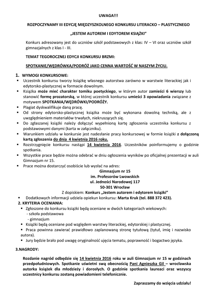 UWAGA!!! ROZPOCZYNAMY III EDYCJĘ MIĘDZYSZKOLNEGO KONKURSU LITERACKO – PLASTYCZNEGO „JESTEM AUTOREM I EDYTOREM KSIĄŻKI” Konkurs adresowany jest do uczniów szkół podstawowych z klas: IV – VI oraz uczniów szkół gimnazjalnych z klas I - III. TEMAT TEGOROCZNEJ EDYCJI KONKURSU BRZMI: SPOTKANIE/WĘDRÓWKA/PODRÓŻ JAKO CENNA WARTOŚĆ W NASZYM ŻYCIU. 1. WYMOGI KONKURSOWE: Uczestnik konkursu tworzy książkę własnego autorstwa zarówno w warstwie literackiej jak i edytorsko-plastycznej w formacie dowolnym. Książka może mieć charakter tomiku poetyckiego, w którym autor zamieści 6 wierszy lub stanowić formę prozatorską, w której uczestnik konkursu umieści 3 opowiadania związane z motywem SPOTKANIA/WĘDRÓWKI/PODRÓŻY. Plagiat dyskwalifikuje daną pracę. Od strony edytorsko-plastycznej książka może być wykonana dowolną techniką, ale z uwzględnieniem materiałów trwałych, niekruszących się. Do zgłaszanej książki należy dołączyć wypełnioną kartę zgłoszenia uczestnika konkursu z podstawowymi danymi (karta w załączniku). Warunkiem udziału w konkursie jest nadesłanie pracy konkursowej w formie książki z dołączoną kartą zgłoszenia do dnia 4 kwietnia 2016 roku. Rozstrzygnięcie konkursu nastąpi 14 kwietnia 2016. Uczestników poinformujemy o godzinie spotkania. Wszystkie prace będzie można odebrać w dniu ogłoszenia wyników po oficjalnej prezentacji w auli Gimnazjum nr 15. Prace można dostarczyć osobiście lub wysłać na adres: Gimnazjum nr 15 im. Profesorów Lwowskich ul. Jedności Narodowej 117 50-301 Wrocław Z dopiskiem: Konkurs „Jestem autorem i edytorem książki” Dodatkowych informacji udziela opiekun konkursu: Marta Kruk (tel. 888 372 423). 2. KRYTERIA OCENIANIA: Zgłoszone do konkursu książki będą oceniane w dwóch kategoriach wiekowych: - szkoła podstawowa - gimnazjum Książki będą oceniane pod względem warstwy literackiej, edytorskiej i plastycznej. Praca powinna zawierać prawidłowo zaplanowaną stronę tytułową (tytuł, imię i nazwisko autora). Jury będzie brało pod uwagę oryginalność ujęcia tematu, poprawność i bogactwo języka. 3.NAGRODY: Rozdanie nagród odbędzie się 14 kwietnia 2016 roku w auli Gimnazjum nr 15 w godzinach przedpołudniowych. Spotkanie uświetni swą obecnością Pani Agnieszka Gil – wrocławska autorka książek dla młodzieży i dorosłych. O godzinie spotkania laureaci oraz wszyscy uczestnicy konkursu zostaną powiadomieni telefonicznie. Zapraszamy do wzięcia udziału! KARTA ZGŁOSZENIA 1. IMIĘ I NAZWISKO UCZESTNIKA KONKURSU: ……………………………………………………………………………………………………………..… ………………………………………………………………………………………………………………… 2. TYTUŁ KSIĄŻKI: ………………………………………………………..…………………………………………………….. 3. NUMER KLASY: ……………………………………………………………………………………………………………… 4. NAZWA SZKOŁY: ……………………………………………………………………………………………….…………….... 5. ADERS SZKOŁY: ……………………………………………..…………….…………………………………………………. ………………………………………………………………………………………………………………… 6. IMIĘ I NAZWISKO OPIEKUNA UCZESTNIKA KONKURSU: ……………………………………………………………………………………………………………….. 7. NUMER TELEFONU OPIEKUNA: ………………..…………………………….…………………………………………………………….… 8. Wyrażam zgodę na przetwarzanie moich danych osobowych dla potrzeb niezbędnych do realizacji postanowień konkursu – zgodnie z Ustawą z dnia 28.08.1997 r. o Ochronie Danych Osobowych (Dz. U. Nr 133 poz. 883). Wyrażam zgodę na ewentualne opublikowanie fragmentów konkursowej książki oraz wyników konkursu na stronie internetowej szkoły i na łamach gazetki szkolnej Gimnazjum nr 15 pt. „Piórem Gimnazjalisty”. – zgodnie z ustawą z dnia 29 sierpnia 1997 r. o Ochronie Danych Osobowych; Dz. U. 2015, nr 2135) PODPIS RODZICA UCZESTNIKA KONKURSU: ……………………………………………………………………………………………………………………….….