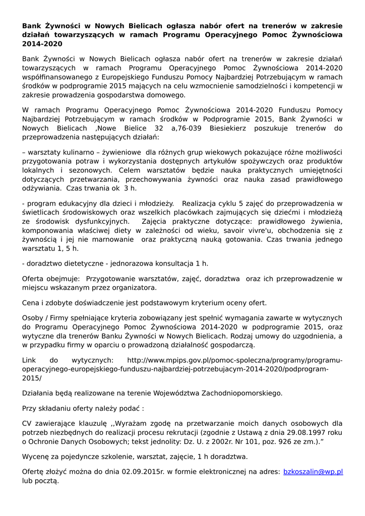 Bank Żywności w Nowych Bielicach ogłasza nabór ofert na trenerów w zakresie działań towarzyszących w ramach Programu Operacyjnego Pomoc Żywnościowa 2014-2020 Bank Żywności w Nowych Bielicach ogłasza nabór ofert na trenerów w zakresie działań towarzyszących w ramach Programu Operacyjnego Pomoc Żywnościowa 2014-2020 współfinansowanego z Europejskiego Funduszu Pomocy Najbardziej Potrzebującym w ramach środków w podprogramie 2015 mających na celu wzmocnienie samodzielności i kompetencji w zakresie prowadzenia gospodarstwa domowego. W ramach Programu Operacyjnego Pomoc Żywnościowa 2014-2020 Funduszu Pomocy Najbardziej Potrzebującym w ramach środków w Podprogramie 2015, Bank Żywności w Nowych Bielicach ,Nowe Bielice 32 a,76-039 Biesiekierz poszukuje trenerów do przeprowadzenia następujących działań: – warsztaty kulinarno – żywieniowe dla różnych grup wiekowych pokazujące różne możliwości przygotowania potraw i wykorzystania dostępnych artykułów spożywczych oraz produktów lokalnych i sezonowych. Celem warsztatów będzie nauka praktycznych umiejętności dotyczących przetwarzania, przechowywania żywności oraz nauka zasad prawidłowego odżywiania. Czas trwania ok 3 h. - program edukacyjny dla dzieci i młodzieży. Realizacja cyklu 5 zajęć do przeprowadzenia w świetlicach środowiskowych oraz wszelkich placówkach zajmujących się dziećmi i młodzieżą ze środowisk dysfunkcyjnych. Zajęcia praktyczne dotyczące: prawidłowego żywienia, komponowania właściwej diety w zależności od wieku, savoir vivre'u, obchodzenia się z żywnością i jej nie marnowanie oraz praktyczną nauką gotowania. Czas trwania jednego warsztatu 1, 5 h. - doradztwo dietetyczne - jednorazowa konsultacja 1 h. Oferta obejmuje: Przygotowanie warsztatów, zajęć, doradztwa oraz ich przeprowadzenie w miejscu wskazanym przez organizatora. Cena i zdobyte doświadczenie jest podstawowym kryterium oceny ofert. Osoby / Firmy spełniające kryteria zobowiązany jest spełnić wymagania zawarte w wytycznych do Programu Operacyjnego Pomoc Żywnościowa 2014-2020 w podprogramie 2015, oraz wytyczne dla trenerów Banku Żywności w Nowych Bielicach. Rodzaj umowy do uzgodnienia, a w przypadku firmy w oparciu o prowadzoną działalność gospodarczą. Link do wytycznych: http://www.mpips.gov.pl/pomoc-spoleczna/programy/programuoperacyjnego-europejskiego-funduszu-najbardziej-potrzebujacym-2014-2020/podprogram2015/ Działania będą realizowane na terenie Województwa Zachodniopomorskiego. Przy składaniu oferty należy podać : CV zawierające klauzulę ,,Wyrażam zgodę na przetwarzanie moich danych osobowych dla potrzeb niezbędnych do realizacji procesu rekrutacji (zgodnie z Ustawą z dnia 29.08.1997 roku o Ochronie Danych Osobowych; tekst jednolity: Dz. U. z 2002r. Nr 101, poz. 926 ze zm.).” Wycenę za pojedyncze szkolenie, warsztat, zajęcie, 1 h doradztwa. Ofertę złożyć można do dnia 02.09.2015r. w formie elektronicznej na adres: [email protected] lub pocztą.