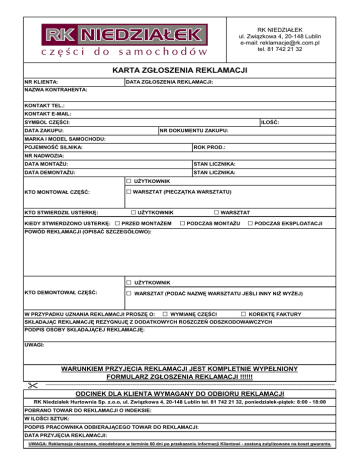 RK NIEDZIAŁEK ul. Związkowa 4, 20-148 Lublin e-mail: [email protected] tel. 81 742 21 32 KARTA ZGŁOSZENIA REKLAMACJI NR KLIENTA: DATA ZGŁOSZENIA REKLAMACJI: NAZWA KONTRAHENTA: KONTAKT TEL.: KONTAKT E-MAIL: SYMBOL CZĘŚCI: ILOŚĆ: DATA ZAKUPU: NR DOKUMENTU ZAKUPU: MARKA I MODEL SAMOCHODU: POJEMNOŚĆ SILNIKA: ROK PROD.: NR NADWOZIA: DATA MONTAŻU: STAN LICZNIKA: DATA DEMONTAŻU: STAN LICZNIKA: KTO MONTOWAŁ CZĘŚĆ: KTO STWIERDZIŁ USTERKĘ: KIEDY STWIERDZONO USTERKĘ: □ UŻYTKOWNIK □ WARSZTAT (PIECZĄTKA WARSZTATU) □ UŻYTKOWNIK □ PRZED MONTAŻEM □ WARSZTAT □ PODCZAS MONTAŻU □ PODCZAS EKSPLOATACJI POWÓD REKLAMACJI (OPISAĆ SZCZEGÓŁOWO): KTO DEMONTOWAŁ CZĘŚĆ: □ □ UŻYTKOWNIK WARSZTAT (PODAĆ NAZWĘ WARSZTATU JEŚLI INNY NIŻ WYŻEJ) W PRZYPADKU UZNANIA REKLAMACJI PROSZĘ O: □ WYMIANĘ CZĘŚCI □ KOREKTĘ FAKTURY SKŁADAJĄC REKLAMACJĘ REZYGNUJĘ Z DODATKOWYCH ROSZCZEŃ ODSZKODOWAWCZYCH PODPIS OSOBY SKŁADAJĄCEJ REKLAMACJĘ: UWAGI: WARUNKIEM PRZYJĘCIA REKLAMACJI JEST KOMPLETNIE WYPEŁNIONY FORMULARZ ZGŁOSZENIA REKLAMACJI !!!!!! O---------------------------------------------------------------------------------------------------------------------------------------------------------------------- ODCINEK DLA KLIENTA WYMAGANY DO ODBIORU REKLAMACJI RK Niedziałek Hurtownia Sp. z.o.o, ul. Związkowa 4, 20-148 Lublin tel. 81 742 21 32, poniedziałek-piątek: 8:00 - 18:00 POBRANO TOWAR DO REKLAMACJI O INDEKSIE: W ILOŚCI SZTUK: PODPIS PRACOWNIKA ODBIERAJĄCEGO TOWAR DO REKLAMACJI: DATA PRZYJĘCIA REKLAMACJI: UWAGA: Reklamacje nieuznane, nieodebrane w terminie 60 dni po przekazaniu informacji Klientowi - zostaną zutylizowane na koszt gwaranta.