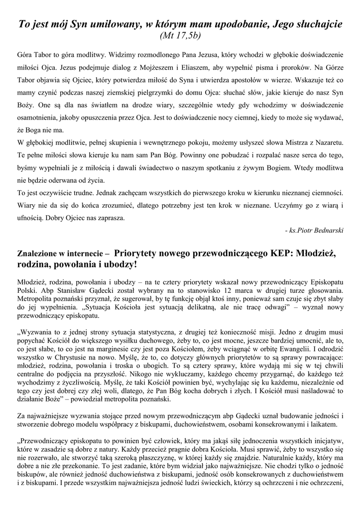 To jest mój Syn umiłowany, w którym mam upodobanie, Jego słuchajcie (Mt 17,5b) Góra Tabor to góra modlitwy. Widzimy rozmodlonego Pana Jezusa, który wchodzi w głębokie doświadczenie miłości Ojca. Jezus podejmuje dialog z Mojżeszem i Eliaszem, aby wypełnić pisma i proroków. Na Górze Tabor objawia się Ojciec, który potwierdza miłość do Syna i utwierdza apostołów w wierze. Wskazuje też co mamy czynić podczas naszej ziemskiej pielgrzymki do domu Ojca: słuchać słów, jakie kieruje do nasz Syn Boży. One są dla nas światłem na drodze wiary, szczególnie wtedy gdy wchodzimy w doświadczenie osamotnienia, jakoby opuszczenia przez Ojca. Jest to doświadczenie nocy ciemnej, kiedy to może się wydawać, że Boga nie ma. W głębokiej modlitwie, pełnej skupienia i wewnętrznego pokoju, możemy usłyszeć słowa Mistrza z Nazaretu. Te pełne miłości słowa kieruje ku nam sam Pan Bóg. Powinny one pobudzać i rozpalać nasze serca do tego, byśmy wypełniali je z miłością i dawali świadectwo o naszym spotkaniu z żywym Bogiem. Wtedy modlitwa nie będzie oderwana od życia. To jest oczywiście trudne. Jednak zachęcam wszystkich do pierwszego kroku w kierunku nieznanej ciemności. Wiary nie da się do końca zrozumieć, dlatego potrzebny jest ten krok w nieznane. Uczyńmy go z wiarą i ufnością. Dobry Ojciec nas zaprasza. - ks.Piotr Bednarski Znalezione w internecie – Priorytety nowego przewodniczącego KEP: Młodzież, rodzina, powołania i ubodzy! Młodzież, rodzina, powołania i ubodzy – na te cztery priorytety wskazał nowy przewodniczący Episkopatu Polski. Abp Stanisław Gądecki został wybrany na to stanowisko 12 marca w drugiej turze głosowania. Metropolita poznański przyznał, że sugerował, by tę funkcję objął ktoś inny, ponieważ sam czuje się zbyt słaby do jej wypełnienia. „Sytuacja Kościoła jest sytuacją delikatną, ale nie tracę odwagi” – wyznał nowy przewodniczący episkopatu. „Wyzwania to z jednej strony sytuacja statystyczna, z drugiej też konieczność misji. Jedno z drugim musi popychać Kościół do większego wysiłku duchowego, żeby to, co jest mocne, jeszcze bardziej umocnić, ale to, co jest słabe, to co jest na marginesie czy jest poza Kościołem, żeby wciągnąć w orbitę Ewangelii. I odrodzić wszystko w Chrystusie na nowo. Myślę, że to, co dotyczy głównych priorytetów to są sprawy powracające: młodzież, rodzina, powołania i troska o ubogich. To są cztery sprawy, które wydają mi się w tej chwili centralne do podjęcia na przyszłość. Nikogo nie wykluczamy, każdego chcemy przygarnąć, do każdego też wychodzimy z życzliwością. Myślę, że taki Kościół powinien być, wychylając się ku każdemu, niezależnie od tego czy jest dobrej czy złej woli, dlatego, że Pan Bóg kocha dobrych i złych. I Kościół musi naśladować to działanie Boże” – powiedział metropolita poznański. Za najważniejsze wyzwania stojące przed nowym przewodniczącym abp Gądecki uznał budowanie jedności i stworzenie dobrego modelu współpracy z biskupami, duchowieństwem, osobami konsekrowanymi i laikatem. „Przewodniczący episkopatu to powinien być człowiek, który ma jakąś siłę jednoczenia wszystkich inicjatyw, które w zasadzie są dobre z natury. Każdy przecież pragnie dobra Kościoła. Musi sprawić, żeby to wszystko się nie rozerwało, ale stworzyć taką szeroką płaszczyznę, w której każdy się znajdzie. Naturalnie każdy, który ma dobre a nie złe przekonanie. To jest zadanie, które bym widział jako najważniejsze. Nie chodzi tylko o jedność biskupów, ale również jedność duchowieństwa z biskupami, jedność osób konsekrowanych z duchowieństwem i z biskupami. I przede wszystkim najważniejsza jedność ludzi świeckich, którzy są ochrzczeni i nie ochrzczeni, ale stanowią przecież przeważającą większość. Dlatego też należy się im większe docenienie ich roli. Bo przecież ostatecznie consecratio mundi dokonuje się nie tylko w przestrzeni liturgii. Ona się dokonuje właśnie poza liturgią, czyli praktycznie tam, gdzie ludzie świeccy pracują, żyją i umierają. Tam wszędzie jest miejsce na to, żeby skierować świat ku Chrystusowi. I na większą chwałę Bożą! Żeby to wszystko, co jest dokonywane w przestrzeni publicznej, było zgodne z zamysłem Ewangelii” – powiedział hierarcha. Abp Gądecki podziękował też abp. Józefowi Michalikowi, z którym przez minione 10 lat współpracował jako wiceprzewodniczący KEP. sm/Radio Watykańskie 13.03.2014, 8:57 http://www.fronda.pl/a/priorytety-nowego-przewodniczacego-kep-mlodziez-rodzina-powolania-iubodzy,35375.html Ogłoszenia duszpasterskie W minionym tygodniu zmarł śp. Julian Wischik z ul.Wieczorynki – wieczny odpoczynek racz Mu dać, Panie… - Mszę Świętą pogrzebowa sprawowaliśmy w miniony piątek. 1. Msze Święte w niedzielę: o 8:00, 9:30, 11:00, 12:30, 14:00 (dzisiaj i przez cały Wielki Post) oraz o 18.00; od poniedziałku do piątku o 18:00 i 19:00 (w piątek ok.19:10), w sobotę o 7:30 i 18:00. Msze Święte w dni powszednie (z wyjątkiem piątku) odprawiane są w bocznej kaplicy; okazja do spowiedzi świętej w kościele 15 minut przede Mszą Świętą. 2. Biuro parafialne w tym tygodniu będzie czynne tylko we wtorek (od 16:00 do 17:30). 3. W Wielkim Poście zapraszamy do modlitwy na drodze krzyżowej – o 9:00 i o 18:30 dla dorosłych, o 17:00 dla młodzieży i dzieci. W niedzielę zapraszamy do rozważania Męki Pana Jezusa w Gorzkich Żalach – nabożeństwo odprawiane jest w naszym kościele w niedziele o 14:45 (po Mszy Świętej o 14:00), kazania pasyjne głosi Ksiądz Profesor Janusz Nawrot z Wydziału Teologicznego UAM. 4. W piątek zakończyliśmy rekolekcje w naszej szkole podstawowej – dziękujemy Ks.Stanisławowi Krzymińskiemu oraz Siostrom Nazaretankom z młodzieżą KSM-u za ich poprowadzenie, nauczycielom za opiekę, rodzicom za troskę o d