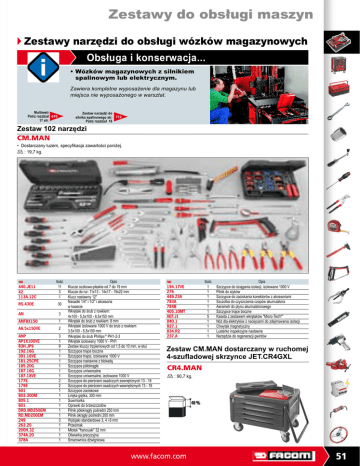Zestawy do obsługi maszyn u Zestawy narzędzi do obsługi wózków magazynowych Obsługa i konserwacja... •W ózków magazynowych z silnikiem spalinowym lub elektrycznym. Zawiera kompletne wyposażenie dla magazynu lub miejsca nie wyposażonego w warsztat. Multimetr Patrz rozdział 670 17 str. Zestaw narzędzi do silnika spalinowego str. 712 Patrz rozdział 18 Zestaw 102 narzędzi CM.MAN • Dostarczany luzem, specyfikacja zawartości poniżej. D : 19,7 kg. F 440.JE11 42 113A.12C Ilość 11 3 1 RS.430E 30 AN 3 ANF8X150 1 A6,5x150VE 2 ANP AP1X100VE 83H.JP9 192.16G 391.16VE 181.25CPE 185.20G 187.16G 187.18VE 177E 179E 501 803.300M 805.1 601 DRD.MD250EM RD.MD200EM 249 263.20 200H.32 374A.20 378A 3 1 9 1 1 1 1 1 1 2 2 1 1 1 1 1 1 3 1 1 1 1 Opis Klucze oczkowo-płaskie od 7 do 19 mm Klucze do rur: 11x13 - 14x17 - 19x22 mm Klucz nastawny 12" Nasadki 1/4" i 1/2" i akcesoria w kasecie Wkrętaki do śrub z rowkiem: 4x100 - 5,5x100 - 6,5x150 mm Wkrętak do śrub z rowkiem: 8 mm Wkrętaki izolowane 1000 V do śrub z rowkiem 3,5x100 - 5,5x150 mm Wkrętaki do śrub PhillipsJ PH1-2-3 Wkrętak izolowany 1000 V - PH1 Zestaw kluczy trzpieniowych od 1,5 do 10 mm, w etui Szczypce tnące boczne Szczypce tnące, izolowane 1000 V Szczypce nastawne z blokadą Szczypce półokrągłe Szczypce uniwersalne Szczypce uniwersalne, izolowane 1000 V Szczypce do pierścieni osadczych zewnętrznych 13 - 18 Szczypce do pierścieni osadczych wewnętrznych 13 - 18 Szczypce zaciskowe Linijka giętka, 300 mm Suwmiarka Oprawki do brzeszczotów Pilnik półokrągły pośredni 250 mm Pilnik okrągły pośredni 200 mm Wybijaki standardowe 3, 4 i 6 mm Przecinak Młotek "francuski" 32 mm Oliwiarka precyzyjna Smarownica dźwigniowa F 194.17VE 276 449.Z3A 783A 784B 405.10MT AEF.J1 840.1 827.1 834.R2 237.A Ilość 1 1 1 1 1 1 5 1 1 1 1 Opis Szczypce do ściągania izolacji, izolowane 1000 V Pilnik do styków Szczypce do zaciskania konektorów z akcesoriami Szczotka do czyszczenia czopów akumulatora Aerometr do płynu akumulatorowego Szczypce tnące boczne Kaseta z zestawem wkrętaków "Micro-Tech®" Nóż dla elektryków z nacięciami do zdejmowania izolacji Chwytak magnetyczny Lusterko inspekcyjne nastawne Narzędzie do regeneracji gwintów Zestaw CM.MAN dostarczany w ruchomej 4-szufladowej skrzynce JET.CR4GXL CR4.MAN D : 90,7 kg. www.facom.com 51