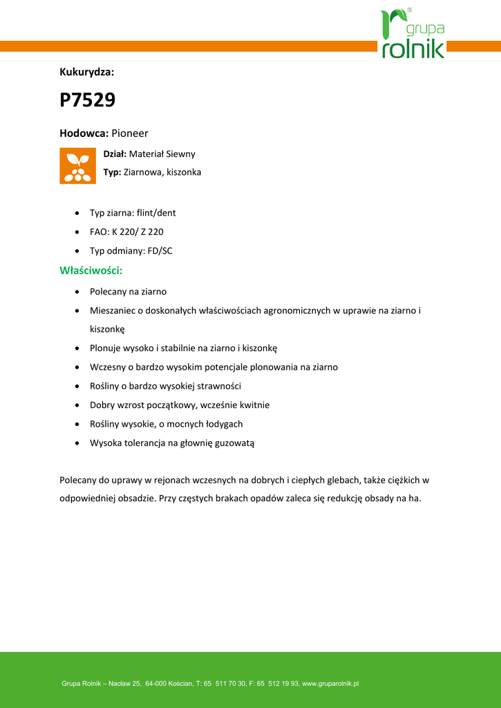 Kukurydza: P7529 Hodowca: Pioneer Dział: Materiał Siewny Typ: Ziarnowa, kiszonka Typ ziarna: flint/dent FAO: K 220/ Z 220 Typ odmiany: FD/SC Właściwości: Polecany na ziarno Mieszaniec o doskonałych właściwościach agronomicznych w uprawie na ziarno i kiszonkę Plonuje wysoko i stabilnie na ziarno i kiszonkę Wczesny o bardzo wysokim potencjale plonowania na ziarno Rośliny o bardzo wysokiej strawności Dobry wzrost początkowy, wcześnie kwitnie Rośliny wysokie, o mocnych łodygach Wysoka tolerancja na głownię guzowatą Polecany do uprawy w rejonach wczesnych na dobrych i ciepłych glebach, także ciężkich w odpowiedniej obsadzie. Przy częstych brakach opadów zaleca się redukcję obsady na ha. Grupa Rolnik – Nacław 25, 64-000 Kościan, T: 65 511 70 30, F: 65 512 19 93, www.gruparolnik.pl Profil agronomiczny – ocena Pioneer`a Wzrost początkowy Bardzo dobry Tolerancja na suszę Dobra Dojrzewanie roślin (stay green) Dobre Dojrzewanie kolb (dry-down) Dobre Polecane stanowisko glebowe: Optymalna gęstość wysiewu: Warunki wzrostu Słabe Normalne Korzystne Kiszonka 75 85 90 Ziarno 70 85 90 Źródło: Katalog produktowy Pioneer® Grupa Rolnik – Nacław 25, 64-000 Kościan, T: 65 511 70 30, F: 65 512 19 93, www.gruparolnik.pl