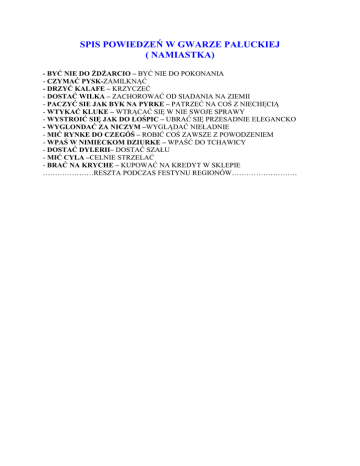 SPIS POWIEDZEŃ W GWARZE PAŁUCKIEJ ( NAMIASTKA) - BYĆ NIE DO ŻDŻARCIO – BYĆ NIE DO POKONANIA - CZYMAĆ PYSK-ZAMILKNĄĆ - DRZYĆ KALAFE – KRZYCZEĆ - DOSTAĆ WILKA – ZACHOROWAĆ OD SIADANIA NA ZIEMII - PACZYĆ SIE JAK BYK NA PYRKE – PATRZEĆ NA COŚ Z NIECHĘCIĄ - WTYKAĆ KLUKE – WTRĄCAĆ SIĘ W NIE SWOJE SPRAWY - WYSTROIĆ SIĘ JAK DO ŁOŚPIC – UBRAĆ SIĘ PRZESADNIE ELEGANCKO - WYGLONDAĆ ZA NICZYM –WYGLĄDAĆ NIEŁADNIE - MIĆ RYNKE DO CZEGÓŚ – ROBIĆ COŚ ZAWSZE Z POWODZENIEM - WPAŚ W NIMIECKOM DZIURKE – WPAŚĆ DO TCHAWICY - DOSTAĆ DYLERII– DOSTAĆ SZAŁU - MIĆ CYLA –CELNIE STRZELAĆ - BRAĆ NA KRYCHE – KUPOWAĆ NA KREDYT W SKLEPIE …………………RESZTA PODCZAS FESTYNU REGIONÓW………………………