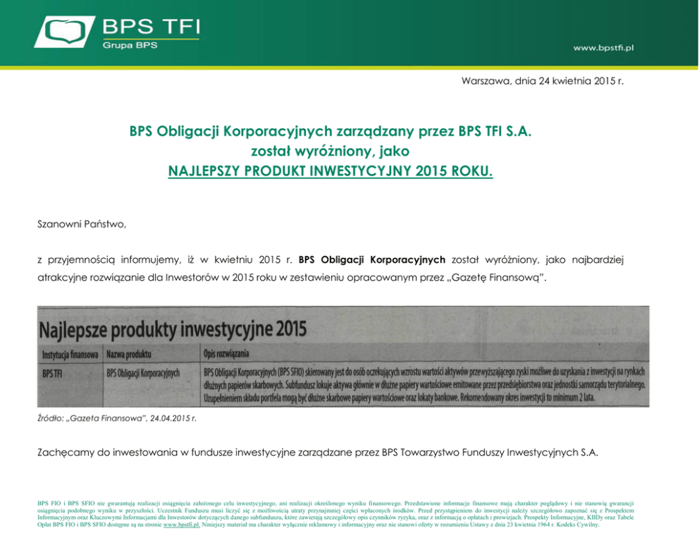 Warszawa, dnia 24 kwietnia 2015 r. BPS Obligacji Korporacyjnych zarządzany przez BPS TFI S.A. został wyróżniony, jako NAJLEPSZY PRODUKT INWESTYCYJNY 2015 ROKU. Szanowni Państwo, z przyjemnością informujemy, iż w kwietniu 2015 r. BPS Obligacji Korporacyjnych został wyróżniony, jako najbardziej atrakcyjne rozwiązanie dla Inwestorów w 2015 roku w zestawieniu opracowanym przez „Gazetę Finansową”. Źródło: „Gazeta Finansowa”, 24.04.2015 r. Zachęcamy do inwestowania w fundusze inwestycyjne zarządzane przez BPS Towarzystwo Funduszy Inwestycyjnych S.A. BPS FIO i BPS SFIO nie gwarantują realizacji osiągnięcia założonego celu inwestycyjnego, ani realizacji określonego wyniku finansowego. Przedstawione informacje finansowe mają charakter poglądowy i nie stanowią gwarancji osiągnięcia podobnego wyniku w przyszłości. Uczestnik Funduszu musi liczyć się z możliwością utraty przynajmniej części wpłaconych środków. Przed przystąpieniem do inwestycji należy szczegółowo zapoznać się z Prospektem Informacyjnym oraz Kluczowymi Informacjami dla Inwestorów dotyczących danego subfunduszu, które zawierają szczegółowy opis czynników ryzyka, oraz z informacją o opłatach i prowizjach. Prospekty Informacyjne, KIIDy oraz Tabele Opłat BPS FIO i BPS SFIO dostępne są na stronie www.bpstfi.pl. Niniejszy materiał ma charakter wyłącznie reklamowy i informacyjny oraz nie stanowi oferty w rozumieniu Ustawy z dnia 23 kwietnia 1964 r. Kodeks Cywilny.