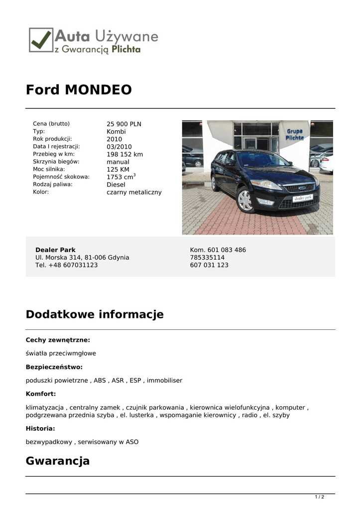 Ford MONDEO Cena (brutto) Typ: Rok produkcji: Data I rejestracji: Przebieg w km: Skrzynia biegów: Moc silnika: Pojemność skokowa: Rodzaj paliwa: Kolor: 25 900 PLN Kombi 2010 03/2010 198 152 km manual 125 KM 1753 cm3 Diesel czarny metaliczny Dealer Park Ul. Morska 314, 81-006 Gdynia Tel. +48 607031123 Kom. 601 083 486 785335114 607 031 123 Dodatkowe informacje Cechy zewnętrzne: światła przeciwmgłowe Bezpieczeństwo: poduszki powietrzne , ABS , ASR , ESP , immobiliser Komfort: klimatyzacja , centralny zamek , czujnik parkowania , kierownica wielofunkcyjna , komputer , podgrzewana przednia szyba , el. lusterka , wspomaganie kierownicy , radio , el. szyby Historia: bezwypadkowy , serwisowany w ASO Gwarancja 1/2 Szanowni Państwo, Pragniemy Państwa poinformować, iż firma Plichta – Autoryzowany Dealer Škoda Auto prowadzi skup oraz sprzedaż samochodów używanych wszystkich marek, oferując także samochody używane z gwarancją objęte programem „Auta używane z Gwarancją Plichta”. W ramach programu „Auta Używane z Gwarancją Plichta ” każdy Klient otrzymuje atrakcyjny pakiet zniżek pozwalający zoptymalizować koszty eksploatacji samochodu: -50% na serwis klimatyzacji -50% na ustawienie zbieżności -50% na kosmetykę auta -50% na ścieżkę diagnostyczną -25% na wymiany oleju -25% na zakup opon + 5zł na sezon za hotelowanie opon -15% na części i akcesoria Oferujemy również kompleksową obsługę w zakresie finansowania i ubezpieczenia: - kredyty już od 4,99% - leasingi i kredyty bez zaświadczeń - uproszczone procedury – decyzja już od 30 min. - atrakcyjne pakiety AC/OC/NW/ASS wiodących firm ubezpieczeniowych Możliwość pozostawienia dotychczas użytkowanego auta w rozliczeniu – BEZPŁATNA WYCENA!!! Zapraszamy wszystkich Klientów na jazdę próbną wybranym autem. Numer oferty: F122 Informacja nie stanowi oferty w rozumieniu art. 66 KC. Podane dane mają charakter wyłącznie informacyjny. 2/2 Powered by TCPDF (www.tcpdf.org)