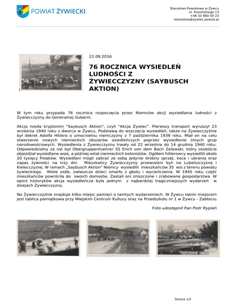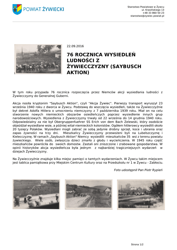 Starostwo Powiatowe w Żywcu ul. Krasińskiego 13 +48 33 860 50 23 [email protected] 22.09.2016 76 ROCZNICA WYSIEDLEŃ LUDNOŚCI Z ŻYWIECCZYZNY (SAYBUSCH AKTION) W tym roku przypada 76 rocznica rozpoczęcia przez Niemców akcji wysiedlania ludności z Żywiecczyzny do Generalnej Guberni. Akcja nosiła kryptonim "Saybusch Aktion", czyli "Akcja Żywiec". Pierwszy transport wyruszył 23 września 1940 roku z dworca w Żywcu. Podstawą do wszczęcia wysiedleń, także na Żywiecczyźnie był dekret Adolfa Hitlera o umocnieniu niemczyzny z 7 października 1939 roku. Miał on na celu stworzenie nowych niemieckich obszarów osiedleńczych poprzez wysiedlenie innych grup narodowościowych. Wysiedlenia z Żywiecczyzny trwały od 22 września do 14 grudnia 1940 roku. Odpowiedzialny za nie był Obergruppenfuehrer SS Erich von dem Bach Zelewski, który osobiście objeżdżał wysiedlane wsie, a później witał niemieckich kolonistów. Ogółem hitlerowcy wysiedlili około 20 tysięcy Polaków. Wysiedlani mogli zabrać ze sobą jedynie drobny sprzęt, koce i ubrania oraz zapas żywności na trzy dni. Mieszkańcy Żywiecczyzny przewożeni byli na Lubelszczyznę i Kielecczyznę. W ramach „Saybusch Aktion" Niemcy wysiedlili mieszkańców 35 wsi z terenu powiatu żywieckiego. Wiele osób, zwłaszcza dzieci zmarło z głodu i wycieńczenia. W 1945 roku część mieszkańców powróciła do swoich domostw. Zastali oni zniszczone i zrabowane gospodarstwa. W opinii historyków akcja wysiedleńcza była jednym z najbardziej tragiczniejszych wydarzeń w dziejach Żywiecczyzny. Na Żywiecczyźnie znajduje kilka miejsc pamięci o tamtych wydarzeniach. W Żywcu takim miejscem jest tablica pamiątkowa przy Miejskim Centrum Kultury oraz na Przedszkolu nr 1 w Żywcu - Zabłociu. Foto udostępnił Pan Piotr Rypień Strona 1/2 Starostwo Powiatowe w Żywcu ul. Krasińskiego 13 +48 33 860 50 23 [email protected] Strona 2/2 Powered by TCPDF (www.tcpdf.org)