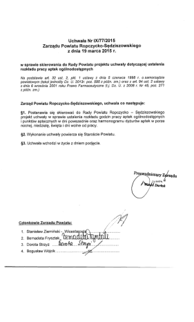 Uchwata Nr IN7712015 Zarzqdu Powiatu RopczyckoS~dziszowskiego z dnia 19 marca 2015 r. w sprawie skierowania do Rady Powiatu projektu uchwaly dotyczqcej ustalenia rozkiadu pracy aptek ogolnodostqpnych Na podstawie art. 32 usf. 2, pM. 1 ustawy z dnia 5 czenvca 1998 r. o samorzqdzie powiatowym (tekst jednolity Dz. U.2013r. poz. 595 z poin. zm.) oraz z art. 94 ust. 2 ustawy z dnia 6 wrzeSnia 2001 roku Prawo Farmaceutyczne (t.j. Dz. U. z 2008 r. Nr 45, poz. 271 z poin. zm.) Zarzqd Powiatu Ropczycko-Sqdziszowskiego, uchwala co nastqpuje: 91. Postanawia siq skierowac do Rady Powiatu Ropczycko - Sqdziszowskiego projekt uchwaty w sprawie ustalenia rozkladu godzin pracy aptek ogolnodostqpnych i punktow aptecznych w dni powszednie oraz harmonogramu dyzurow aptek w porze nocnej, niedzielq, swiqta i dni wolne od pracy. 92. Wykonanie uchwaty powierza siq Staroscie Powiatu. 93. Uchwala wchodzi w zycie z dniem podjqcia. Czlonkowie Zarzqdu Powiatu: ,I , ' 1. Stanistaw Ziemiriski - Wicesta ........... 2. Bernadeta Frysztak, .......... 3. Dorota Strzyi ...... 9x3 .... ............... -fE' 4. Boguslaw Wojcik ........................... .......................... Uchwata Nr ......I.........12015 Rady Powiatu Ropczycko-Sqdziszowskiego z dnia ..................2015 r. w sprawie: ustalenia rozkladu godzin pracy aptek og6lnodostqpnych Projekt . Na podstawie art. 12 pkt. 11, art. 40, art. 42 ustawy z dnia 5 czenvca 1998 r. o samorzqdzie powiatowym (tekstjednolity Dz. U. 2013 r. poz. 595 z pdf niejszymi zmianami), oraz art. 94 ust 2, ustawy z dnia 6 wrze8nia 2001 roku Prawo Farmaceutyczne (t.j. Dz. U.z 2008 r. Nr 45, poz. 271 z pdf n. zm., po zasiqgniqciu opinii: Burmistrza Ropczyc, Burmistrza Sqdziszowa Mafopolskiego, Wdjta Gminy Ostrbw, Wdjta Gminy Wielopole Skrzyhskie, Wdjta Gminy Iwienyce oraz Okrqgowej Izby Aptekarskiej w Rzeszowie Rada Powiatu Ropczycko-Sqdziszowskiego, uchwala co nastqpuje: 91. Ustala sie rozklad godzin pracy aptek ogolnodostepnych i punktow aptecznych w dni powszednie oraz harmonogram dyzurow aptek w porze nocnej, niedzielq, swieta i dni wolne od pracy na 2015 r. 92. 1. Szczeg6towy rozklad godzin pracy aptek ogolnodostepnych i punktow aptecznych w dni powszednie okreSla zalqcznik Nr 1 do niniejszej uchwaly. 2. Harmonogram dyiur6w calodobowych aptek w Ropczycach i Sedziszowie Mlp. okresla zalqcznik Nr 2 do niniejszej uchwaty. 93. Traci moc Uchwala Nr 111/23/2015 Rady Powiatu Ropczycko-Sedziszowskiego z dnia 29 stycznia 2015 r. w sprawie ustalenia rozkladu godzin pracy aptek og6lnodostepnych na 2015 r. 94. Wykonanie uchwaly powierza sie Zarzqdowi Powiatu. 95. Uchwala podlega Podkarpackiego. ogloszeniu w Dzienniku Urzedowym Wojewodztwa 96. Uchwala wchodzi w iycie po uplywie 14 dni od dnia opublikowania w Dzienniku Urzedowym Wojewodztwa Podkarpackiego. Zalqcznik Nr 1 do Uchwaly ...................... Rady Powiatu Ropczycko-Sgdziszowskiego z dnia ...................... .... WYKAZ APTEK I PUNKTOW APTECZNYCH W POWIECIE ROPCZYCKO-SEDZISZOWSKIM Apteki prywatne lmig i Nazwisko kierownika ,,SINAPIS1'S.C. Apteka Prywatna Iza Aleksandrowicz-Gorczyca, Andrzej Gorczyca ul. WyszyrSskiego 54a, 39-100 Ropczyce tel. 01 7 22 28 880 Apteka Prywatna rngr farm. Matgorzata Rzegocka ul. WyszyrSskiego 45, 39-100 Ropczyce tel. 017 22 18 183 Apteka Mediq ul. Grunwaldzka 1, 39-1 00 Ropczyce tel. 01 7 22 18 248 rngr farm. Iza Aleksandrowicz-Gorczyca F.H.U.R.J. Kizior ,,Apteka w Rynku" sp6tka jawna Apteka na Grunwaldzkiej ul. Grunwaldzka 9, 39-1 00 Ropczyce tel. 017 22 10 070 Apteka Prywatna rngr farm. Danuta Sochacka Sp. z 0.0. ul. Kosciuszki 18A 39-120 Sqdzisz6w Mtp. tel. 017 22 16 536, 017 22 26 732 Apteka Prywatna ,,Pod Ortem" ul. Jana Pawta 11 34 39-120 Sqdzisz6w Mtp. tel. 017 22 16 209,017 22 16 013 Apteka Prywatna ,,Pod Ratuszem" ul. Rynek 26, 39-120 Sqdzisz6w Mtp. tel. 017 22 16 643 Apteka Sw.Franciszka ul. Jana Pawta 11 56 39-120 Sqdzisz6w Mtp. tel. 017 22 26 718 Godziny pracy Poniedziatek-Piqtek Sobota - 745-21O0 - goo-140° dyiur wedtug harmonogramu rngr farm. Urszula Siuta Poniedziatek-Piqtek - 7m-21m Sobota - goo-?900 Niedziela - loo0-180° dyiur wedtug harmonogramu rngr farm. Jolanta LenardSlusarczyk - 8°u-2000 Poniedziatek-Piqtek Sobota - 8''-1 60° Niedziela - goo-150° dyiur wedtug harmonogramu mgr farm. Rafat Noszczyk Poniedziatek-Piqtek Sobota - 7'' - 19'' - 8O0- 14'' dytur wedtug harmonogramu rngr farm. Danuta Sochacka Poniedziatek-Piqtek Sobota - 7"-21" - 730-180° dytur wedtug harmonogramu mgr farm. lrena SzymarSska rngr farm. Agnieszka Ochat rngr farm. Maria Terpitowska Poniedziatek-Piqtek Sobota 0 0 - 73u-20 - 80°-150° dytur wedlug harmonogramu - 730-19'' Poniedziatek-Piqtek Sobota - 730-150° Niedziela - BOO-1330 dytur wedtug harmonogramu - 7'' -20" Poniedziatek-Piqtek Sobota 80°-170° Niedziela - goo-140° dytur wedtug harmonogramu - 4pteka im. ,,Sw. Ojca Pio" Zenon Malski JI. Rynek 6, 39-120 Sqdzisz6w Mlp. tel. 017 22 26 947,017 22 26 948 Apteka Prywatna ,,VITAFARMU Pawel Grabowski ul. 3-Maja 29, 39-120 Sqdzisz6w Mlp. tel. 017 22 16 272 Apteka Prywatna ,,PRO-ME" Krzysztof PaSko ul. K.K. Wielkiego 6A 39-100 Ropczyce tel. 017 22 17 313 Apteka Prywatna rngr farm. Wieslawa Go5 39-124 lwierzyce 81 tel. 017 22 21 088 Apteka ,,Remedium" sc Lidia i Andrzej Kaimierczak, 39-103 Ostr6w 226, tel. 017 74 51 226 Apteka Prywatna S.C. rngr farm. Urszula Siuta rngr farm. Malgorzata Rzegocka 39-110 Wielopole Skrzyhskie 260 tel. 017 22 14 245 Apteka Prywatna Gratyna Niziolek 39-102 Lubzina 117a tel. 017 22 12 554 Punkt Apteczny Anna Zarszyhska 39-110 Wielopole Skrzyhskie 206 tel. 0 505 053 664 Punkt Apteczny S.C.KuCma G i Sp6tka 39-110 Wielopole Skrzyhskie 229 tel. 017 22 20 707 Prywatny Punkt Apteczny Marta Kusza 39- 107 Niediwiada 10 tel. 017 22 13 517 Prywatny Punkt Apteczny Zagorzyce 39-126 Zagorzyce 367 tel. 017 74 52 800 Firma Handlowa Punkt Apteczny Alicja W6jcik 39-122 Kamionka 219 tel. 017 85 79 898, 0 885 223 691 - 2oJ0 mgr farm. Aneta Korzeniowska- Poniedzialek-Piqtek - 7'' Sobota 7O0- 1g30 Wszdek