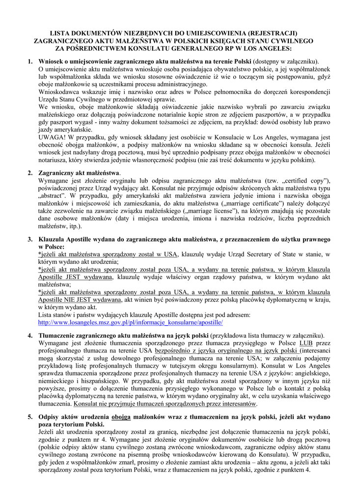 LISTA DOKUMENTÓW NIEZBĘDNYCH DO UMIEJSCOWIENIA (REJESTRACJI) ZAGRANICZNEGO AKTU MAŁŻEŃSTWA W POLSKICH KSIĘGACH STANU CYWILNEGO ZA POŚREDNICTWEM KONSULATU GENERALNEGO RP W LOS ANGELES: 1. Wniosek o umiejscowienie zagranicznego aktu małżeństwa na terenie Polski (dostępny w załączniku). O umiejscowienie aktu małżeństwa wnioskuje osoba posiadająca obywatelstwo polskie, a jej współmałżonek lub współmałżonka składa we wniosku stosowne oświadczenie iż wie o toczącym się postępowaniu, gdyż oboje małżonkowie są uczestnikami procesu administracyjnego. Wnioskodawca wskazuje imię i nazwisko oraz adres w Polsce pełnomocnika do doręczeń korespondencji Urzędu Stanu Cywilnego w przedmiotowej sprawie. We wniosku, oboje małżonkowie składają oświadczenie jakie nazwisko wybrali po zawarciu związku małżeńskiego oraz dołączają poświadczone notarialnie kopie stron ze zdjęciem paszportów, a w przypadku gdy paszport wygasł - inny ważny dokument tożsamości ze zdjęciem, na przykład: dowód osobisty lub prawo jazdy amerykańskie. UWAGA! W przypadku, gdy wniosek składany jest osobiście w Konsulacie w Los Angeles, wymagana jest obecność obojga małżonków, a podpisy małżonków na wniosku składane są w obecności konsula. Jeżeli wniosek jest nadsyłany drogą pocztową, musi być uprzednio podpisany przez obojga małżonków w obecności notariusza, który stwierdza jedynie własnoręczność podpisu (nie zaś treść dokumentu w języku polskim). 2. Zagraniczny akt małżeństwa. Wymagane jest złożenie oryginału lub odpisu zagranicznego aktu małżeństwa (tzw. „certified copy”), poświadczonej przez Urząd wydający akt. Konsulat nie przyjmuje odpisów skróconych aktu małżeństwa typu „abstract”. W przypadku, gdy amerykański akt małżeństwa zawiera jedynie imiona i nazwiska obojga małżonków i miejscowość ich zamieszkania, do aktu małżeństwa („marriage certificate”) należy dołączyć także zezwolenie na zawarcie związku małżeńskiego („marriage license”), na którym znajdują się pozostałe dane osobowe małżonków (daty i miejsca urodzenia, imiona i nazwiska rodziców, liczba poprzednich małżeństw, itp.). 3. Klauzula Apostille wydana do zagranicznego aktu małżeństwa, z przeznaczeniem do użytku prawnego w Polsce: *jeżeli akt małżeństwa sporządzony został w USA, klauzulę wydaje Urząd Secretary of State w stanie, w którym wydano akt urodzenia; *jeżeli akt małżeństwa sporządzony został poza USA, a wydany na terenie państwa, w którym klauzula Apostille JEST wydawana, klauzulę wydaje właściwy organ rządowy państwa, w którym wydano akt małżeństwa; *jeżeli akt małżeństwa sporządzony został poza USA, a wydany na terenie państwa, w którym klauzula Apostille NIE JEST wydawana, akt winien być poświadczony przez polską placówkę dyplomatyczną w kraju, w którym wydano akt. Lista stanów i państw wydających klauzulę Apostille dostępna jest pod adresem: http://www.losangeles.msz.gov.pl/pl/informacje_konsularne/apostille/ 4. Tłumaczenie zagranicznego aktu małżeństwa na język polski (przykładowa lista tłumaczy w załączniku). Wymagane jest złożenie tłumaczenia sporządzonego przez tłumacza przysięgłego w Polsce LUB przez profesjonalnego tłumacza na terenie USA bezpośrednio z języka oryginalnego na język polski (interesanci mogą skorzystać z usług dowolnego profesjonalnego tłumacza na terenie USA; w załączeniu podajemy przykładową listę profesjonalnych tłumaczy w tutejszym okręgu konsularnym). Konsulat w Los Angeles sprawdza tłumaczenia sporządzone przez profesjonalnych tłumaczy na terenie USA z języków: angielskiego, niemieckiego i hiszpańskiego. W przypadku, gdy akt małżeństwa został sporządzony w innym języku niż powyższe, prosimy o dołączenie tłumaczenia przysięgłego wykonanego w Polsce lub o kontakt z polską placówką dyplomatyczną na terenie państwa, w którym wydano oryginalny akt, w celu uzyskania właściwego tłumaczenia. Konsulat nie przyjmuje tłumaczeń sporządzonych przez interesantów. 5. Odpisy aktów urodzenia obojga małżonków wraz z tłumaczeniem na język polski, jeżeli akt wydano poza terytorium Polski. Jeżeli akt urodzenia sporządzony został za granicą, niezbędne jest dołączenie tłumaczenia na język polski, zgodnie z punktem nr 4. Wymagane jest złożenie oryginałów dokumentów osobiście lub drogą pocztową (polskie odpisy aktów stanu cywilnego zostaną zwrócone wnioskodawcom, zagraniczne odpisy aktów stanu cywilnego zostaną zwrócone na pisemną prośbę wnioskodawców kierowaną do Konsulatu). W przypadku, gdy jeden z współmałżonków zmarł, prosimy o złożenie zamiast aktu urodzenia – aktu zgonu, a jeżeli akt taki sporządzony został poza terytorium Polski, wraz z tłumaczeniem na język polski, zgodnie z punktem 4. 6. Poświadczone notarialnie kopie ważnych paszportów narodowych LUB w przypadku gdy paszport małżonka(-i) wygasł – innych dokumentów tożsamości ze zdjęciem obojga małżonków. Jeżeli wniosek składany jest w Konsulacie, wystarczy okazanie dokumentów tożsamości w recepcji Urzędu. Innym dokumentem tożsamości ze zdjęciem może być: dowód osobisty, prawo jazdy amerykańskie. W przypadku wysyłki dokumentów drogą pocztową, wymagane jest nadesłanie kopii poświadczonych notarialnie. 7. Opłata konsularna (cennik opłat konsularnych obowiązuje od dnia 01.04.2015 r.): $ 54 (jeżeli do wniosku dołączono tłumaczenie(-a) sporządzone przez tłumacza przysięgłego w Polsce) $ 87 (jeżeli do wniosku dołączono 1 tłumaczenie sporządzone przez tłumacza na terenie USA) $ 120 (jeżeli do wniosku dołączono 2 tłumaczenia sporządzone przez tłumacza na terenie USA) Tłumaczenie aktu małżeństwa, klauzuli Apostille oraz zezwolenia na zawarcie małżeństwa liczone jest jako jeden dokument. Formy płatności: gotówka w Urzędzie money or