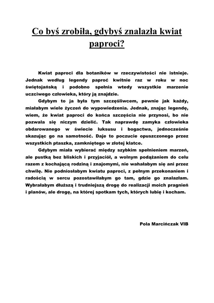 Co byś zrobiła, gdybyś znalazła kwiat paproci? Kwiat paproci dla botaników w rzeczywistości nie istnieje. Jednak według świętojańską legendy i paproć podobno kwitnie spełnia wtedy raz w roku wszystkie w noc marzenie uczciwego człowieka, który ją znajdzie. Gdybym to ja była tym szczęśliwcem, pewnie jak każdy, miałabym wiele życzeń do wypowiedzenia. Jednak, znając legendę, wiem, że kwiat paproci do końca szczęścia nie przynosi, bo nie pozwala się niczym dzielić. Tak naprawdę zamyka człowieka obdarowanego w świecie luksusu i bogactwa, jednocześnie skazując go na samotność. Daje to poczucie opuszczonego przez wszystkich ptaszka, zamkniętego w złotej klatce. Gdybym miała wybierać między szybkim spełnieniem marzeń, ale pustką bez bliskich i przyjaciół, a wolnym podążaniem do celu razem z kochającą rodziną i znajomymi, nie wahałabym się ani przez chwilę. Nie podniosłabym kwiatu paproci, z pełnym przekonaniem i radością w sercu pozostawiłabym go tam, gdzie go znalazłam. Wybrałabym dłuższą i trudniejszą drogę do realizacji moich pragnień i planów, ale drogę, na której spotkam tych, których lubię i kocham. Pola Marcińczak VIB