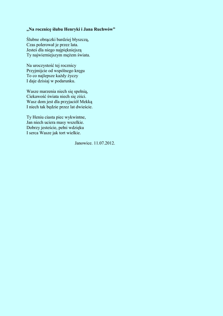 „Na rocznicę ślubu Henryki i Jana Ruchwów” Ślubne obrączki bardziej błyszczą, Czas polerował je przez lata. Jesteś dla niego najpiękniejszą Ty najwierniejszym mężem świata. Na uroczystość tej rocznicy Przyjmijcie od wspólnego kręgu To co najlepsze każdy życzy I daje dzisiaj w podarunku. Wasze marzenia niech się spełnią, Ciekawość świata niech się ziści. Wasz dom jest dla przyjaciół Mekką I niech tak będzie przez lat dwieście. Ty Heniu ciasta piec wykwintne, Jan niech uciera masy wszelkie. Dobrzy jesteście, pełni wdzięku I serca Wasze jak tort wielkie. Janowice. 11.07.2012.