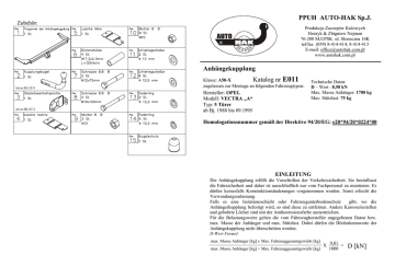 PPUH AUTO-HAK Sp.J. Zubehör: Produkcja Zaczepów Kulowych Henryk & Zbigniew Nejman 76-200 SŁUPSK ul. Słoneczna 16K tel/fax (059) 8-414-414; 8-414-413 E-mail: [email protected] www.autohak.com.pl Anhängekupplung Art.nr-KL1E11 Art.nr-BL1E11 Klasse: A50-X Katalog nr E011 zugelassen zur Montage an folgenden Fahrzeugtypen: Hersteller: OPEL Modell: VECTRA „A“ Typ: 5 Türer ab Bj. 1988 bis 09.1995 Technische Daten: D – Wert : 8,58 kN Max. Masse Anhänger: 1700 kg Max. Stützlast: 75 kg Homologationsnummer gemäß der Direktive 94/20/EG: e20*94/20*0224*00 EINLEITUNG Die Anhängekupplung erfüllt die Vorschriften der Verkehrssicherheit. Sie beeinflusst die Fahrsicherheit und daher ist ausschließlich nur vom Fachpersonal zu montieren. Es dürfen keinesfalls Konstruktionsänderungen vorgenommen werden. Sonst erlischt die Verwendungszulassung. Falls es eine Isolationsschicht oder Fahrzeugunterbodenschutz gibt, wo die Anhängerkupplung befestigt wird, so sind diese zu entfernen. Andere Karosseriestellen und gebohrte Löcher sind mit der Antikorrosionsfarbe anzustreichen. Für die Belastungswerte gelten die vom Fahrzeughersteller angegebenen Daten bzw. max. Masse der Anhänger und max. Stützlast. Dabei dürfen die Höchstkennwerte der Anhängekupplung nicht überschritten werden. D-Wert Formel: max. Masse Anhänger [kg] x Max. Fahrzeuggesamtgewicht [kg] max. Masse Anhänger [kg] + Max. Fahrzeuggesamtgewicht [kg] X 9,81 = 1000 D [kN] MONTAGE - und BETRIEBSANLEITUNG DER ANHÄNGEKUPPLUNG Anbauanleitung 1. Den Teppichboden aus dem Kofferraum entfernen. 2. Je zwei Löcher (Pos. A) mit dem Bohrer ø17,5mm an den original gekörnten Stellen links und rechts im Kofferraum bohren. 3. Die mitgelieferten Distanzhülsen (Pos. 6) in die angefertigten Löcher einsetzten und die Platten (Pos.4 und 5) einlegen. 4. Die Tragarme der Anhängerkupplung (Pos.1) von unten an das Fahrzeug anlegen und die Schrauben M10x100mm (Pos. 8) durch die Löcher (Pos. A und B), die Distanzhülsen (Pos. 6) und die im Kofferraum eingelegten Platten (Pos. 4 u. 5) einbringen (wie auf der Zeichnen gezeigt) und mit den Muttern verschrauben. 5. Die Kupplungskugel (Pos. 2) mit den Schrauben M12x75mm (Pos. 7) und dem Steckdosenhalter (Pos. 3) verschrauben. 6. Alle Schrauben gemäß den Angaben in der Tabelle fixieren. 7. Die Elektroinstallation gemäß der Bedienungsanleitung des Herstellers anschließen. 8. Falls nötig, den durch die Montage beschädigten Farbanstrich an der Anhängekupplung ausbessern. 8 A 4 6 6 8 1 5 B 7 6 6 3 Drehmomente für Schrauben und Muttern 8.8: M6 - 11 Nm M 8 - 25 Nm M 10 - 50 Nm M 12 - 87 Nm M 14 - 138 Nm M16 - 210 Nm 2 Die Anhängekupplung (Katalognummer E011) ist für folgende Fahrzeugtypen zugelassen: OPEL VECTRA „A“, 5 Türer, ab Bj. 1988 bis 09.1995, dient zum ziehen der Anhänger mit der Gesamtlast von 1700 kg und der Kugelstützlast von max. 75 kg. VON DEM HERSTELLER Die Zuverlässigkeit der Anhängekupplung ist jedoch auch von der ordnungsgemäßen Montage und der richtigen Nutzung abhängig. Daher werden Sie gebeten, sorgfältig die folgende Montageanleitung zu lesen und sich an die entsprechenden Anweisungen zu beachten. Die Anhängekupplung muss an den vom Fahrzeughersteller vorgeschriebenen Befestigungsstellen montiert werden. ACHTUNG Nach dem Anbau der Anhängekupplung sind die nationalen Vorschriften zur Anbauabnahme und zur Änderung der Fahrzeugpapiere zu beachten. Das Fahrzeug sollte mit seitlichen Blinkern und Rückspiegeln, deren Abstand mindestens der Anhängerbreite entspricht, ausgestattet werden. Alle Befestigungsschrauben sind nach ca. 1 000 km Anhängerbetrieb zu prüfen und nachzuziehen. Die Kugel der Anhängekupplung ist sauber zu halten und zu fetten. (D) (CZ) (F) (GB) (PL) (SK) Der Freiraum nach Anhang VII, Abbildung 30 der Richtlinie 94/20/EG ist zu gewährleisten. Volný prostor ve smyslu Přílohy VII,obr. 30 Směrnice č. 94/20/EG musí být zaručen. L´espace libre doit être garanti conformément à ľannexe VII, illustracion 30 de la directive 94/20/ CE. The clearance specified in apendix VII, diagram 30 of guideline 94/20/EC must be guaranteed. Zagwarantować swobodną przestrzeń zgodnie z załącznikiem VII, rysunek 30 dyrektywy 94/20/CE. Volný priestor v zmysle Prílohy VII, obr. 30 Smernice 94/20/EC musí byť zaručená. (D) (CZ) (F) (GB) (PL) (SK) * bei zulässigem Gesamtgewicht des Fahrzeuges * při celkové přípustné hmotnosti vozidla * pour poids total en charge autorizé du véhicule * at gross vehicle weight rating * przy dopuszczalnym ciężarze całkowitym pojazdu * pri celkovej prípustnej hmotnosti vozidla FITTING INSTRUCTION Clamp mark in acc. with ISO PN 1 L 2 + 3 31 4 R 5 58R 6 54 7 58L The instruction of the assembly Cables joining 8 Left directional lights Rear fog lights Ground Right directional lights Right side parking lights Stoplights Left side parking lights A 4 6 6 8 1 5 B 7 1. Remove the fit carpet from the trunk. 2. In original marked points on the left and right side inside the trunk drill holes using bit ø17,5mm. Two per each side. 3. To made holes put distance sleeves (pos. 6) from accessories and put on fish-plates (pos. 4 and 5). 4. Put the main bar of the towbar (pos. 1) underneath the car and through holes (pos. A and B), distance sleeves (pos. 6) and fish-plates in the trunk (pos. 4 and 5) fix together using bolts M10x100mm (pos. 8), as shown on the drawing. 5. Fix tow-ball (pos. 2) with socket plate (pos. 3) using bolts M12x75mm (pos. 7) from accessories. 6. Tighten all bolts according to the torque shown in the table. 7. Connect electric wires of 7-poles socket according to the instruction of the car. (Recommend to make at authorized service station). 8. Complete paint layer damaged during installation. 6 6 2 3 This towbar is designed to assembly in following cars: OPEL VECTRA “A”, 5 doors, produced since 1988 till 09.1995, catalogue no. E011 and is prepared to tow trailers max total weight 1700 kg and max vertica