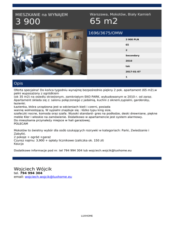 MIESZKANIE na WYNAJEM 3 900 Warszawa, Mokotów, Biały Kamień 65 m2 1696/3675/OMW 3 900 PLN 65 2 Secondary 2010 tak 2017-01-07 1 Opis Oferta specjalna! Do końca tygodniu wynajmę bezpośrednio piękny 2 pok. apartament (65 m2),w pełni wyposażony z ogródkiem (ok 35 m2) na osiedlu strzeżonym, zamkniętym EKO PARK, wybudowanym w 2010 r. od zaraz. Apartament składa się z: salonu połączonego z jadalnią, kuchni z oknem,sypialni, garderoby, łazienki. Łazienka, która urządzona jest w odcieniach bieli i czerni, posiada wannę wolnostojącą. W sypialni znajduje się : łóżko typu king size, szafeczki nocne, komoda oraz szafa. Wysoki standard- gres na podłodze, deski drewniane, piękne meble Kler i włoskie na zamówienie. Dodatkowo w apartamencie jest system alarmowy. Do mieszkania przynależy miejsce w hali garażowej. POLECAM Mokotów to świetny wybór dla osób szukających rozrywki w kategoriach: Parki, Zwiedzanie i Zabytki. 2 pokoje + ogród +garaż Czynsz najmu: 3,900 + opłaty licznikowe (zaliczka ok. 150 zł) Kaucja Dodatkowe informacje pod nr. tel 794 994 304 lub [email protected] Wojciech Wójcik tel. 794 994 304 email: [email protected] LUXHOME Powered by TCPDF (www.tcpdf.org)
