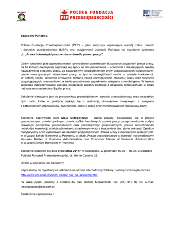 ISO 9001 ZETOM-CERT Szanowni Państwo, Polska Fundacja Przedsiębiorczości (PFP) – jako instytucja wspierająca rozwój mikro, małych i średnich przedsiębiorstw (MSP), ma przyjemność zaprosić Państwa na bezpłatne szkolenie pt. „Prawa i obowiązki pracownika w świetle prawa pracy”. Celem szkolenia jest zaprezentowanie i przybliżenie uczestnikom kluczowych zagadnień prawa pracy, na tle których najczęściej pojawiają się spory na linii pracodawca – pracownik i obejmujących zasady nawiązywania stosunku pracy, ze szczególnym uwzględnieniem praw przysługujących pracownikowi, umów towarzyszących stosunkowi pracy, w tym w szczególności umów o zakazie konkurencji. W dalszej części szkolenia omówione zostaną zasad rozwiązywania stosunku pracy oraz roszczeń przysługujących pracownikowi, a nadto podstawowe zagadnienia związane z mobbingiem. W trakcie szkolenia zaprezentowane zostaną praktyczne aspekty każdego z obszarów tematycznych, a także najnowsze orzecznictwo Sądów pracy. Szkolenie kierowane jest do pracowników przedsiębiorstw, samych przedsiębiorców oraz wszystkich tych osób, które w praktyce stykają się z realizacją obowiązków związanych z związane z zatrudnianiem pracowników, tworzeniem umów o pracę oraz monitorowaniem stosunków pracy. Szkolenie poprowadzi pani Maja Grzegorczyk – radca prawny. Specjalizuje się w prawie gospodarczym, prawie cywilnym, prawie spółek handlowych, prawie pracy, przeprowadzaniu audytu prawnego podmiotów gospodarczych oraz przedsięwzięć gospodarczych, prawie nieruchomości i obsłudze inwestycji, a także planowaniu spadkowym wraz z tworzeniem tzw. planu sukcesji. Opiekun merytoryczny oraz wykładowca na studiach podyplomowych „Prawa pracy i ubezpieczeń społecznych” w Wyższej Szkole Bankowej w Poznaniu, a także „Prawa gospodarczego w biznesie” na prestiżowym kierunku Master of Business Administration oraz Executive Master of Business Administration w Wyższej Szkole Bankowej w Poznaniu. Szkolenie odbędzie się dnia 9 kwietnia 2014r. w Szczecinie, w godzinach 09.00 – 16.00, w siedzibie Polskiej Fundacji Przedsiębiorczości, ul. Monte Cassino 32. Udział w szkoleniu jest bezpłatny. Zapraszamy do rejestracji na szkolenie na stronie internetowej Polskiej Fundacji Przedsiębiorczości http://www.pfp.com.pl/v6n2h_zapisz_sie_na_szkolenie.htm W razie pytań, prosimy o kontakt do pani Izabelli Maruszczak, tel.: (91) 312 92 22, e-mail: [email protected] Serdecznie zapraszamy ! ISO 9001ISO 9001 ZETOMCERTZETOMCERT „Prawa i obowiązki pracownika w świetle prawa pracy” Temat zajęć Godzina 09.00 Powitanie uczestników i wprowadzenie Podstawowe założenia Kodeksu pracy z punktu widzenia ochrony praw pracownika. Charakterystyka zatrudnienia na podstawie stosunku pracy – najistotniejsze cechy stosunku pracy z uwzględnieniem obowiązków spoczywających na pracodawcy i praw przysługujących pracownikowi: a) rodzaje umów o pracę, 09.00 – 10.30 b) kiedy obowiązkiem pracodawcy jest zawarcie umowy na czas nieoznaczony; c) obowiązki pracodawcy związane z zatrudnieniem pracownika; d) dane osobowe, których można żądać od kandydata na pracownika; e) kiedy dochodzi do naruszenia zasady równego traktowania w zatrudnieniu i jakie prawa przysługują pracownikowi. Najistotniejsze dla pracownika postanowienia umowy o pracę – na jakie zapisy pracownik powinien zwracać szczególną uwagę. 10.30 – 10.45 10.45 Przerwa na kawę Zatrudnienie na podstawie stosunku cywilnoprawnego – porównanie ze stosunkiem pracy: a) umowa zlecenie a umowa o dzieło – krótka charakterystyka; b) najistotniejsze różnice pomiędzy stosunkiem pracy i stosunkiem cywilnoprawnym; c) jak przedstawia się odpowiedzialność pracownika wobec pracodawcy oraz osób trzecich przy zatrudnieniu w oparciu o stosunek cywilnoprawny – niebezpieczeństwa; – 12.15 d) na jakie zapisy umów cywilnoprawnych należy zwracać szczególną uwagę. Jakie dochodzić ustalenia istnienia stosunku pracy – konsekwencje dla pracodawcy i pracownika. Umowy towarzyszące umowie o pracę: a) umowa o obowiązku zachowania poufności; b) umowy o zakazie konkurencji – na co pracownik powinien zwracać szczególną uwagę, jakie zapisy stosowane przez pracodawców są niedopuszczalne. 12.15 – 12.30 Przerwa na kawę Rozwiązanie stosunku pracy: a) w jakich przypadkach może dojść do zmiany treści umowy bez konieczności rozwiązania stosunku pracy (wypowiedzenie zmieniające). Stała i czasowa zmiana treści umowy o pracę; b) rozwiązanie umowy o pracę za wypowiedzeniem oraz za porozumieniem stron. Skutki nieprawidłowego wypowiedzenia umowy o pracę – w jaki sposób pracownik 12.30 – 14.00 może dochodzić swoich praw; c) forma i treść wypowiedzenia; d) rozwiązanie umowy o pracę bez wypowiedzenia – podstawy; e) roszczenia pracownika z tytułu niezgodnego z prawem wypowiedzenia lub rozwiązania umowy o pracę bez wypowiedzenia; f) postępowanie sądowe przeciwko pracodawcy – jakie okoliczności należy wykazać dla obrony praw pracownika; g) uprawnienia pracownika w okresie wypowiedzenia; h) ochrona pracownika przed wypowiedzeniem umowy o pracę. 14.00 – 14.15 Przerwa na kawę Odpowiedzialność w stosunku pracy: a) odpowiedzialność porządkowa pracownika – podstawy, obrona pracownika przed nieuzasadnionymi zarzutami ze strony pracodawcy; b) odpowiedzialność materialna pracownika – podstawy odpowiedzialności oraz zasady jej ponoszenia; c) odpowiedzialność za powierzone mienie – jak należy prawidłowo powierzyć mienie, treść umowy o odpowiedzialności materialnej, na jakie zapisy pracownik powinien zwracać szczególną uwagę, jak bronić się przed nieuzasadnionymi zarzutami ze strony pracodawcy; 14.15 – 15.45 d) odpowiedzialność z tytułu naruszenia zakazu konkurencji; e) odpowiedzialność pracownika z tytułu naruszenia tajemnicy przedsiębiorstwa pracodawcy – jakie obowiązki 