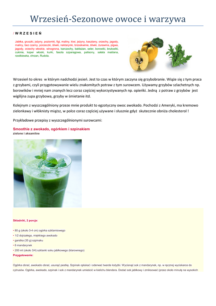 Wrzesień-Sezonowe owoce i warzywa /WRZESIEŃ Jabłka, gruszki, jeżyny, poziomki, figi, maliny, kiwi, jeżyny, kasztany, orzechy, jagody, maliny, bez czarny, porzeczki, śliwki, nektarynki, brzoskwinie, śliwki, żurawina, pigwa, jagody, orzechy włoskie, winogrona, karczochy, bakłażan, seler, borowiki, brukselki, cukinie, koper włoski, kurki, fasola szparagowa, patisony, sałata maślana, rzodkiewka, chrzan, Rudola. Wrzesień to okres w którym nadchodzi jesień. Jest to czas w którym zaczyna się grzybobranie. Wiąże się z tym praca z grzybami, czyli przygotowywanie wielu znakomitych potraw z tym surowcem. Używamy grzybów szlachetnych np. borowików i mniej nam znanych lecz coraz częściej wykorzystywanych np. opieńki. Jedną z potraw z grzybów jest wigilijna zupa grzybowa, grzyby w śmietanie itd. Kolejnym z wyszczególniony przeze mnie produkt to egzotyczny owoc awokado. Pochodzi z Ameryki, ma kremowo zielonkawy i włóknisty miąższ, w polce coraz częściej używane i słusznie gdyż skutecznie obniża cholesterol ! Przykładowe przepisy z wyszczególnionymi surowcami: Smoothie z awokado, ogórkiem i szpinakiem zielone i aksamitne Składniki, 2 porcje: • 80 g (około 3-4 cm) ogórka szklarniowego • 1/2 dojrzałego, miękkiego awokado • garstka (35 g) szpinaku • 6 mandarynek • 200 ml (około 3/4) szklanki soku jabłkowego (klarownego) Przygotowanie: Ogórka obrać, awokado obrać, usunąć pestkę. Szpinak opłukać i oderwać twarde łodyżki. Wycisnąć sok z mandarynek, np. w ręcznej wyciskarce do cytrusów. Ogórka, awokado, szpinak i sok z mandarynek umieścić w kielichu blendera. Dodać sok jabłkowy i zmiksować (przez około minutę na wysokich obrotach) do uzyskania gładkiej konsystencji. Zupa z suszonych borowików szlachetnych (składniki wystarczą na przygotowanie 2 porcji): • suszone borowiki szlachetne - 1 garść • rosół z kury - 300 ml • woda - 200 ml • śmietana 18% - 3 łyżki • pieprz - do smaku • sól - do smaku Przygotowanie: 1. Suszone grzyby namaczam w wodzie przez około 3-4 godziny. Po tym czasie odsączam grzyby i siekam je dość drobno (zależy to od tego jak duże kawałki grzybów lubimy w zupie). Wody do namaczania grzybów nie wylewam! 2. Do rosołu wlewam wodę pozostałą po namaczaniu grzybów oraz same posiekane grzyby. Gotuję tak około 20 minut do miękkości. 3. Na koniec dodaję śmietany, soli oraz pieprzu. Podaję z makaronem typu łazanki. Całkowity czas przygotowania: 4 godziny 30 minut. Źródła: http://www.prosteprzepisykulinarne.com/, http://pascalbrodnicki.pl/, http://www.kwestiasmaku.com/