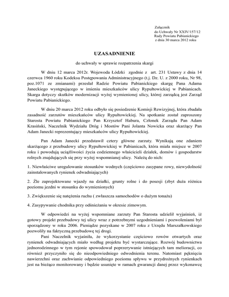 Załącznik do Uchwały Nr XXIV/157/12 Rady Powiatu Pabianickiego z dnia 30 marca 2012 roku UZASADNIENIE do uchwały w sprawie rozpatrzenia skargi W dniu 12 marca 2012r. Wojewoda Łódzki zgodnie z art. 231 Ustawy z dnia 14 czerwca 1960 roku Kodeksu Postępowania Administracyjnego (t.j. Dz. U. z 2000 roku, Nr 98, poz.1071 ze zmianami) przesłał Radzie Powiatu Pabianickiego skargę Pana Adama Janeckiego występującego w imieniu mieszkańców ulicy Rypułtowickiej w Pabianicach. Skarga dotyczy skutków modernizacji wyżej wymienionej ulicy, której zarządcą jest Zarząd Powiatu Pabianickiego. W dniu 20 marca 2012 roku odbyło się posiedzenie Komisji Rewizyjnej, która zbadała zasadność zarzutów mieszkańców ulicy Rypułtowickiej. Na spotkanie został zaproszony Starosta Powiatu Pabianickiego Pan Krzysztof Habura, Członek Zarządu Pan Adam Krasiński, Naczelnik Wydziału Dróg i Mostów Pani Jolanta Nowicka oraz skarżący Pan Adam Janecki reprezentujący mieszkańców ulicy Rypułtowickiej. Pan Adam Janecki przedstawił cztery główne zarzuty. Wynikają one zdaniem skarżącego z przebudowy ulicy Rypułtowickiej w Pabianicach, która miała miejsce w 2007 roku i powodują uciążliwości życia codziennego właścicieli działek, domów i gospodarstw rolnych znajdujących się przy wyżej wspomnianej ulicy. Należą do nich: 1. Niewłaściwe uregulowanie stosunków wodnych (częściowo zasypane rowy, niewydolność zainstalowanych rynienek odwadniających) 2. Źle zaprojektowane wjazdy na działki, grunty rolne i do posesji (zbyt duża różnica poziomu jezdni w stosunku do wymienionych) 3. Zwiększenie się natężenia ruchu ( zwłaszcza samochodów o dużym tonażu) 4. Zasypywanie chodnika przy odśnieżaniu w okresie zimowym. W odpowiedzi na wyżej wspomniane zarzuty Pan Starosta udzielił wyjaśnień, iż gotowy projekt przebudowy tej ulicy wraz z potrzebnymi uzgodnieniami i pozwoleniami był sporządzony w roku 2006. Pieniądze pozyskane w 2007 roku z Urzędu Marszałkowskiego pozwoliły na faktyczną przebudowę tej drogi. Pani Naczelnik wyjaśniła, że wykorzystanie częściowo rowów otwartych oraz rynienek odwadniających miało według projektu być wystarczające. Rozwój budownictwa jednorodzinnego w tym rejonie spowodował poprzerywanie istniejących tam melioracji, co również przyczyniło się do nieodpowiedniego odwodnienia terenu. Natomiast pęknięcia nawierzchni oraz zachwianie odpowiedniego poziomu spływu w przydrożnych rynienkach jest na bieżąco monitorowany i będzie usunięte w ramach gwarancji danej przez wykonawcę przebudowy tej ulicy. Jeżeli chodzi o wjazdy na posesje, to były one korygowane przy przebudowie drogi na bieżąco. Obecnie duża część mieszkańców ma wyłożone podwórza i dojazdy kostką. Jakakolwiek zmiana w profilu wjazdu narażała by ich na poniesienie dużych kosztów w przebudowie swoich obejść. Ponadto duża ilość wjazdów i mostków, które zostały wybudowane kilka czy kilkanaście lat temu nie były zgłaszane do wydziału geodezji i kartografii co spowodowało, że projektant nie miał ich na mapie, a skutkowało to nie umieszczeniem ich w projekcie przebudowy drogi. W związku z nasileniem ruchu Pan Starosta odpowiedział, że przed przebudową ulica Rypułtowicka była także wykorzystywana jako naturalny dojazd z Łodzi przez osiedle mieszkaniowe Retkinia do Pabianic i odwrotnie. Po modernizacji tej ulicy stała się jeszcze bardziej ,,atrakcyjnym’’ dojazdem z Pabianic do Łodzi. Z tym wiąże się wzmożenie ruchu samochodowego. Ten ruch może ulec jeszcze większemu nasileniu po otwarciu węzła obwodnicy S-14 budowanego przy tej drodze. W celu ograniczenia tonażu zostały ustawione odpowiednie znaki drogowe. Jeżeli mimo wszystko są one nierespektowane to Starosta obiecał, że w porozumieniu z komendantem Policji Powiatowej będzie tam wzmożona kontrola jej funkcjonariuszy. W sprawie zasypywania chodnika przez pługopiaskarki Pani Naczelnik odpowiedziała, że jedynym rozwiązaniem problemu to usunięcie śniegu poprzez zabranie go z drogi i zutylizowanie. Niestety ze względu na duże koszty takiej operacji Starostwo Powiatowe nie stosuje tego rozwiązania na żadnej z dróg powiatowych, zarówno w obrębie miast jak i gmin w Powiecie Pabianickim. Na uwagę ze strony Pana Janeckiego, że chodnik jest zbyt wąski Pani Nowicka odpowiedziała, iż spełnia on normy ustawowe ponieważ znajdując się w pasie drogi ma szerokość 2 metrów. Rozumiejąc zarzuty mieszkańców ulicy Rypułtowickiej, którzy poprzez zbieg różnych czynników odczuwają wyżej wymieniane niedogodności, Komisja Rewizyjna musiała wypełnić określony przez Statut Powiatu Pabianickiego tryb sprawowania kontroli (§ 38.1 Statutu Powiatu Pabianickiego). W związku z wyżej przedstawionymi wyjaśnieniami Komisja Rewizyjna nie zgodziła się z zarzutami przedstawionymi przez mieszkańców ulicy Rypułtowickiej reprezentowanych przez Pana Adama Janeckiego i uznała skargę za bezzasadną.