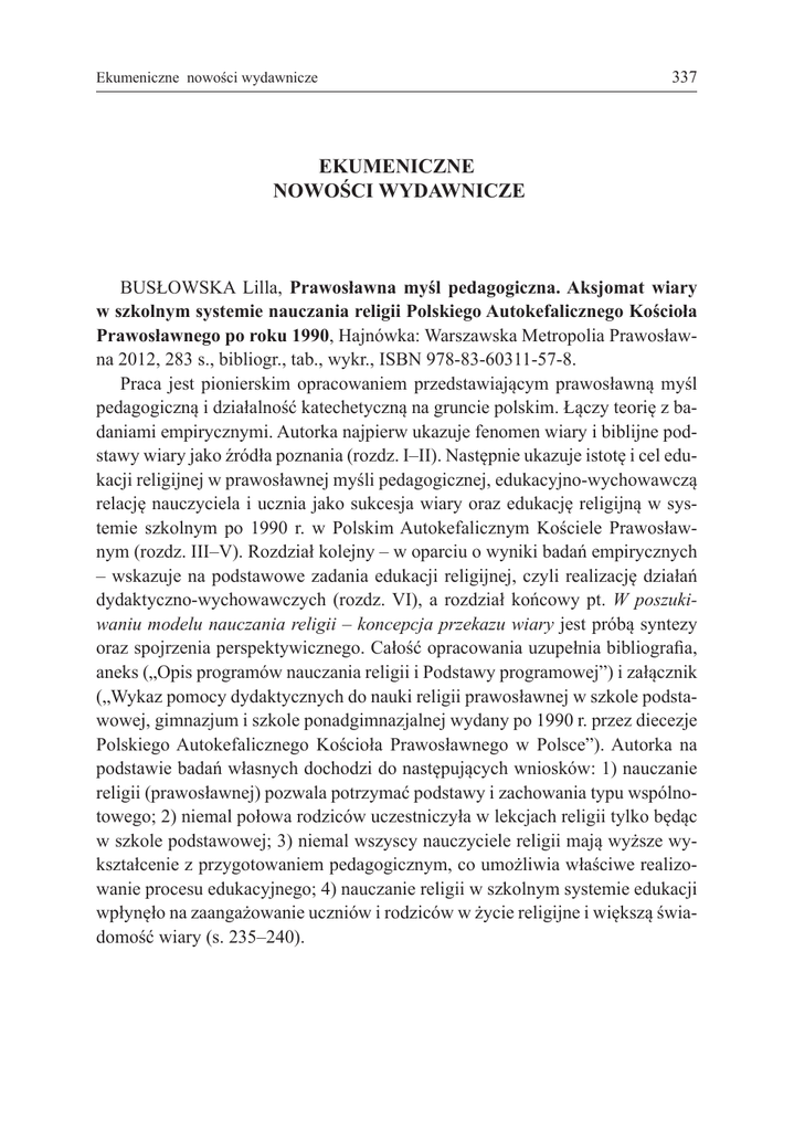 Ekumeniczne nowości wydawnicze337 EKUMENICZNE NOWOŚCI WYDAWNICZE BUSŁOWSKA Lilla, Prawosławna myśl pedagogiczna. Aksjomat wiary w szkolnym systemie nauczania religii Polskiego Autokefalicznego Kościoła Prawosławnego po roku 1990, Hajnówka: Warszawska Metropolia Prawosławna 2012, 283 s., bibliogr., tab., wykr., ISBN 978-83-60311-57-8. Praca jest pionierskim opracowaniem przedstawiającym prawosławną myśl pedagogiczną i działalność katechetyczną na gruncie polskim. Łączy teorię z badaniami empirycznymi. Autorka najpierw ukazuje fenomen wiary i biblijne podstawy wiary jako źródła poznania (rozdz. I–II). Następnie ukazuje istotę i cel edukacji religijnej w prawosławnej myśli pedagogicznej, edukacyjno-wychowawczą relację nauczyciela i ucznia jako sukcesja wiary oraz edukację religijną w systemie szkolnym po 1990 r. w Polskim Autokefalicznym Kościele Prawosławnym (rozdz. III–V). Rozdział kolejny – w oparciu o wyniki badań empirycznych – wskazuje na podstawowe zadania edukacji religijnej, czyli realizację działań dydaktyczno-wychowawczych (rozdz. VI), a rozdział końcowy pt. W poszukiwaniu modelu nauczania religii – koncepcja przekazu wiary jest próbą syntezy oraz spojrzenia perspektywicznego. Całość opracowania uzupełnia bibliografia, aneks („Opis programów nauczania religii i Podstawy programowej”) i załącznik („Wykaz pomocy dydaktycznych do nauki religii prawosławnej w szkole podstawowej, gimnazjum i szkole ponadgimnazjalnej wydany po 1990 r. przez diecezje Polskiego Autokefalicznego Kościoła Prawosławnego w Polsce”). Autorka na podstawie badań własnych dochodzi do następujących wniosków: 1) nauczanie religii (prawosławnej) pozwala potrzymać podstawy i zachowania typu wspólnotowego; 2) niemal połowa rodziców uczestniczyła w lekcjach religii tylko będąc w szkole podstawowej; 3) niemal wszyscy nauczyciele religii mają wyższe wykształcenie z przygotowaniem pedagogicznym, co umożliwia właściwe realizowanie procesu edukacyjnego; 4) nauczanie religii w szkolnym systemie edukacji wpłynęło na zaangażowanie uczniów i rodziców w życie religijne i większą świadomość wiary (s. 235–240). 338 Ekumeniczne nowości wydawnicze Ekumenizm duchowy – duchowość pojednania, red. Rajmund Porada, Opole: Red. Wydaw. WT UO 2012, 369 [3] s., Uniwersytet Opolski: Wydział Teologiczny, Instytut Ekumenizmu i Badań nad Integracją, seria: Ekumenizm i Integracja 28, ISBN 978-83-61756-99-6 PORADA Rajmund, Wprowadzenie, s. 5–7; I. Aspekty ogólnoteologiczne: CHMIELEWSKI Marek, Duchowość płaszczyzną dialogu i pojednania, s. 11– 20; HANC Wojciech, Ekumenizm duchowy a duchowość pojednania. Założenia metodologiczne, s. 21–42; SATTLER Dorothea, Ökumene ist Spiritualität der Versöhnung. Erfahrungen – Hindernisse – Perspektiven, s. 43–54; SATTLER Dorothea, Ekumenizm jest duchowością pojednania. Doświadczenia – Przeszkody – Perspektywy, s. 55–65; JASKÓŁA Piotr, Rozwój ekumenizmu – proces duchowy, s. 67–77; LINK-WIECZOREK Ulrike, Gott-sensibel werden in gemeinsamer Lebensdeutung. Überlegungen zu einer kommunikativen ökumenischen Spiritualität, s. 79–92; LINK-WIECZOREK Ulrike, Stać się wrażliwym na obecność Boga, wspólnie odkrywając sens życia. Refleksje na temat komunikatywnej duchowości ekumenicznej, s. 93–105; RAHNER Johanna, „Ökumene des Lebens“ und die gemeinsame Feier der Liturgie, s. 107–119; RAHNER Johanna, „Ekumenia życia” a wspólne sprawowanie liturgii, s. 121–133; PAWŁOWSKI Sławomir SAC, Ekumeniczna duchowość czasu liturgicznego, s. 135–147; PORADA Rajmund, Duchowość pojednania jako humus ekumenii, s. 149–161; KUBICKI Dominik, Słowo stwórcze i Słowo wcielone objawiające się w dziejach – duchowość communio w ruchu ekumenicznym, s. 163–189; II. Aspekty konfesyjne: KANTYKA Przemysław, „Świętość serca i życia” – metodystyczny ideał świętości, s. 193– 200; BŁAHUT-KOWALCZYK Aleksandra, Oblicza współczesnej duchowości luterańskiej, s. 201–206; BUGEL Walerian, Ekumenizm wewnętrzny w prawosławiu rosyjskim przykładem duchowości niepojednanych?, s. 207– 236; ŻELAZNY Jan, Bar Hebraeus – światło jedności ze Wschodu, s. 237–242; ABDALLA Michale, Potępienie obżarstwa w ascetycznej pracy Droga ku doskonałości asyryjskiego biskupa Filoksenosa z Mabbug († 523), s. 243–254; KLEJNOWSKI-RÓŻYCKI Dariusz, Minjung jako charakterystyczny rys duchowości koreańskiej, s. 255–267; III. Aspekty praktyczne: WIJLENS Myriam, Ecumenism and Canon Law, s. 271–282; WIJLENS Myriam, Ekumenizm a prawo kanoniczne, s. 283–295; KOSTORZ Jerzy, Realizacja ekumenizmu duchowego we współczesnej katechezie, s. 297–306; SKOTNICKA Agata, „Praktyczny ekumenizm duchowy” na szlakach zjednoczonej Europy. Inspiracja Polsko-Niemiecką Pielgrzymką Ekumeniczną Szlakiem Ottona III Gniezno – Magdeburg, s. 307–316; KURZAJ Franciszek, Ekumenizm duchowy w duszpasterstwie w USA. ACTS w służbie kościelnej jedności i nowej ewangelizacji, s. 317–340; BURZAWA Janusz, Duchowość i życie religijne Polonii ame- Ekumeniczne nowości wydawnicze339 rykańskiej. Aktualne problemy i wyzwania pastoralne dla Kościoła, s. 341–361; Noty o autorach, s. 363–365. EVDOKIMOV Paul, Prawosławna wizja teologii moralnej. Bóg w życiu ludzi, tł. Wiesław Szymona OP, przedm. Michel Evdokimov, Kraków: „Homo Dei” 2012, 229 s., ISBN 978-83-62579-60-0. (HD) Tyt. oryg.: Une vision orthodoxe de la théologie morale. W „Przedmowie” Michel Evdokimov pisze: “Niniejsza książka zawiera przegląd dzieła człowieka, który nieustannie rozważał tajemnicę wiary i jej roli w ludzkiej historii. Jest ona owocem wielu lat nauczania teologii moralnej w Instytucie św. Sergiusza, od roku 1950 do 1970 – daty śmierci. Dojrzewała w żywym kontakcie z audytorium. (…) Autor zwraca się (…) nie tylko do specjalistów od teologii moral