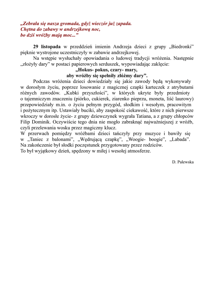 „Zebrała się nasza gromada, gdyż wieczór już zapada. Chętna do zabawy w andrzejkową noc, bo dziś wróżby mają moc...” 29 listopada w przeddzień imienin Andrzeja dzieci z grupy „Biedronki” pięknie wystrojone uczestniczyły w zabawie andrzejkowej. Na wstępie wysłuchały opowiadania o ludowej tradycji wróżenia. Następnie „złożyły dary” w postaci papierowych serduszek, wypowiadając zaklęcie: „Hokus- pokus, czary- mary, aby wróżby się spełniły złóżmy dary”. Podczas wróżenia dzieci dowiedziały się jakie zawody będą wykonywały w dorosłym życiu, poprzez losowanie z magicznej czapki karteczek z atrybutami różnych zawodów. „Kubki przyszłości”, w których ukryte były przedmioty o tajemniczym znaczeniu (piórko, cukierek, ziarenko pieprzu, moneta, liść laurowy) przepowiedziały m.in. o życiu pełnym przygód, słodkim i wesołym, pracowitym i pożytecznym itp. Ustawiały buciki, aby zaspokoić ciekawość, które z nich pierwsze wkroczy w dorosłe życie- z grupy dziewczynek wygrała Tatiana, a z grupy chłopców Filip Dominik. Oczywiście tego dnia nie mogło zabraknąć najważniejszej z wróżb, czyli przelewania wosku przez magiczny klucz. W przerwach pomiędzy wróżbami dzieci tańczyły przy muzyce i bawiły się w „Taniec z balonami”, „Wędrującą czapkę”, „Woogie- boogie”, „Labada”. Na zakończenie był słodki poczęstunek przygotowany przez rodziców. To był wyjątkowy dzień, spędzony w miłej i wesołej atmosferze. D. Palewska