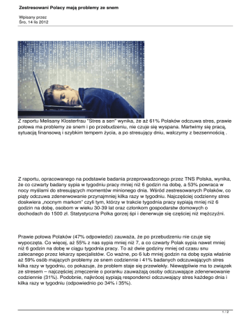 Zestresowani Polacy mają problemy ze snem Wpisany przez Śro, 14 lis 2012 Z raportu Melisany Klosterfrau "Stres a sen" wynika, że aż 61% Polaków odczuwa stres, prawie połowa ma problemy ze snem i po przebudzeniu, nie czuje się wyspana. Martwimy się pracą, sytuacją finansową i szybkim tempem życia, a po stresujący dniu, walczymy z bezsennością . Z raportu, opracowanego na podstawie badania przeprowadzonego przez TNS Polska, wynika, że co czwarty badany sypia w tygodniu pracy mniej niż 6 godzin na dobę, a 53% powraca w nocy myślami do stresujących momentów minionego dnia. Wśród zestresowanych Polaków, co piąty odczuwa zdenerwowanie przynajmniej kilka razy w tygodniu. Najczęściej codzienny stres doskwiera „nocnym markom” czyli tym, którzy w trakcie tygodnia pracy sypiają mniej niż 6 godzin na dobę, osobom w wieku 30-39 lat oraz członkom gospodarstw domowych o dochodach do 1500 zł. Statystyczna Polka gorzej śpi i denerwuje się częściej niż mężczyźni. Prawie połowa Polaków (47% odpowiedzi) zauważa, że po przebudzeniu nie czuje się wypoczęta. Co więcej, aż 55% z nas sypia mniej niż 7, a co czwarty Polak sypia nawet mniej niż 6 godzin na dobę w ciągu tygodnia pracy. To aż dwie godziny mniej od czasu snu zalecanego przez lekarzy specjalistów. Co ważne, po 6 lub mniej godzin na dobę sypia właśnie aż 59% osób mających problemy ze snem codziennie i 41% badanych odczuwających stres kilka razy w tygodniu, co pokazuje, że problem staje się przewlekły. Niewątpliwie ma to związek ze stresem – najczęściej zmęczenie o poranku zauważają osoby odczuwające zdenerwowanie codziennie (31%). Podobnie, najkrócej sypiają respondenci odczuwający stres każdego dnia i kilka razy w tygodniu (odpowiednio po 34% i 35%). 1/2 Zestresowani Polacy mają problemy ze snem Wpisany przez Śro, 14 lis 2012 Ciekawostką jest fakt, że najkrócej sypiają osoby oglądające powyżej 6 godzin telewizji dziennie oraz osoby rozwiedzione lub żyjące w separacji. Wysypiamy się natomiast w trakcie weekendów. Wtedy sytuacja wygląda dużo lepiej - 66% osób deklaruje że poświęca na sen średnio po 8 godzin na dobę. Ponad połowie Polaków (55%) zdarza się rozpamiętywać w nocy stresujące momenty minionego dnia. W szczególności dotyczy to osób odczuwających zdenerwowanie – po stresującym dniu śpią niespokojnie, mają problemy z zaśnięciem lub przebudzają się w ciągu nocy analizując stresujące momenty - taką sytuację zauważa zdecydowana większość z nich (łącznie 75% respondentów). Źródło: Raport Melisany Klosterfrau "Stres a sen"/www.egospodarka.pl 2/2