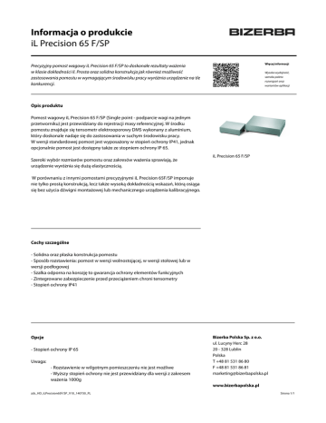 Informacja o produkcie iL Precision 65 F/SP Więcej informacji Precyzyjny pomost wagowy iL Precision 65 F/SP to doskonałe rezultaty ważenia w klasie dokładności II. Prosta oraz solidna konstrukcja jak również możliwość zastosowania pomostu w wymagającym środowisku pracy wyróżnia urządzenie na tle konkurencji. Wysoka wydajność, szeroka paleta rozwiązań oraz wariantów aplikacji Opis produktu Pomost wagowy iL Precision 65 F/SP (Single point - podparcie wagi na jednym przetworniku) jest przewidziany do rejestracji masy referencyjnej. W środku pomostu znajduje się tensometr elektrooporowy DMS wykonany z aluminium, który doskonale nadaje się do zastosowania w suchym środowisku pracy. W wersji standardowej pomost jest wyposażony w stopień ochrony IP41, jednak opcjonalnie pomost jest dostępny także ze stopniem ochrony IP 65. Szeroki wybór rozmiarów pomostu oraz zakresów ważenia sprawiają, że urządzenie wyróżnia się dużą elastycznością. iL Precision 65 F/SP W porównaniu z innymi pomostami precyzyjnymi iL Precision 65F/SP imponuje nie tylko prostą konstrukcją, lecz także wysoką dokładnością wskazań, którą osiąga się bez użycia dźwigni montażowej lub mechanicznego urządzenia kalibracyjnego. Cechy szczególne - Solidna oraz płaska konstrukcja pomostu - Sposób rozstawienia: pomost w wersji wolnostojącej, w wersji stołowej lub w wersji podłogowej - Szalka odporna na korozję to gwarancja ochrony elementów funkcyjnych - Zintegrowane zabezpieczenie przed przeciążeniem chroni tensometry - Stopień ochrony IP41 Opcje - Stopień ochrony IP 65 Uwaga: - Rozstawienie w wilgotnym pomieszczeniu nie jest możliwe - Wyższy stopień ochrony nie jest przewidziany dla wersji z zakresem ważenia 1000g Bizerba Polska Sp. z o.o. ul. Lucyny Herc 28 20 - 328 Lublin Polska T +48 81 531 86 80 F +48 81 531 86 81 [email protected] www.bizerbapolska.pl zds_HD_iLPrecision65F/SP_V10_140730_PL Strona 1/1