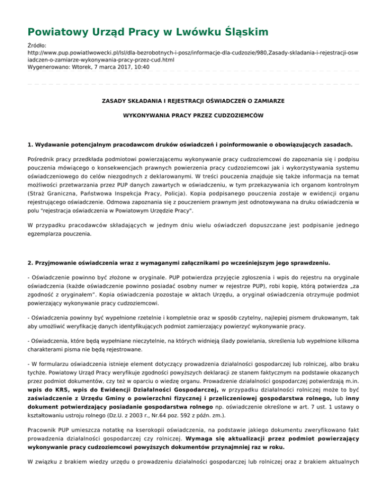 Powiatowy Urząd Pracy w Lwówku Śląskim Źródło: http://www.pup.powiatlwowecki.pl/lsl/dla-bezrobotnych-i-posz/informacje-dla-cudzozie/980,Zasady-skladania-i-rejestracji-osw iadczen-o-zamiarze-wykonywania-pracy-przez-cud.html Wygenerowano: Wtorek, 7 marca 2017, 10:40 ZASADY SKŁADANIA I REJESTRACJI OŚWIADCZEŃ O ZAMIARZE WYKONYWANIA PRACY PRZEZ CUDZOZIEMCÓW 1. Wydawanie potencjalnym pracodawcom druków oświadczeń i poinformowanie o obowiązujących zasadach. Pośrednik pracy przedkłada podmiotowi powierzającemu wykonywanie pracy cudzoziemcowi do zapoznania się i podpisu pouczenia mówiącego o konsekwencjach prawnych powierzenia pracy cudzoziemcowi jak i wykorzystywania systemu oświadczeniowego do celów niezgodnych z deklarowanymi. W treści pouczenia znajduje się także informacja na temat możliwości przetwarzania przez PUP danych zawartych w oświadczeniu, w tym przekazywania ich organom kontrolnym (Straż Graniczna, Państwowa Inspekcja Pracy, Policja). Kopia podpisanego pouczenia zostaje w ewidencji organu rejestrującego oświadczenie. Odmowa zapoznania się z pouczeniem prawnym jest odnotowywana na druku oświadczenia w polu "rejestracja oświadczenia w Powiatowym Urzędzie Pracy". W przypadku pracodawców składających w jednym dniu wielu oświadczeń dopuszczane jest podpisanie jednego egzemplarza pouczenia. 2. Przyjmowanie oświadczenia wraz z wymaganymi załącznikami po wcześniejszym jego sprawdzeniu. - Oświadczenie powinno być złożone w oryginale. PUP potwierdza przyjęcie zgłoszenia i wpis do rejestru na oryginale oświadczenia (każde oświadczenie powinno posiadać osobny numer w rejestrze PUP), robi kopię, którą potwierdza „za zgodność z oryginałem”. Kopia oświadczenia pozostaje w aktach Urzędu, a oryginał oświadczenia otrzymuje podmiot powierzający wykonywanie pracy cudzoziemcowi. - Oświadczenia powinny być wypełnione rzetelnie i kompletnie oraz w sposób czytelny, najlepiej pismem drukowanym, tak aby umożliwić weryfikację danych identyfikujących podmiot zamierzający powierzyć wykonywanie pracy. - Oświadczenia, które będą wypełniane nieczytelnie, na których widnieją ślady powielania, skreślenia lub wypełnione kilkoma charakterami pisma nie będą rejestrowane. - W formularzu oświadczenia istnieje element dotyczący prowadzenia działalności gospodarczej lub rolniczej, albo braku tychże. Powiatowy Urząd Pracy weryfikuje zgodności powyższych deklaracji ze stanem faktycznym na podstawie okazanych przez podmiot dokumentów, czy też w oparciu o wiedzę organu. Prowadzenie działalności gospodarczej potwierdzają m.in. wpis do KRS, wpis do Ewidencji Działalności Gospodarczej, w przypadku działalności rolniczej może to być zaświadczenie z Urzędu Gminy o powierzchni fizycznej i przeliczeniowej gospodarstwa rolnego, lub inny dokument potwierdzający posiadanie gospodarstwa rolnego np. oświadczenie określone w art. 7 ust. 1 ustawy o kształtowaniu ustroju rolnego (Dz.U. z 2003 r., Nr.64 poz. 592 z późn. zm.). Pracownik PUP umieszcza notatkę na kserokopii oświadczenia, na podstawie jakiego dokumentu zweryfikowano fakt prowadzenia działalności gospodarczej czy rolniczej. Wymaga się aktualizacji przez podmiot powierzający wykonywanie pracy cudzoziemcowi powyższych dokumentów przynajmniej raz w roku. W związku z brakiem wiedzy urzędu o prowadzeniu działalności gospodarczej lub rolniczej oraz z brakiem aktualnych dokumentów potwierdzających ten fakt pracownik PUP odnotowuje na oświadczeniu brak możliwości zweryfikowania prowadzenia działalności gospodarczej czy rolniczej. W przypadku oświadczeniodawcy będącego osobą fizyczną, nie prowadzącą żadnej rejestrowanej działalności, weryfikacja następuje poprzez sprawdzenie tożsamości osoby. 3. Zarejestrowanie oświadczenia. Procedura rejestracji jest bezpłatna zarówno dla składającego oświadczenie jak i cudzoziemca. Odbiór zarejestrowanego oświadczenia odbywa się następnego dnia po dniu, w którym zostało złożone oświadczenie. W przypadku, gdy pracodawca nie może osobiście odebrać oświadczenia z siedziby Powiatowego Urzędu Pracy reprezentować może go wyłącznie osoba posiadająca pisemne upoważnienie wystawione przez podmiot zamierzający powierzyć wykonywanie pracy. Oryginał zarejestrowanego oświadczenia podmiotu powierzającego wykonywania pracy cudzoziemcowi wydawany jest za potwierdzeniem odbioru po wcześniejszym sprawdzeniu tożsamości osoby. 4. Monitorowanie oświadczenia. Aby pomóc w zapobieganiu wykorzystywania uproszczonej procedury niezgodnej z jej przeznaczeniem Powiatowy Urząd Pracy powinien współdziałać z Państwową Inspekcją Pracy, Strażą Graniczną, placówkami konsularnymi poprzez. m.in. niezwłoczne udzielanie na ich wniosek wszelkich informacji związanych z rejestracją oświadczeń. Jeżeli składane oświadczenia będą budzić podejrzenia co do fikcyjnego zamiaru zatrudnienia cudzoziemców Powiatowy Urząd Pracy powinien przekazać takie informacje organom kontrolnym (SG, PIP, Policja). Metryka strony Data publikacji 12.06.2013 Rejestr zmian Osoba publikująca: Administrator PUP Autor: Administrator PUP Liczba wejść: 3233 Drukuj Generuj PDF Powiadom znajomego Wstecz