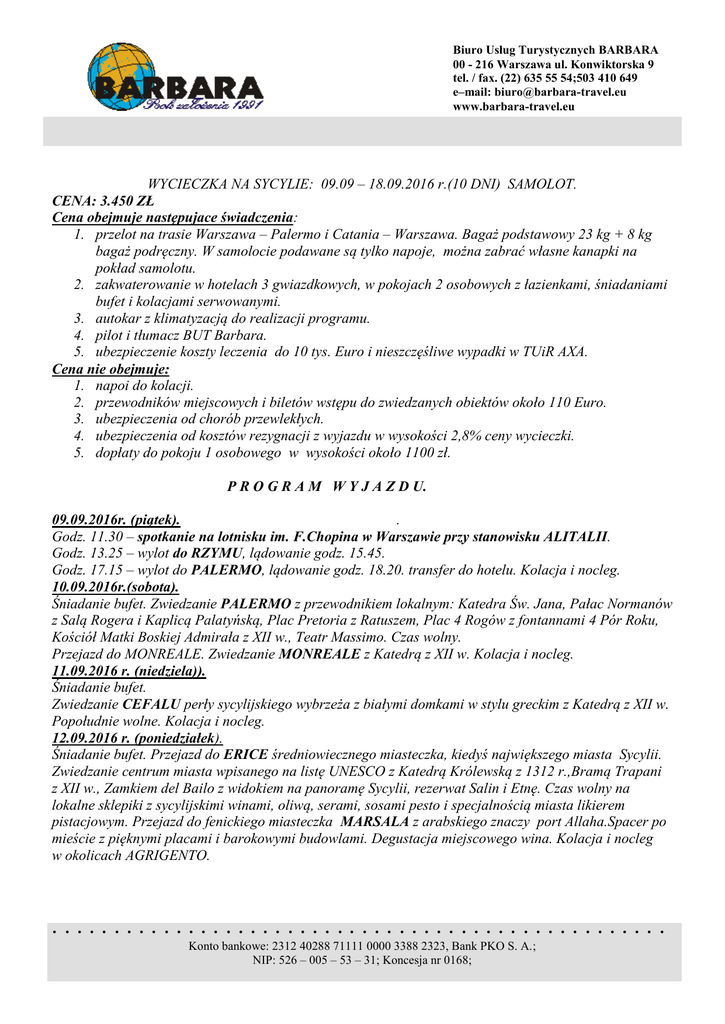 Biuro Usług Turystycznych BARBARA 00 - 216 Warszawa ul. Konwiktorska 9 tel. / fax. (22) 635 55 54;503 410 649 e–mail: [email protected] www.barbara-travel.eu WYCIECZKA NA SYCYLIE: 09.09 – 18.09.2016 r.(10 DNI) SAMOLOT. CENA: 3.450 ZŁ Cena obejmuje następujace świadczenia: 1. przelot na trasie Warszawa – Palermo i Catania – Warszawa. Bagaż podstawowy 23 kg + 8 kg bagaż podręczny. W samolocie podawane są tylko napoje, można zabrać własne kanapki na pokład samolotu. 2. zakwaterowanie w hotelach 3 gwiazdkowych, w pokojach 2 osobowych z łazienkami, śniadaniami bufet i kolacjami serwowanymi. 3. autokar z klimatyzacją do realizacji programu. 4. pilot i tłumacz BUT Barbara. 5. ubezpieczenie koszty leczenia do 10 tys. Euro i nieszczęśliwe wypadki w TUiR AXA. Cena nie obejmuje: 1. napoi do kolacji. 2. przewodników miejscowych i biletów wstępu do zwiedzanych obiektów około 110 Euro. 3. ubezpieczenia od chorób przewlekłych. 4. ubezpieczenia od kosztów rezygnacji z wyjazdu w wysokości 2,8% ceny wycieczki. 5. dopłaty do pokoju 1 osobowego w wysokości około 1100 zł. P R O G R A M W Y J A Z D U. 09.09.2016r. (piątek). . Godz. 11.30 – spotkanie na lotnisku im. F.Chopina w Warszawie przy stanowisku ALITALII. Godz. 13.25 – wylot do RZYMU, lądowanie godz. 15.45. Godz. 17.15 – wylot do PALERMO, lądowanie godz. 18.20. transfer do hotelu. Kolacja i nocleg. 10.09.2016r.(sobota). Śniadanie bufet. Zwiedzanie PALERMO z przewodnikiem lokalnym: Katedra Św. Jana, Pałac Normanów z Salą Rogera i Kaplicą Palatyńską, Plac Pretoria z Ratuszem, Plac 4 Rogów z fontannami 4 Pór Roku, Kościół Matki Boskiej Admirała z XII w., Teatr Massimo. Czas wolny. Przejazd do MONREALE. Zwiedzanie MONREALE z Katedrą z XII w. Kolacja i nocleg. 11.09.2016 r. (niedziela)). Śniadanie bufet. Zwiedzanie CEFALU perły sycylijskiego wybrzeża z białymi domkami w stylu greckim z Katedrą z XII w. Popołudnie wolne. Kolacja i nocleg. 12.09.2016 r. (poniedziałek). Śniadanie bufet. Przejazd do ERICE średniowiecznego miasteczka, kiedyś największego miasta Sycylii. Zwiedzanie centrum miasta wpisanego na listę UNESCO z Katedrą Królewską z 1312 r.,Bramą Trapani z XII w., Zamkiem del Bailo z widokiem na panoramę Sycylii, rezerwat Salin i Etnę. Czas wolny na lokalne sklepiki z sycylijskimi winami, oliwą, serami, sosami pesto i specjalnością miasta likierem pistacjowym. Przejazd do fenickiego miasteczka MARSALA z arabskiego znaczy port Allaha.Spacer po mieście z pięknymi placami i barokowymi budowlami. Degustacja miejscowego wina. Kolacja i nocleg w okolicach AGRIGENTO. .................................................. Konto bankowe: 2312 40288 71111 0000 3388 2323, Bank PKO S. A.; NIP: 526 – 005 – 53 – 31; Koncesja nr 0168; 13.09.2016 r. (wtorek). Śniadanie bufet. Zwiedzanie AGRIGENTO i Doliny Świątyń ze świątyniami Junony, Zgody, Herkulesa i Eskulapa. Spacer po barokowej RAGUSIE malowniczo położonej na planie ośmioboku. Centrum miasta wpisane jest na listę UNESCO. Zwiedzanie zabytków sztuki sakralnej, z Katedrą św. Jerzego i barokowych budowli, rzut oka na Kościół Matki Boskiej delle Scale na szczycie 340 stopniowych schodów zbudowanym na miejscu normańskiego klasztoru. Kolacja i nocleg. 14.09.2016 r. (środa). Dzień wolny. Śniadanie i kolacja w hotelu. 15.09.2016 r. (czwartek). Śniadanie bufet. Zwiedzanie z przewodnikiem lokalnym NOTO najpiękniejszego barokowego miasta na Sycylii, od 1992 r. na liście UNESCO z Placem Immacolata otoczonym budowlami o wspaniałych barokowych fasadach z piaskowca o miodowej barwie, Placu Miejskiego z Ratuszem, Pałacem Biskupim, Pałacu Villadorato z bogato zdobionymi balkonami. Zwiedzanie CATANII. Objazd miasta, spacer ulicą ETNA z pałacami i kościołami z XVIII w., Teatrem Massimo Belliniego, Placem Katedralnym, Fontanną Słonia, Zamkiem Ursino. Kolacja i nocleg w okolicach CATANII. 16.09.2016 r. (piątek). Śniadanie bufet. Wyjazd do SYRAKUZ i zwiedzanie miasta. Wyspa Ortygia kolebka antycznej cywilizacji, Gimnazjum rzymskie, Teatr grecki z III w.pne., Posąg Archimedesa najświetlejszego obywatela miasta, Ucho Dionizosa czyli stary kamieniołom w kształcie ucha o długości 65 m z nadzwyczajną akustyką, Żródło Aretuzy.Czas wolny. Kolacja i nocleg w okolicach CATANI. 17.09.2016 r. (sobota). Śniadanie bufet. Wycieczka na Wulkan ETNA. Wjazd na wysokość 2000 m.npm., spacer po kraterach. Wjazd na wysokość 2500 m lub do kratera na 2900 m wysokości - 60 EURO dodatkowa opłata. Przejazd do TAORMINY miasta nazywanego rajem na ziemi lub perłą Sycylii. Spacer z pilotem po centrum miasta. Kolacja i nocleg w okolicach CATANII. 18.09.2016 r. (niedziela). Suchy prowiant zamiast śniadania. Godz. 4.30 – transfer na lotnisko w CATANI. Godz. 7.20 – wylot do Rzymu, lądowanie godz. 8.40. Godz. 10.05 – wylot do Warszawy. Godz. 12.35 – lądowanie w Warszawie Z a p r a s z a m y!!!!!!! 1. przy zapisie wpłata zaliczki w wysokości 1.035 zł, całość wpłaty do 20.07.2016 r. Bilety lotnicze wystawiane są na konkretne nazwisko i mogą być przepisane na inną osobę przy dopłacie 150 zł. 2. miejsca w autokarze numerowane i wybierane przez klienta przy zapisie. 3. w autokarze i samolotach obowiązuje całkowity zakaz palenia tytoniu. 4. kolejność zwiedzania może ulec zmianie.