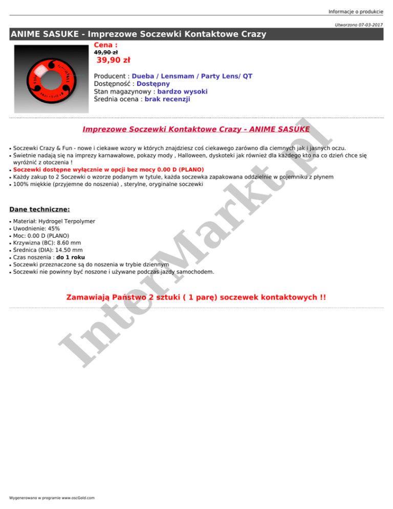 Informacje o produkcie Utworzono 07-03-2017 ANIME SASUKE - Imprezowe Soczewki Kontaktowe Crazy Cena : 49,90 zł 39,90 zł Producent : Dueba / Lensmam / Party Lens/ QT Dostępność : Dostępny Stan magazynowy : bardzo wysoki Średnia ocena : brak recenzji ● ● ● ● Soczewki Crazy & Fun - nowe i ciekawe wzory w których znajdziesz coś ciekawego zarówno dla ciemnych jak i jasnych oczu. Świetnie nadają się na imprezy karnawałowe, pokazy mody , Halloween, dyskoteki jak również dla każdego kto na co dzień chce się wyróżnić z otoczenia ! Soczewki dostępne wyłącznie w opcji bez mocy 0.00 D (PLANO) Każdy zakup to 2 Soczewki o wzorze podanym w tytule, każda soczewka zapakowana oddzielnie w pojemniku z płynem 100% miękkie (przyjemne do noszenia) , sterylne, oryginalne soczewki ar kt ● .p l Imprezowe Soczewki Kontaktowe Crazy - ANIME SASUKE Dane techniczne: ● ● ● ● ● ● te r ● Materiał: Hydrogel Terpolymer Uwodnienie: 45% Moc: 0.00 D (PLANO) Krzywizna (BC): 8.60 mm Średnica (DIA): 14.50 mm Czas noszenia : do 1 roku Soczewki przeznaczone są do noszenia w trybie dziennym Soczewki nie powinny być noszone i używane podczas jazdy samochodem. M ● In Zamawiają Państwo 2 sztuki ( 1 parę) soczewek kontaktowych !! Wygenerowano w programie www.oscGold.com
