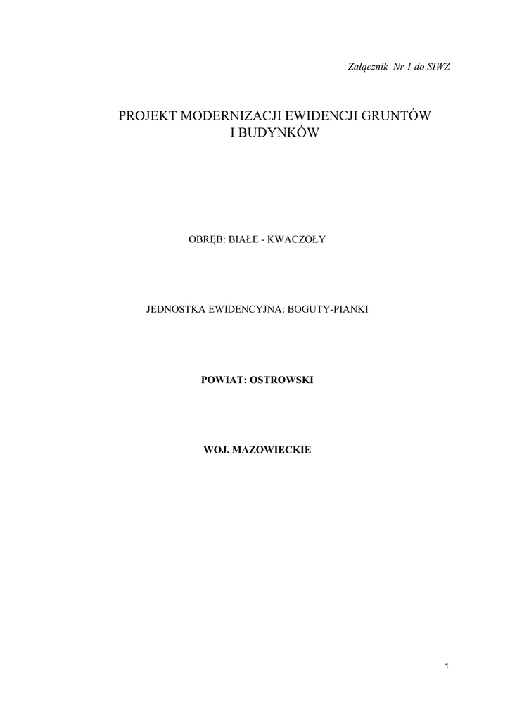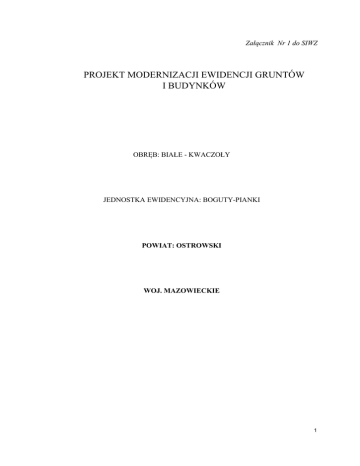 Załącznik Nr 1 do SIWZ PROJEKT MODERNIZACJI EWIDENCJI GRUNTÓW I BUDYNKÓW OBRĘB: BIAŁE - KWACZOŁY JEDNOSTKA EWIDENCYJNA: BOGUTY-PIANKI POWIAT: OSTROWSKI WOJ. MAZOWIECKIE 1 I. WPROWADZENIE 1. Niniejszy projekt modernizacji ewidencji gruntów i budynków opracowany został zgodnie z postanowieniami § 33 w związku z § 56 ust. 1 rozporządzenia Ministra Rozwoju Regionalnego i Budownictwa z dnia 29 marca 2001 r. w sprawie ewidencji gruntów i budynków (j.t. Dz. U. z 2015 r. poz. 542). 2. Modernizację ewidencji gruntów i budynków należy przeprowadzić w oparciu o następujące przepisy prawa: 1) ustawy z dnia 17 maja 1989 r. Prawo geodezyjne i kartograficzne (j.t. Dz. U. z 2015 r. poz. 520), zwanej dalej „ustawą”, 2) rozporządzenia Ministra Rozwoju Regionalnego i Budownictwa z dnia 29 marca 2001 r. w sprawie ewidencji gruntów i budynków (j.t. Dz. U. z 2015 r. poz. 542), zwanego dalej „rozporządzeniem”. 3. Podstawowym celem modernizacji, jaka będzie przeprowadzana w oparciu o niniejszy projekt będzie modyfikacja istniejących danych ewidencyjnych mająca na celu doprowadzenie do zgodności z wymogami rozporządzenia – w myśl § 55 pkt 2. II. CHARAKTERYSTYKA OBIEKTU Lokalizacja obiektu: Województwo: 14 - mazowieckie Powiat: 1416 - ostrowski Gmina: 141603_2 – Boguty-Pianki Obręb: 0001- Białe-Kwaczoły Powierzchnia ogólna obiektu: 284,08 ha Ilość jednostek rejestrowych: 60 Ilość budynków: 108 Ilość lokali: Ilość działek: 441 Liczba punktów granicznych: 1494 Szacowana liczba działek ewidencyjnych, które obejmują użytki gruntowe wymagające terenowej weryfikacji: 41 2 Informacje o strukturze użytków gruntowych: Oznaczenie użytku L.P. Powierzchnia ha 1 R 217,9078 2 Ł 2,8700 3 Ps 25,5440 4 Ls 17,5800 5 S 2,0100 6 N 1,5000 7 dr 8,7500 8 B 0,2200 9 W 0,2226 10 Br 7,4782 Ogólna informacja na temat aktualnego stanu zasobu geodezyjno – kartograficznego ze szczególnym uwzględnieniem danych dotyczących ewidencji gruntów: założenia tej ewidencji - dla obrębu ewidencyjnego Białe- Kwaczoły ewidencja gruntów została założona na podstawie podkładu fotogrametrycznego w roku 1963. W roku 2003 przekształcono mapę ewidencyjną do postaci numerycznej. W 20012 roku założono ewidencję budynków i lokali. stanu obecnego części opisowej i kartograficznej (w tym programy, w których prowadzona jest baza)- część opisowa egib prowadzona jest w programie EGB V, część graficzna to wektorowa mapa, prowadzona w programie EWMAPA. aktualności tej ewidencji- zmiany w ewidencji gruntów i budynków wprowadzane są na bieżąco na podstawie wpływających dokumentów uzasadniających ich dokonywanie. na terenie obrębu ewidencyjnego Białe- Kwaczoły istnieje osnowa III klasy oraz osnowa pomiarowa, dla obrębu ewidencyjnego Białe- Kwaczoły w ramach jednostki ewidencyjnej Boguty-Pianki prowadzona jest mapa zasadnicza w postaci numerycznej w układzie współrzędnych „2000”. 3 III. Zakres prac do wykonania w ramach modernizacji ewidencji gruntów i budynków przez Wykonawcę prac geodezyjnych i kartograficznych Do obowiązków Wykonawcy związanych z modernizacją ewidencji gruntów i budynków należeć będzie: 1) uzupełnienie bazy danych ewidencji gruntów i budynków identyfikatorami: a) PESEL – na podstawie danych ewidencji ludności prowadzonej w gminach oraz systemu PESEL, prowadzonego w MSWiA, b) REGON – na podstawie danych z rejestru podmiotów gospodarki narodowej prowadzonego przez GUS; 2) wpisanie do bazy danych ewidencji gruntów i budynków identyfikatorów ksiąg wieczystych prowadzonych w systemie informatycznym, w miejsce oznaczeń ksiąg wieczystych prowadzonych przed procesem migracji, o którym mowa w ustawie z 14 lutego 2003 r. o przenoszeniu treści księgi wieczystej do struktury księgi wieczystej prowadzonej w systemie informatycznym (Dz. U. Nr 42, poz. 363); 3) skompletowanie dokumentacji geodezyjnej, kartograficznej (materiałów i informacji zgromadzonych w państwowym zasobie geodezyjnym i kartograficznym, uzupełnionych terenowymi pomiarami geodezyjnymi oraz czynnościami ustalenia przebiegu granic) i innej (wymienionych w § 12 rozporządzenia) niezbędnej do wyeliminowania niespójności pomiędzy granicami sąsiadujących ze sobą jednostek ewidencyjnych oraz granicami obrębów ewidencyjnych; 4) terenowa weryfikacja wzajemnego usytuowania granic działek ewidencyjnych i budynków jeśli wykazanie tych obiektów na mapie wskazuje na ich kolizję; 5) pomiar punktów granicznych, po uprzednim ustaleniu ich położenia na gruncie na zasadach określonych w § 38 i 39 rozporządzenia w sprawie EGiB, w przypadku, gdy zachodzą okoliczności, o których mowa w § 37 rozporządzenia, oraz przygotowanie, w oparciu o wyniki tych pomiarów i ustaleń, danych ewidencyjnych wyznaczających z wymaganą dokładnością, o której mowa w § 29 rozporządzenia Ministra Spraw Wewnętrznych i Administracji w sprawie standardów technicznych wykonywania geodezyjnych pomiarów sytuacyjnych i wysokościowych oraz opracowywania i przekazywania wyników tych pomiarów do państwowego zasobu geodezyjnego i kartograficznego z dnia 9 listopada 2011 r. (Dz.U. z 2011 r. Nr 263, poz. 1572), położenie punktów granicznych oraz przebieg granic działek ewidencyjnych ( materiały znajdujące się w zasobie zawierające ustalenie granic oraz pomiar granic z wymaganą dokładnością, a które nie weszły w życie do ewidencji gruntów i budynków należy traktować jedynie jako materiał pomocniczy); 6) terenowa weryfikacja oraz wykonanie terenowych geodezyjnych pomiarów uzupełniających w odniesieniu do zmienionych konturów użytków gruntowych (ze szczególnym uwzględnieniem 4 gruntów zabudowanych lub przeznaczonych pod zabudowę); 7) sporządzenie kartotek budynków dla budynków, które nie zostały ujęte w ewidencji gruntów i budynków oraz wykaz zmian dla istniejących, których dane nie odpowiadają stanu faktycznemu na g