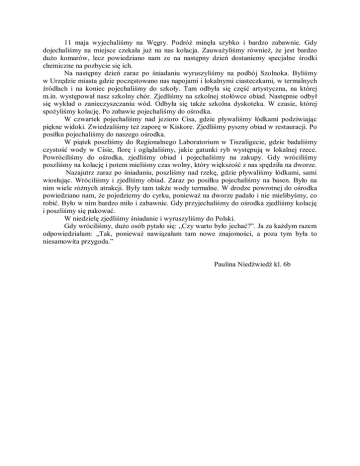 11 maja wyjechaliśmy na Węgry. Podróż minęła szybko i bardzo zabawnie. Gdy dojechaliśmy na miejsce czekała już na nas kolacja. Zauważyliśmy również, że jest bardzo dużo komarów, lecz powiedziano nam ze na następny dzień dostaniemy specjalne środki chemiczne na pozbycie się ich. Na następny dzień zaraz po śniadaniu wyruszyliśmy na podbój Szolnoka. Byliśmy w Urzędzie miasta gdzie poczęstowano nas napojami i lokalnymi ciasteczkami, w termalnych źródłach i na koniec pojechaliśmy do szkoły. Tam odbyła się część artystyczna, na której m.in. występował nasz szkolny chór. Zjedliśmy na szkolnej stołówce obiad. Następnie odbył się wykład o zanieczyszczaniu wód. Odbyła się także szkolna dyskoteka. W czasie, której spożyliśmy kolację. Po zabawie pojechaliśmy do ośrodka. W czwartek pojechaliśmy nad jezioro Cisa, gdzie pływaliśmy łódkami podziwiając piękne widoki. Zwiedzaliśmy też zaporę w Kiskore. Zjedliśmy pyszny obiad w restauracji. Po posiłku pojechaliśmy do naszego ośrodka. W piątek poszliśmy do Regionalnego Laboratorium w Tiszaligecie, gdzie badaliśmy czystość wody w Cisie, florę i oglądaliśmy, jakie gatunki ryb występują w lokalnej rzece. Powróciliśmy do ośrodka, zjedliśmy obiad i pojechaliśmy na zakupy. Gdy wróciliśmy poszliśmy na kolację i potem mieliśmy czas wolny, który większość z nas spędziła na dworze. Nazajutrz zaraz po śniadaniu, poszliśmy nad rzekę, gdzie pływaliśmy łódkami, sami wiosłując. Wróciliśmy i zjedliśmy obiad. Zaraz po posiłku pojechaliśmy na basen. Było na nim wiele różnych atrakcji. Były tam także wody termalne. W drodze powrotnej do ośrodka powiedziano nam, że pojedziemy do cyrku, ponieważ na dworze padało i nie mielibyśmy, co robić. Było w nim bardzo miło i zabawnie. Gdy przyjechaliśmy do ośrodka zjedliśmy kolację i poszliśmy się pakować. W niedzielę zjedliśmy śniadanie i wyruszyliśmy do Polski. Gdy wróciliśmy, dużo osób pytało się: „Czy warto było jechać?”. Ja za każdym razem odpowiedziałam: „Tak, ponieważ nawiązałam tam nowe znajomości, a poza tym była to niesamowita przygoda.” Paulina Niedźwiedź kl. 6b