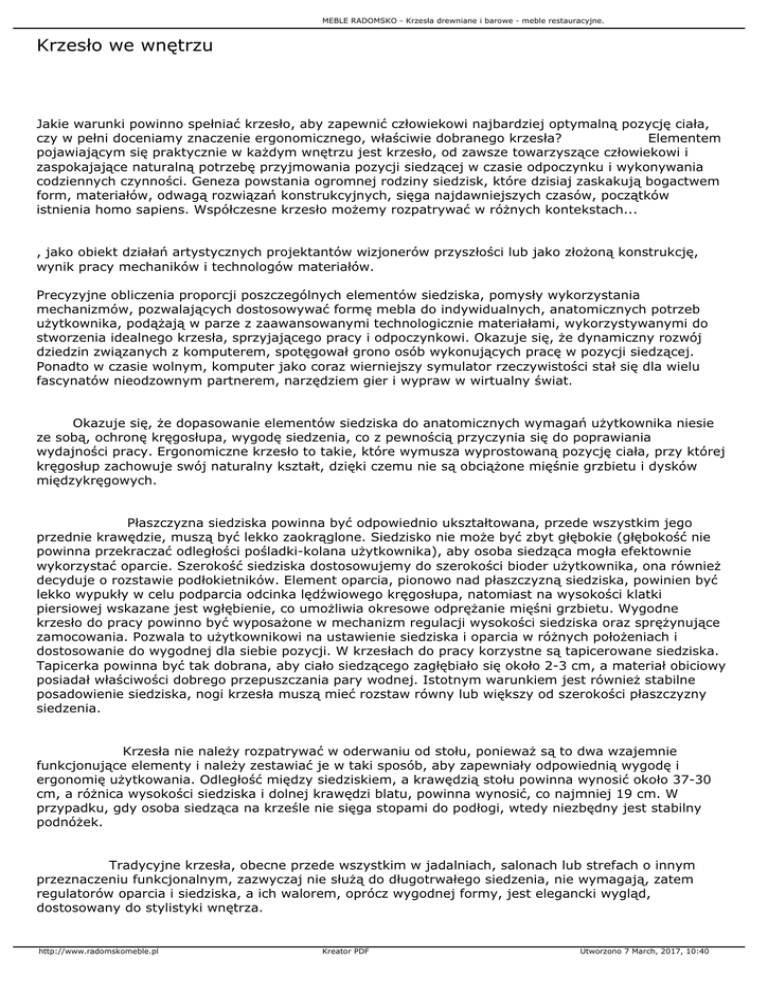 MEBLE RADOMSKO - Krzesła drewniane i barowe - meble restauracyjne. Krzesło we wnętrzu Jakie warunki powinno spełniać krzesło, aby zapewnić człowiekowi najbardziej optymalną pozycję ciała, czy w pełni doceniamy znaczenie ergonomicznego, właściwie dobranego krzesła? Elementem pojawiającym się praktycznie w każdym wnętrzu jest krzesło, od zawsze towarzyszące człowiekowi i zaspokajające naturalną potrzebę przyjmowania pozycji siedzącej w czasie odpoczynku i wykonywania codziennych czynności. Geneza powstania ogromnej rodziny siedzisk, które dzisiaj zaskakują bogactwem form, materiałów, odwagą rozwiązań konstrukcyjnych, sięga najdawniejszych czasów, początków istnienia homo sapiens. Współczesne krzesło możemy rozpatrywać w różnych kontekstach... , jako obiekt działań artystycznych projektantów wizjonerów przyszłości lub jako złożoną konstrukcję, wynik pracy mechaników i technologów materiałów. Precyzyjne obliczenia proporcji poszczególnych elementów siedziska, pomysły wykorzystania mechanizmów, pozwalających dostosowywać formę mebla do indywidualnych, anatomicznych potrzeb użytkownika, podążają w parze z zaawansowanymi technologicznie materiałami, wykorzystywanymi do stworzenia idealnego krzesła, sprzyjającego pracy i odpoczynkowi. Okazuje się, że dynamiczny rozwój dziedzin związanych z komputerem, spotęgował grono osób wykonujących pracę w pozycji siedzącej. Ponadto w czasie wolnym, komputer jako coraz wierniejszy symulator rzeczywistości stał się dla wielu fascynatów nieodzownym partnerem, narzędziem gier i wypraw w wirtualny świat. Okazuje się, że dopasowanie elementów siedziska do anatomicznych wymagań użytkownika niesie ze sobą, ochronę kręgosłupa, wygodę siedzenia, co z pewnością przyczynia się do poprawiania wydajności pracy. Ergonomiczne krzesło to takie, które wymusza wyprostowaną pozycję ciała, przy której kręgosłup zachowuje swój naturalny kształt, dzięki czemu nie są obciążone mięśnie grzbietu i dysków międzykręgowych. Płaszczyzna siedziska powinna być odpowiednio ukształtowana, przede wszystkim jego przednie krawędzie, muszą być lekko zaokrąglone. Siedzisko nie może być zbyt głębokie (głębokość nie powinna przekraczać odległości pośladki-kolana użytkownika), aby osoba siedząca mogła efektownie wykorzystać oparcie. Szerokość siedziska dostosowujemy do szerokości bioder użytkownika, ona również decyduje o rozstawie podłokietników. Element oparcia, pionowo nad płaszczyzną siedziska, powinien być lekko wypukły w celu podparcia odcinka lędźwiowego kręgosłupa, natomiast na wysokości klatki piersiowej wskazane jest wgłębienie, co umożliwia okresowe odprężanie mięśni grzbietu. Wygodne krzesło do pracy powinno być wyposażone w mechanizm regulacji wysokości siedziska oraz sprężynujące zamocowania. Pozwala to użytkownikowi na ustawienie siedziska i oparcia w różnych położeniach i dostosowanie do wygodnej dla siebie pozycji. W krzesłach do pracy korzystne są tapicerowane siedziska. Tapicerka powinna być tak dobrana, aby ciało siedzącego zagłębiało się około 2-3 cm, a materiał obiciowy posiadał właściwości dobrego przepuszczania pary wodnej. Istotnym warunkiem jest również stabilne posadowienie siedziska, nogi krzesła muszą mieć rozstaw równy lub większy od szerokości płaszczyzny siedzenia. Krzesła nie należy rozpatrywać w oderwaniu od stołu, ponieważ są to dwa wzajemnie funkcjonujące elementy i należy zestawiać je w taki sposób, aby zapewniały odpowiednią wygodę i ergonomię użytkowania. Odległość między siedziskiem, a krawędzią stołu powinna wynosić około 37-30 cm, a różnica wysokości siedziska i dolnej krawędzi blatu, powinna wynosić, co najmniej 19 cm. W przypadku, gdy osoba siedząca na krześle nie sięga stopami do podłogi, wtedy niezbędny jest stabilny podnóżek. Tradycyjne krzesła, obecne przede wszystkim w jadalniach, salonach lub strefach o innym przeznaczeniu funkcjonalnym, zazwyczaj nie służą do długotrwałego siedzenia, nie wymagają, zatem regulatorów oparcia i siedziska, a ich walorem, oprócz wygodnej formy, jest elegancki wygląd, dostosowany do stylistyki wnętrza. http://www.radomskomeble.pl Kreator PDF Utworzono 7 March, 2017, 10:40 MEBLE RADOMSKO - Krzesła drewniane i barowe - meble restauracyjne. Materiałem, od wieków stosowanym do produkcji krzeseł jest drewno, formowane w różnym czasie, odpowiednio dla panującego stylu. Elementy dekoracyjne powstających w danych epokach krzeseł, odnajdywały swe odpowiedniki w formie budynków, architekturze i elementach wyposażenia wnętrz. W końcu XIX wieku rozpowszechniła się w meblarstwie, a przede wszystkim w produkcji krzeseł, rewolucyjna technologia, opracowana przez M.Thoneta, polegająca na gięciu elementów drewnianych. Sprawdzona po raz pierwszy przed ponad stu laty technologia nie uległa do dziś znaczącym zmianom (udoskonalone zostały metody impregnacji drewna ekologicznymi powłokami i woskami). Elementy drewniane poddawane są procesowi suszenia, a następnie obróbce wstępnej. Formatowanie, struganie, toczenie nadaje elementom krzesła odpowiedni kształt i wielkość. Następnie elementy te poddawane są działaniu podwyższonej temperatury w celu ich uplastycznienia i wyginania według ustalonej formy. Materiałem wykorzystywanym do produkcji mebli giętych jest drewno bukowe w postaci łat, tarcicy i drewna okrągłego oraz sklejka z drewna brzozowego. Stosuje się również niewielkie ilości drewna olchowego, dębowego oraz sosnowego. Produkowane według technologii gięcia meble, cieszą się do dziś niesłabnącą popularnością i często wygrywają konkurencję z ciężkimi w proporcjach krzesłami wykonywanymi tradycyjną metodą stolarską oraz z bardziej nowoczesnymi meblami z elementów metalowych i tworzyw sztucznych. Dzięki wprowadzeniu technolog