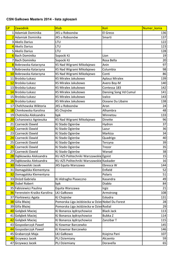 CSN Gałkowo Masters 2014 - lista zgłoszeń LP 1 2 3 4 5 6 7 8 9 10 11 12 13 14 15 16 17 18 19 20 21 22 23 24 25 26 27 28 29 30 31 32 33 34 35 36 37 38 39 40 41 42 43 44 45 46 47 Zawodnik Adamiak Dominika Adamiak Dominika Akelis Darius Akelis Darius Akelis Darius Bach Dominika Bach Dominika Bobrowska Katarzyna Bobrowska Katarzyna Bobrowska Katarzyna Brzóska Łukasz Brzóska Łukasz Brzóska Łukasz Brzóska Łukasz Brzóska Łukasz Brzóska Łukasz Chełchowska Wiktoria Chimkowska Karolina Chotnicka Aleksandra Cichanowicz Agnieszka Czarnecki Dawid Czarnecki Dawid Czarnecki Dawid Czarnecki Dawid Czarnecki Dawid Czarnecki Dawid Czarnecki Dawid Dąbkowska Aleksandra Dąbkowska Aleksandra Dobrowolski Jacek Domagalska Klementyna Domagalska Klementyna Drózd Gabriela Dubel Robert Fabisiewicz Paulina Ferenstein-Kraśko Karolina Florkiewicz Agata Gilla Błażej Gilla Błażej Gołąbek Maciej Gołąbek Maciej Gołąbek Maciej Gospodarczyk Paweł Gospodarczyk Paweł Grabarczyk Maja Grzywacz Jacek Grzywacz Jacek Klub Koń JKS u Robsonów El Greco JKS u Robsonów Smarti LTU LTU LTU Sopocki KJ Lion Sopocki KJ Rosa Bella KS Nad Wigrami Mikołajewo Anin KS Nad Wigrami Mikołajewo Columbia KS Nad Wigrami Mikołajewo Conti KS Miralex Jakubowo Aplauz Miralex KS Miralex Jakubowo Avero Boy-M KS Miralex Jakubowo Contessa 183 KS Miralex Jakubowo Dansing Song Vd Cumul KS Miralex Jakubowo Izalco KS Miralex Jakubowo Oceane Du Libaire JKS u Robsonów Aron KS Chojnów Alhambra bpk Winnetou KS Nad Wigrami Mikołajewo Dinette KJ Stado Ogierów Hydron KJ Stado Ogierów Lazur KJ Stado Ogierów Markiza KJ Stado Ogierów Quadrigo KJ Stado Ogierów Tercyna KJ Stado Ogierów Trezor KJ Stado Ogierów Wanad KU AZS Politechniki WarszawskiejEgoist KU AZS Politechniki WarszawskiejKaskader JKS Equita Warszawa Ebresca W Enfield Polaris KJ Aldragho Piaseczno Kasandra bpk Diablo Equita Warszawa Irgiz LKJ Gałkowo Armstrong KJ Chojnów Eskadra Pomorska Liga Jeździecka w Dziemianach Nobel Du Forest Pomorska Liga Jeździecka w Dziemianach Rodial KJ Bonanza Jędrzychowice Black Jack KJ Bonanza Jędrzychowice Bubka Z KJ Bonanza Jędrzychowice Zanzibar T KJ Kowmar Barczewko KJ Kowmar Barczewko LKJ Gałkowo Księżna Pani PLJ Dziemiany Alczento PLJ Dziemiany Doravella Numer_konia 136 137 122 123 128 19 20 97 98 86 139 140 142 141 143 138 24 48 133 96 37 36 34 40 39 35 38 15 16 144 52 51 49 84 21 108 131 28 29 113 114 115 145 146 107 59 65 48 49 50 51 52 53 54 55 56 57 58 59 60 61 62 63 64 65 66 67 68 69 70 71 72 73 74 75 76 77 78 79 80 81 82 83 84 85 86 87 88 89 90 91 92 93 94 95 96 97 Guślakow Małgorzata Hejger Marta Hejger Marta Hejger Marta Hejger Marta Hejger Marta Hestkowski Robert Hestkowski Robert Hipp Stefan Hipp Stefan Hubar Margarita Hubar Margarita Jarmołowicz Magdalena Kaim Katarzyna Kajko Martyna Kalinowski Piotr Kalinowski Piotr Kampowska Martyna Kozanecka Aleksandra Kozanecka Aleksandra Krupa Natalia Krupa Natalia Kryszkiewicz Rafał Krzemień Michał Krzemiński Jarosław Kubiak Grzegorz Kubiak Grzegorz Kubiak Grzegorz Kubiak Grzegorz Kubiak Michał Kuptel Małgorzata Lewicki Marek Lewicki Marek Lewicki Marek Lewicki Marek Lorkowska Katarzyna Madej Aleksandra Madej Aleksandra Minkiewicz Weronika Minkiewicz Weronika Mordzelewski Michał Mordzelewski Michał Muraczewski Jacek Muraczewski Jacek Ojczenasz Angelika Ojczenasz Angelika Ostrowska Julia Ostrowska Julia Ostrowska Julia Pachnik Aleksandra LKJ Gałkowo Benedetto JKS Narew Różan Alcapone JKS Narew Różan Aldan Clear JKS Narew Różan Canturo I JKS Narew Różan Contender Son JKS Narew Różan Parnassus JKS U Robsonów Barczewo Conti JKS U Robsonów Barczewo Notaris AUT San Varo AUT Trust Me 10 KJ Urok Ave Palegro KJ Urok Cantair HBC KS nad Wigrami Ananke KJ Bracia Romanowscy Candida Q7 bpk Kementari D KJ Kuźnia Nowowiejska Draka KJ Kuźnia Nowowiejska Malaquando KS Beniaminek 03 Starogard Gdański Czeplin KJ Szumawa Bobrowiec Adonus W KJ Szumawa Bobrowiec Calingka KJ Szumawa Bobrowiec Banderas KJ Szumawa Bobrowiec Never Lose KJ Aldragho Banderas A Capella bpk Whin Whin WH Sobieski Jumping Team Gdańsk Angela De La Cruz Sobieski Jumping Team Gdańsk Be My Lover Sobieski Jumping Team Gdańsk Elear Sobieski Jumping Team Gdańsk Wereld Ovidius Sobieski Jumping Team Gdańsk Asesor Polski Polo Klub KJ Czahary Pogorzelica Delano KJ Czahary Pogorzelica Don Juan 183 KJ Czahary Pogorzelica Landliebe KJ Czahary Pogorzelica Lupino 17 Julio Palegro II KS Strzała Kubiczew Dambis-J KS Strzała Kubiczew Lenox JKS u Robsonów Remi JKS u Robsonów Weida Stowarzyszenie Jeździeckie PosterCantina M Stowarzyszenie Jeździeckie PosterJasny Poranek LKS Cwał Poznań Handikap LKS Cwał Poznań Legolas V bpk Casquell bpk Himalajus Polski Polo Klub Warszawa Carpediem Polski Polo Klub Warszawa Krykiet Polski Polo Klub Warszawa Up-To-Date Lady Canta 66 75 76 74 78 77 11 10 68 69 130 129 95 2 32 58 57 6 17 18 56 55 56 50 134 44 43 132 45 46 147 126 124 127 125 109 41 42 27 26 53 54 117 116 23 22 70 72 71 135 98 99 100 101 102 103 104 105 106 107 108 109 110 111 112 113 114 115 116 117 118 119 120 121 122 123 124 125 126 127 128 129 130 131 132 133 134 135 136 137 138 139 140 141 142 143 144 145 146 147 Palmowska Natalia Palmowska Natalia Palmowska Natalia Pasik Monika Pasik Monika Pasik Monika Pasik Monika Pasik Monika Pasik Monika Pawelczuk Maja Pawelczuk Maja Rakoczy Dawid Rakoczy Dawid Rakoczy Dawid Rakoczy Dawid Rakoczy Dawid Regucka Julia Rębisz Anna Rębisz Anna Rudziński Michał Rudziński Michał Sadłowska Martyna Sadłowska Martyna Sęk Damian Siwczak Marta Siwczak Marta Siwczak Marta Skwara Paulina Skwara Paulina Skwara Paulina Styczeń Antonina Szmidt Emilia Śmigla Mariusz Tomaszewska Izabela Tomaszewski Antoni Tomaszewski Antoni Tomaszewski Beniamin Troszczyński Łukasz Troszczyński Łukasz Troszczyński Łukasz Troszczyński Łukasz Troszczyński Łukasz Troszczyński Łukasz Troszczyński Łukasz Troszczyński Łukasz Twardowska Zuzanna Twardowski Grzegorz Wąsowsk