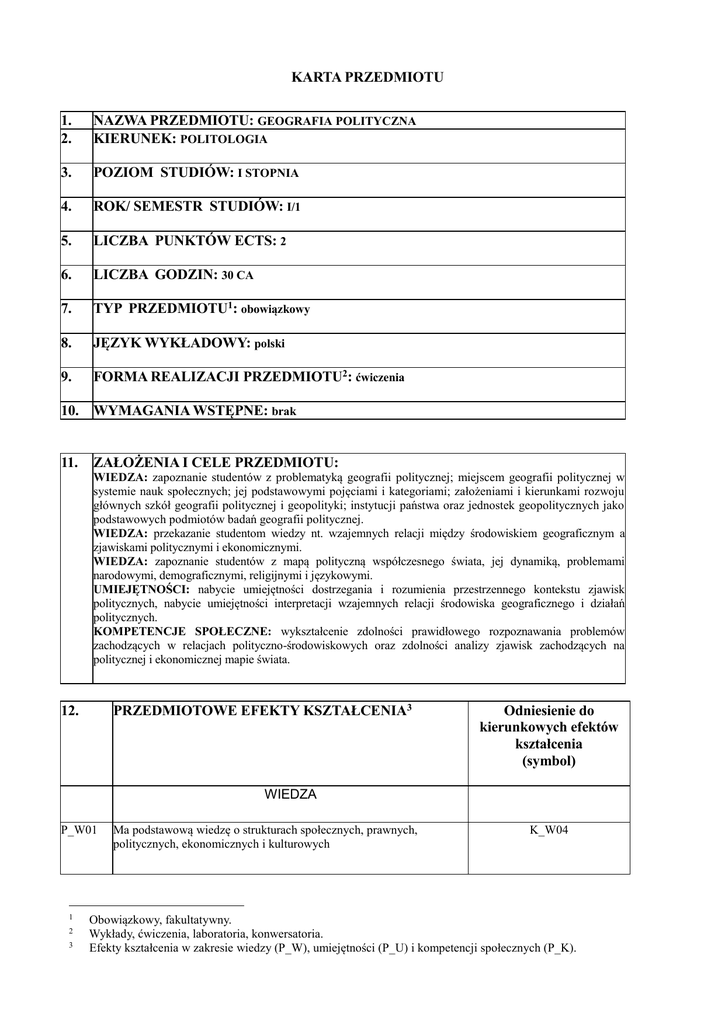 KARTA PRZEDMIOTU 1. 2. NAZWA PRZEDMIOTU: GEOGRAFIA POLITYCZNA KIERUNEK: POLITOLOGIA 3. POZIOM STUDIÓW: I STOPNIA 4. ROK/ SEMESTR STUDIÓW: I/1 5. LICZBA PUNKTÓW ECTS: 2 6. LICZBA GODZIN: 30 CA 7. TYP PRZEDMIOTU1: obowiązkowy 8. JĘZYK WYKŁADOWY: polski 9. FORMA REALIZACJI PRZEDMIOTU2: ćwiczenia 10. WYMAGANIA WSTĘPNE: brak 11. ZAŁOŻENIA I CELE PRZEDMIOTU: WIEDZA: zapoznanie studentów z problematyką geografii politycznej; miejscem geografii politycznej w systemie nauk społecznych; jej podstawowymi pojęciami i kategoriami; założeniami i kierunkami rozwoju głównych szkół geografii politycznej i geopolityki; instytucji państwa oraz jednostek geopolitycznych jako podstawowych podmiotów badań geografii politycznej. WIEDZA: przekazanie studentom wiedzy nt. wzajemnych relacji między środowiskiem geograficznym a zjawiskami politycznymi i ekonomicznymi. WIEDZA: zapoznanie studentów z mapą polityczną współczesnego świata, jej dynamiką, problemami narodowymi, demograficznymi, religijnymi i językowymi. UMIEJĘTNOŚCI: nabycie umiejętności dostrzegania i rozumienia przestrzennego kontekstu zjawisk politycznych, nabycie umiejętności interpretacji wzajemnych relacji środowiska geograficznego i działań politycznych. KOMPETENCJE SPOŁECZNE: wykształcenie zdolności prawidłowego rozpoznawania problemów zachodzących w relacjach polityczno-środowiskowych oraz zdolności analizy zjawisk zachodzących na politycznej i ekonomicznej mapie świata. PRZEDMIOTOWE EFEKTY KSZTAŁCENIA3 12. Odniesienie do kierunkowych efektów kształcenia (symbol) WIEDZA P_W01 1 2 3 Ma podstawową wiedzę o strukturach społecznych, prawnych, politycznych, ekonomicznych i kulturowych K_W04 Obowiązkowy, fakultatywny. Wykłady, ćwiczenia, laboratoria, konwersatoria. Efekty kształcenia w zakresie wiedzy (P_W), umiejętności (P_U) i kompetencji społecznych (P_K). P_W02 Ma podstawową wiedzę na temat więzi społecznych oraz zna i rozumie relacje zachodzące pomiędzy strukturami społecznymi a otoczeniem K_W06 P_W03 Ma podstawową wiedzę o wspólnotach lokalnych, ich organizacji oraz specyfice K_W07 P_W04 Ma podstawową wiedzę na temat funkcjonowania systemów ekonomicznych oraz przedsiębiorczości K_W16 UMIEJĘTNOŚCI P_U01 P_U02 P_U03 Dostrzega podstawowe relacje między polityką a zjawiskami historycznymi, ideologicznymi, politycznymi, ekonomicznymi, społecznymi i kulturowymi K_U02 Potrafi analizować i wyjaśniać podstawowe mechanizmy funkcjonowania wspólnot lokalnych oraz organizacji społeczno politycznych K_U08 Potrafi badać i wyjaśniać rolę podstawowych struktur politycznych, społecznych, ekonomicznych i kulturowych K_U10 KOMPETENCJE SPOŁECZNE P_K01 Jest przygotowany do aktywności w sferze publicznej K_K01 13. METODY OCENY EFEKTÓW KSZTAŁCENIA Symbol przedmiotowego efektu kształcenia P_W01; P_W02; P_W03, P_W04; P_U01; P_U02; P_U03, P_K01 , Metody (sposoby) oceny4 Typ oceny5 Forma dokumentacji Ocenianie ciągłe (bieżące przygotowanie do zajęć), końcowe zaliczenia ustne. Formująca Referaty Podsumowująca Końcowe zaliczenie ustne 14. KRYTERIA OCENY OSIĄGNIĘTYCH EFEKTÓW KSZTAŁCENIA 4 5 Ocenianie ciągłe (bieżące przygotowanie do zajęć), śródsemestralne zaliczenie pisemne, śródsemestralne zaliczenie ustne, końcowe zaliczenia pisemne, końcowe zaliczenia ustne, egzamin pisemny, egzamin ustny, praca semestralna, ocena umiejętności ruchowych, praca dyplomowa, projekt, kontrola obecności Formująca, podsumowująca. Kryterium opisowe Ocena Kryteria opisowe oceny osiągniętych efektów kształcenia 2 (ndst) Student nie opanował treści programowych przedmiotu i nie zrealizował zakładanych przedmiotowych efektów kształcenia. Nie rozumie podstawowych kategorii ani pojęć. Nie jest w stanie wyjaśnić istoty i przyczyn podstawowych dla przedmiotu zjawisk i procesów. Nie potrafi wykorzystać ich do analizy omawianych zagadnień, nie podejmuje także dyskusji na temat ich miejsca i roli w kontekście specyfiki przedmiotu. 3 (dost) Student opanował podstawowe treści programowe przedmiotu oraz zrealizował w niewielkim zakresie zakładane przedmiotowe efekty kształcenia. Poprawnie definiuje, przynajmniej na jeden z możliwych sposobów, podstawowe kategorie i pojęcia oraz potrafi je wykorzystać do analizy omawianych zjawisk i procesów. Potrafi podać różnicę między nimi, wyjaśnić przyczynę najważniejszych zjawisk. Wykazuje małe zainteresowanie problematyką analizowaną w ramach przedmiotu. Nie podejmuje dyskusji na omawiane tematy. 3+(dost+) Student opanował treści programowe przedmiotu oraz zrealizował zakładane przedmiotowe efekty kształcenia na poziomie poprawnym. Definiuje podstawowe kategorie i pojęcia oraz najważniejsze ujęcia teoretyczne. Umie dostrzec złożoność relacji między nimi, nie potrafi jednak wytłumaczyć ich pochodzenia. Potrafi poprawnie zastosować tę wiedzę do analizy omawianych zagadnień. Wykazuje rosnące zainteresowanie problematyką analizowaną w ramach przedmiotu, włącza się do dyskusji na ten temat. 4 (db) Student opanował treści programowe przedmiotu oraz zrealizował zakładane przedmiotowe efekty kształcenia. Definiuje kategorie, pojęcia oraz ujęcia teoretyczne, umie dostrzec złożoność relacji między nimi, potrafi wytłumaczyć ich pochodzenie i różnice, zastosować tę wiedzę do analizy omawianych zagadnień. Wykazuje stałe zainteresowanie omawianą problematyką, inicjuje dyskusje w zakresie podejmowanej tematyki. Wykazuje zrozumienie dla innych niż własne poglądów, podejmuje dyskusje na ich temat. 4+ (db+) Student opanował treści programowe przedmiotu oraz zrealizował zakładane przedmiotowe efekty kształcenia. Swobodnie definiuje i posługuje się kategoriami, pojęciami oraz ujęciami teoretycznymi. Potrafi dyskutować o złożoności relacji między nimi, odwołując się do ich pochodzenia i różnic, nie ma problemów z zastosowaniem tej wiedzy do analizy om
