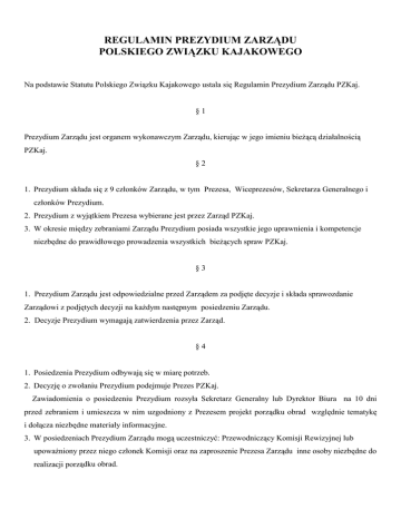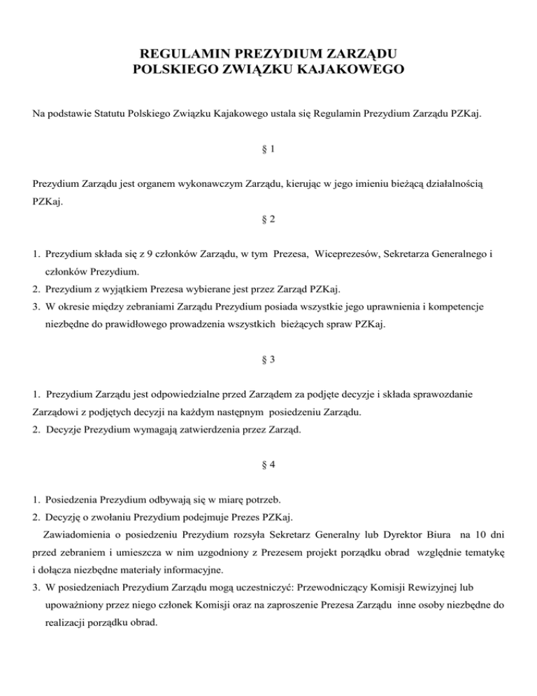 REGULAMIN PREZYDIUM ZARZĄDU POLSKIEGO ZWIĄZKU KAJAKOWEGO Na podstawie Statutu Polskiego Związku Kajakowego ustala się Regulamin Prezydium Zarządu PZKaj. §1 Prezydium Zarządu jest organem wykonawczym Zarządu, kierując w jego imieniu bieżącą działalnością PZKaj. §2 1. Prezydium składa się z 9 członków Zarządu, w tym Prezesa, Wiceprezesów, Sekretarza Generalnego i członków Prezydium. 2. Prezydium z wyjątkiem Prezesa wybierane jest przez Zarząd PZKaj. 3. W okresie między zebraniami Zarządu Prezydium posiada wszystkie jego uprawnienia i kompetencje niezbędne do prawidłowego prowadzenia wszystkich bieżących spraw PZKaj. §3 1. Prezydium Zarządu jest odpowiedzialne przed Zarządem za podjęte decyzje i składa sprawozdanie Zarządowi z podjętych decyzji na każdym następnym posiedzeniu Zarządu. 2. Decyzje Prezydium wymagają zatwierdzenia przez Zarząd. §4 1. Posiedzenia Prezydium odbywają się w miarę potrzeb. 2. Decyzję o zwołaniu Prezydium podejmuje Prezes PZKaj. Zawiadomienia o posiedzeniu Prezydium rozsyła Sekretarz Generalny lub Dyrektor Biura na 10 dni przed zebraniem i umieszcza w nim uzgodniony z Prezesem projekt porządku obrad względnie tematykę i dołącza niezbędne materiały informacyjne. 3. W posiedzeniach Prezydium Zarządu mogą uczestniczyć: Przewodniczący Komisji Rewizyjnej lub upoważniony przez niego członek Komisji oraz na zaproszenie Prezesa Zarządu inne osoby niezbędne do realizacji porządku obrad. §5 1. Decyzje Prezydium podejmowane są zwykłą większością głosów, w przypadku równej ilości głosów decyduje głos przewodniczącego zebrania. 2. Decyzje Prezydium pociągające za sobą skutki finansowe muszą się mieścić w rocznym planie finansowym ustalonym przez Zarząd. §6 1. Z obrad Prezydium sporządza się protokół podlegający przyjęciu na następnym zebraniu, do oryginału protokółu załącza się dokumenty będące przedmiotem obrad oraz podpisaną przez uczestników zebrania listę obecności. Protokół podpisuje przewodniczący obrad i protokołujący. 2. Protokóły z posiedzeń Prezydium są dostępne dla: - Członków Zarządu, - Członków Komisji Rewizyjnej, - upoważnionych przedstawicieli organów kontroli zewnętrznej. 3. Protokół z posiedzenia Prezydium winien być przygotowany i przesłany do członków Zarządu drogą elektroniczną w terminie 10 dni od zakończenia zebrania §7 Zadania i kompetencje Członków Prezydium: 1.Prezes Zarządu PZKaj. - kieruje całokształtem działalności PZKaj. zgodnie z uchwałami Walnego Zebrania i Zarządu PZKaj., - przewodniczy obradom Prezydium i Zarządu PZKaj., - reprezentuje PZKaj. na zewnątrz, - składa, zgodnie ze Statutem PZKaj. oświadczenia w zakresie praw i zobowiązań majątkowych PZKaj., - koordynuje pracę swoich zastępców oraz wyznacza osobę zastępującą go w czasie nieobecności, - wyznacza zakres obowiązków Sekretarza Generalnego i Dyrektora Biura związku. - nadzoruje pracę Biura PZKaj., prowadzi politykę personalną w odniesieniu do pracowników PZKaj., określa zakres obowiązków na poszczególnych stanowiskach pracy, - jest kierownikiem zakładu pracy w myśl postanowień Kodeksu Pracy, 2 2.Wiceprezesi Zarządu PZKaj. - sprawują kontrolę nad bieżącymi sprawami Komisji i Zespołów PZKaj. wg podziału zadań dokonanego przez Zarząd, - zastępują Prezesa PZKaj. w określonych przez niego sprawach, - składają, w zakresie określonym w Statucie PZKaj. oświadczenia dotyczące praw i zobowiązań majątkowych PZKaj. 3. Sekretarz Generalny PZKaj. - współdziała z przewodniczącymi komisji i zespołów Zarządu PZKaj., - kompletuje okresowe plany pracy organów PZKaj. i w porozumieniu z nimi przedstawia je pod obrady Prezydium i Zarządu, - składa, w zakresie określonym w Statucie PZKaj. oświadczenia dotyczące praw i zobowiązań majątkowych PZKaj. 4. Członkowie Prezydium wykonują zadania przyjęte w ramach podziału pracy lub wskazane przez Zarząd, Prezydium lub Prezesa PZKaj. §8 1. Regulamin wchodzi w życie z dniem uchwalenia. Regulamin niniejszy został uchwalony przez Zarząd PZKaj. w dniu 08.08.2010 r. Traci moc regulamin dotychczas obowiązujący. 3