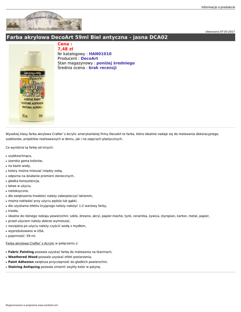Informacje o produkcie Utworzono 07-03-2017 Farba akrylowa DecoArt 59ml Biel antyczna - jasna DCA02 Cena : 7,48 zł Nr katalogowy : HAN01010 Producent : DecoArt Stan magazynowy : poniżej średniego Średnia ocena : brak recenzji Wysokiej klasy farba akrylowa Crafter`s Acrylic amerykańskiej firmy DecoArt to farba, która idealnie nadaje się do malowania dekoracyjnego, szablonów, projektów realizowanych w domu, jak i na zajęciach plastycznych. Co wyróżnia tą farbę od innych: ● szybkoschnąca, ● szeroka gama kolorów, ● na bazie wody, ● kolory można mieszać między sobą, ● odporna na działanie promieni słonecznych, ● gładka konsystencja, ● łatwe w użyciu, ● nietoksyczne, ● dla zwiększenia trwałości należy zabezpieczyć lakierem, ● można nakładać przy użyciu pędzla lub gąbki, ● dla uzyskania efektu kryjącego należy nałożyć 1-2 warstwy farby, ● trwała, ● idealne do różnego rodzaju powierzchni: szkło, drewno, akryl, papier-mache, tynk, ceramika, żywica, styropian, karton, metal, papier, ● przed użyciem należy dobrze wymieszać, ● narzędzia po użyciu należy czyścić wodą z mydłem, ● wyprodukowano w USA, ● pojemność: 59 ml. Farba akrylowa Crafter`s Acrylic w połączeniu z: ● Fabric Painting pozwala uzyskać farbę do malowania na tkaninach, ● Weathered Wood pozwala uzyskać efekt postarzenia, ● Paint Adhesion zwiększa przyczepność do gładkich powierzchni, ● Staining Antiquing pozwala zmienić zwykły kolor w patynę. Wygenerowano w programie www.oscGold.com