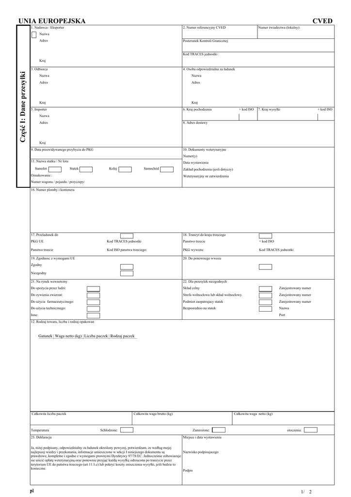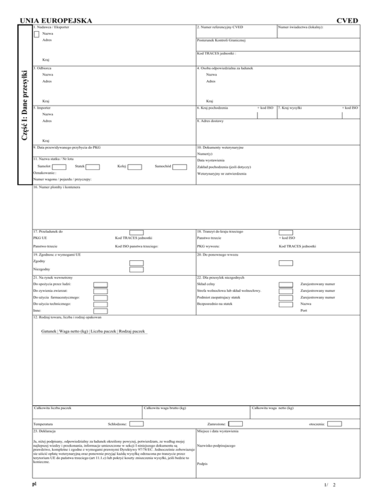 UNIA EUROPEJSKA CVED 1. Nadawca / Eksporter 2. Numer referencyjny CVED Numer świadectwa (lokalny): Nazwa Adres Posterunek Kontroli Granicznej Kod TRACES jednostki : Kraj Część I: Dane przesyłki 3. Odbiorca 4. Osoba odpowiedzialna za ładunek Nazwa Nazwa Adres Adres Kraj Kraj 5. Importer 6. Kraj pochodzenia + kod ISO 7. Kraj wysyłki + kod ISO Nazwa Adres 8. Adres dostawy Kraj 9. Data przewidywanego przybycia do PKG 10. Dokumenty weterynaryjne Numer(y) 11. Nazwa statku / Nr lotu Samolot Data wystawienia Statek Kolej Samochód Oznakowanie:: Zakład pochodzenia (jesli dotyczy) Weterynaryjny nr zatwierdzenia Numer wagonu / pojazdu / przyczepy: 16. Numer plomby i kontenera 17. Przeladunek do 18. Tranzyt do kraju trzeciego PKG UE Kod TRACES jednostki Panstwo trzecie + kod ISO Panstwo trzecie Kod ISO panstwa trzeciego: PKG wywozu: Kod TRACES jednostki 19. Zgodnosc z wymogami UE 20. Do ponownego wwozu Zgodny Niezgodny 21. Na rynek wewnetrzny 22. Dla przesylek niezgodnych Do spożycia przez ludzi: Skład celny Zarejestrowany numer Do zywienia zwierzat: Strefa wolnocłowa lub skład wolnocłowy. Zarejestrowany numer Do użycia farmaceutycznego: Podmiot zaopatrujacy statek Zarejestrowany numer Do użycia technicznego: Bezposrednio na statek Nazwa Inne: Port 12. Rodzaj towaru, liczba i rodzaj opakowan Gatunek Waga netto (kg) Liczba paczek Rodzaj paczek Całkowita liczba paczek Temperatura 23. Deklaracja Całkowita waga brutto (kg) Schłodzone: Całkowita waga netto (kg) Zamrożone: otoczenia: Miejsce i data wystawienia Ja, niżej podpisany, odpowiedzialny za ładunek określony powyzej, potwierdzam, ze według mojej najlepszej wiedzy i przekonania, informacje umieszczone w sekcji I niniejszego dokumentu są Nazwisko podpisujacego prawdziwe, kompletne i zgodne z wymogami prawnymi Dyrektywy 97/78/EC. Jednocześnie zobowiazuje sie uiścić opłatę weterynaryjną oraz ponownie przyjąć każdą wysyłkę odrzucona po tranzycie przez terytorium UE do państwa trzeciego (art 11.1.c) lub pokryć koszty zniszczenia wysyłki, jeśli bedzie to konieczne. Podpis pl 1/ 2 UNIA EUROPEJSKA CVED 24. Poprzedni CVED: Nie Tak 25. Nr referencyjny CVED: Numer świadectwa (lokalny) Nr referencyjny: Część II:: Decyzja dotyczaca wysylki 26. Kontrola dokumentów: Zadowalająca 27. Kontrola tożsamosci: Niezadowalająca 28. Kontrola fizyczna: Zadowalająca Sprawdzenie plomby LUB pełna kontrola tożsamosci Zadowalająca Niezadowalająca 29. Badania laboratoryjne: Nie Tak Badanie na:: Niezadowalająca Nie przeprowadzono Losowo 1. Procedura zredukowanej kontroli fizycznej Wyniki:: 2. Inne Wydano oczekując na wynik 30. DOPUSZCZONE do przeladunku: Podejrzenie Zadowalająca Wzmocniona Niezadowalająca 31. DOPUSZCZONE do procedury tranzytu PKG UE Kod TRACES jednostki Panstwo trzecie + kod ISO Panstwo trzecie Kod ISO panstwa trzeciego PKG wywozu Kod TRACES jednostki 32. DOPUSZCZONE na rynek wewnetrzny 33. DOPUSZCZONE do procedury kanalizacji Do swobodnego obrotu Procedura art. 8 Do spożycia przez ludzi: Ponowny wwóz produktów UE (art. 15) Do zywienia zwierzat: Do użycia farmaceutycznego: 34. DOPUSZCZONE wg procedury składu celnego (art. 12.4 i 13) Do użycia technicznego: Inne: Skład celny Strefa wolnocłowa lub skład wolnocłowy. Podmiot zaopatrujacy statek 35. Nie dopuszczone Bezposrednio na statek 1. Ponowny wywóz 2. Zniszczenie 36. Powód odrzucenia 3. Przetworzenie Do dnia: 1. Brak/wadliwe swiadectwo 2. Niezatwierdzone panstwo 3. Niezatwierdzony zakład 37. Szczególy kontrolowanych miejsc przeznaczenia (33-35) Numer zatwierdzenia (jesli dotyczy) 4. Produkt niedozwolony Adres 5. ID: niezgodnosc w dokumentach 6. ID: bledny znak jakosci zdrowotnej 7. Niezgodnosc z wymogami higieny 8. Skazenie chemiczne 9. Skazenie mikrobiologiczne 38. Wysylka ponownie zaplombowana Nowy nr plomby: 10. Inne 39. Dane PKG / właściwej władzy i urzędowa pieczęć 40. Urzedowy lekarz weterynarii Ja, nizej podpisany, urzedowy lekarz weterynarii (lub wyznaczony przedstawiciel), potwierdzam, ze kontrola weterynaryjna niniejszej wysylki zostala przeprowadzona zgodnie z wymogami UE. Podpis: Nazwa (wielkimi literami): Data: 41. PKG wywozu: formalnosci wywozu z UE i kontrole towarów w tranzycie potwierdzone zgodnie z art. 42. Dokument celny wysylki: 11.2(e) dyrektywy 97/78/WE: PKG wyjscia PKG ostatecznego przeznaczenia 43. Kolejny CVED Lokalna Jednostka Weterynaryjna Zgodność wysyłki Numer(y): Nie Tak Data Pieczęć: pl 2/ 2