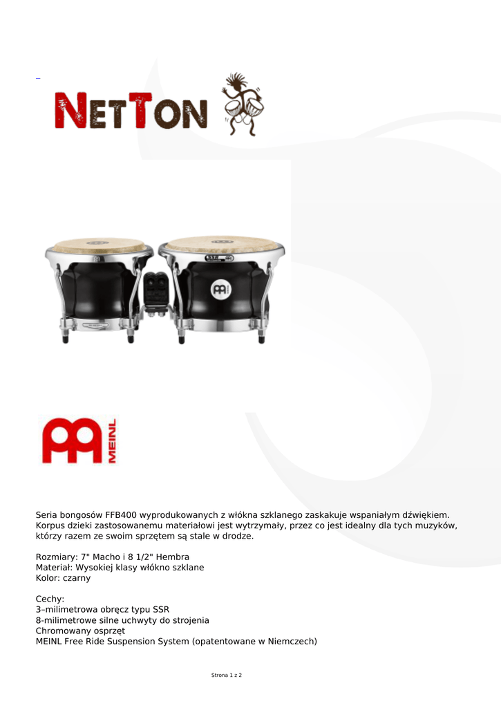 Seria bongosów FFB400 wyprodukowanych z włókna szklanego zaskakuje wspaniałym dźwiękiem. Korpus dzieki zastosowanemu materiałowi jest wytrzymały, przez co jest idealny dla tych muzyków, którzy razem ze swoim sprzętem są stale w drodze. Rozmiary: 7" Macho i 8 1/2" Hembra Materiał: Wysokiej klasy włókno szklane Kolor: czarny Cechy: 3–milimetrowa obręcz typu SSR 8-milimetrowe silne uchwyty do strojenia Chromowany osprzęt MEINL Free Ride Suspension System (opatentowane w Niemczech) Strona 1 z 2 True Skin (Naciągi ze skóry Cechy szczególne: Zakres dla optymalnego rozwijania rezonansu w zestawie: Klucz do strojenia (w kształcie litery L) Płyn do oliwienia naciągów Strona 2 z 2