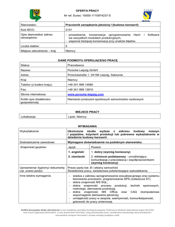 OFERTA PRACY Nr ref. Eures: 10000-1110974237-S Stanowisko: Pracownik zarządzania jakością I (budowa karoserii) Kod ISCO: 2141 Opis stanowiska/ zakres obowiązków: prowadzenie, konserwacja oprogramowania Hardwe wszystkich modułach produkcyjnych, wsparcie bieżącej konserwacji przy analizie błędów. Liczba etatów: 5 Miejsce zatrudnienia – kraj: Niemcy i Software DANE PODMIOTU OFERUJĄCEGO PRACĘ Status: Pracodawca Nazwa: Porsche Leipzig GmbH Adres: Porschestraße 1, 04158 Leipzig, Saksonia Kraj: Niemcy Telefon (z kodem kraju): +49 341 999 14560 Fax: +49 341 999 13910 Strona internetowa: www.porsche-leipzig.com Krótki opis działalności gospodarczej: Niemiecki producent sportowych samochodów osobowych. MIEJSCE PRACY Lokalizacja: Lipsk, Niemcy WYMAGANIA Wykształcenie: Ukończone studia wyższe z zakresu budowy maszyn i pojazdów, inżynierii produkcji lub pokrewne wykształcenie w dziedzinie budowy karoserii. Doświadczenie zawodowe: Wymagane doświadczenie na podobnym stanowisku. Znajomość języków: Język Poziom 1. angielski 1. dobry (wymóg konieczny) 2. niemiecki 2. minimum podstawowy - umożliwiający komunikację z pracodawcą i współpracownikami (wymóg konieczny) Uprawnienia/ dyplomy/ dokumenty (np. prawo jazdy): Inne istotne wymagania: Prawo jazdy kat. B i własny samochód. Świadectwa pracy, świadectwa potwierdzające wykształcenie. wiedza z zakresu oprogramowania wizualizacyjnego oraz systemu kierowania procesami, programowanie SPS (zwłaszcza S7), dobra znajomość MS SQL, dobra znajomość procesu produkcji, technik spoinowych, metrologii, sterowania produkcją, dobra znajomość MS Office oraz CAQ (komputerowe wspomaganie sterowania jakością), umiejętność pracy w zespole, asertywność, komunikatywność, gotowość do pracy zmianowej. EURES (Europejskie Służby Zatrudnienia) to sieć współpracy pomiędzy Komisją Europejską, Publicznymi Służbami Zatrudnienia krajów UE/ EOG oraz innych organizacji partnerskich, w celu dostarczania informacji, usług pośrednictwa pracy i poradnictwa zawodowego dla pracodawców i pracowników chcących skorzystać z zasady wolnego przepływu osób WYNAGRODZENIE I WARUNKI ZATRUDNIENIA Wysokość pensji brutto: 50 000 - 55 000 Waluta, w jakiej wypłacana jest pensja: Euro Rodzaj stawki wynagrodzenia: Roczna Premie: --- Dodatkowe świadczenia: Pracodawca pomaga w znalezieniu zakwaterowania. Koszty wynajmu ponosi pracownik. Nazwa firmy, z którą zostanie podpisana umowa: Porsche Leipzig GmbH Rodzaj umowy: Umowa o pracę Wymiar czasu pracy Pełen etat Czas trwania umowy: Na czas nieokreślony Liczba godzin tygodniowo: 38-40 Zmiany i praca w dni wolne: Praca zmianowa Data rozpoczęcia: Od zaraz SPOSÓB SKŁADANIA WNIOSKU Wymagane dokumenty: Szczegółowe CV tylko w j. niemieckim (z uwzględnieniem obowiązków wykonywanych na podobnych stanowiskach pracy), dokumenty potwierdzające kwalifikacje zawodowe. Język, w którym muszą być sporządzone przedkładane dokumenty: Niemiecki Do kogo należy wysłać dokumenty: Do Asystenta Eures – Joanna Szałęga Gdzie należy wysłać dokumenty: Na adres e-mail: [email protected] (w tytule jakością I) proszę wpisać: pracownik zarządzania lub pocztą tradycyjną na adres: Joanna Szałęga Dolnośląski Wojewódzki Urząd Pracy Al. Armii Krajowej 54 50-541 Wrocław z dopiskiem: pracownik zarządzania jakością I. DODATKOWE INFORMACJE Rozmowy rekrutacyjne odbędą się 23.05.2014 r. we Wrocławiu podczas Targów Pracy i Informacji o Mobilności. Osoby zakwalifikowane do rozmów zostaną poinformowane o dokładnym miejscu i godzinie spotkania. WAŻNOŚĆ Data publikacji: 20.03.2014 / aktualizacja 09.04.2014 Termin przedkładania podań o pracę / zakończenia ważności oferty: Do odwołania UWAGA: 1. Umowa z zagranicznym pracodawcą zostanie zawarta zgodnie z prawem kraju zatrudnienia. Oznacza to, że wszystkie roszczenia odnośnie do warunków, które obejmuje umowa, można kierować wyłącznie do odpowiedniego sądu w kraju EURES (Europejskie Służby Zatrudnienia) to sieć współpracy pomiędzy Komisją Europejską, Publicznymi Służbami Zatrudnienia krajów UE/ EOG oraz innych organizacji partnerskich, w celu dostarczania informacji, usług pośrednictwa pracy i poradnictwa zawodowego dla pracodawców i pracowników chcących skorzystać z zasady wolnego przepływu osób zatrudnienia. Publiczne służby zatrudnienia (EURES) nie mogą pośredniczyć ani reprezentować pracownika w sądzie kraju zatrudnienia w przypadku sporu z pracodawcą. 2. Publiczne służby zatrudnienia (EURES) dokładają wszelkich starań, aby zapewnić rzetelność i wiarygodność ofert pracy zgłoszonych w lokalnym urzędzie pracy. Należy wyjaśnić, że oferta pracy została zgłoszona przez stronę trzecią i EURES nie odpowiada za ewentualne rozbieżności między warunkami pracy określonymi w ofercie pracy i warunkami oferowanymi przez potencjalnego pracodawcę. 3. Publiczne służby zatrudnienia (EURES) informują, że będą zbierać, przetwarzać i przekazywać potencjalnym pracodawcom zgodnie z przepisami dotyczącymi ochrony danych osobowych wszystkie dane osobowe dostarczone przez osoby poszukujące pracy. EURES (Europejskie Służby Zatrudnienia) to sieć współpracy pomiędzy Komisją Europejską, Publicznymi Służbami Zatrudnienia krajów UE/ EOG oraz innych organizacji partnerskich, w celu dostarczania informacji, usług pośrednictwa pracy i poradnictwa zawodowego dla pracodawców i pracowników chcących skorzystać z zasady wolnego przepływu osób