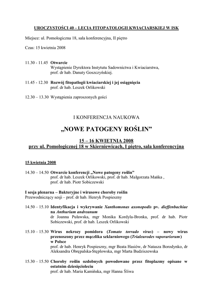 UROCZYSTOŚCI 40 – LECIA FITOPATOLOGII KWIACIARSKIEJ W ISK Miejsce: ul. Pomologiczna 18, sala konferencyjna, II piętro Czas: 15 kwietnia 2008 11.30 - 11.45 Otwarcie Wystąpienie Dyrektora Instytutu Sadownictwa i Kwiaciarstwa, prof. dr hab. Danuty Goszczyńskiej. 11.45 - 12.30 Rozwój fitopatlogii kwiaciarskiej i jej osiągnię cia prof. dr hab. Leszek Orlikowski 12.30 – 13.30 Wystąpienia zaproszonych goś ci I KONFERENCJA NAUKOWA „NOWE PATOGENY ROŚLIN” 15 – 16 KWIETNIA 2008 przy ul. Pomologicznej 18 w Skierniewicach, I pię tro, sala konferencyjna 15 kwietnia 2008 14.30 – 14.50 Otwarcie konferencji „Nowe patogeny roś lin” prof. dr hab. Leszek Orlikowski, prof. dr hab. Mał gorzata Mańka , prof. dr hab. Piotr Sobiczewski I sesja plenarna – Bakteryjne i wirusowe choroby roś lin Przewodniczący sesji – prof. dr hab. Henryk Pospieszny 14.50 – 15.10 Identyfikacja i wykrywanie Xanthomonas axonopodis pv. dieffenbachiae na Anthurium andreanum dr Joanna Puł awska, mgr Monika Kordyla-Bronka, prof. dr hab. Piotr Sobiczewski, prof. dr hab. Leszek Orlikowski 15.10 – 15.30 Wirus nekrozy pomidora (Tomato torrado virus) – nowy wirus przenoszony przez mączlika szklarniowego (Trialeurodes vaporariorum) w Polsce prof. dr hab. Henryk Pospieszny, mgr Beata Hasiów, dr Natasza Borodynko, dr Aleksandra Obrępalska-Stęplowska, mgr Marta Budziszewska 15.30 – 15.50 Choroby roś lin ozdobnych powodowane przez fitoplazmy opisane w ostatnim dziesię cioleciu prof. dr hab. Maria Kamińska, mgr Hanna Śliwa 15.50 – 16.10 Udziałkomórek granicznych czapeczki korzenia w interakcjach roś lina – mikroorganizm dr Jolanta Jaroszuk-Ściseł , prof. dr hab. Ewa Kurek 16.10 – 16.30 Dyskusja 16.30 – 16.40 Przerwa II sesja plenarna – Środki ochrony roś lin i mikoryza w zwalczaniu nowych patogenów Przewodniczący sesji – prof. dr hab. Mał gorzata Mańka – czł . koresp. PAN 16.40 – 16.50 Biosept SL, przyszł oś ciowy ś rodek biotechniczny w ochronie roś lin przed patogenami glebowymi i nalistnymi mgr Wojciech Bisek - Cintamani Poland 16.50 – 17.05 Produkty na bazie wyciągu z obornika, dające gwarancjęwysokiej jakoś ci roś lin dr Stanisł aw Wilk – Host International 17.05 – 17.20 Szczepionki – preparaty mikoryzowe dla ogrodnictwa inż. Wł odzimierz Szał ański – Mykoflor 17.20 – 17.40 Praktyczna efektywnoś ćintegracji Trichoderma viride B35 ze ś rodkami ochrony roś lin doc. dr hab. Czesł aw Ślusarski, prof. dr hab. Stanisł aw Pietr 17.40 – 18.10 Dyskusja 18.10 – 19.30 Sesja posterowa Przewodniczący sesji: doc. dr hab. Adam Wojdył a 16 kwietnia 2008 II sesja plenarna – Nowe patogeny roś lin Przewodniczący sesji: prof. dr hab. Czesł aw Sadowski, prof. dr hab. Stefan Martyniuk 8.30 – 8.50 Nowy gatunek Fusarium w Polsce dr inż. Aleksander Łukanowski, prof. dr hab. Czesł aw Sadowski 8.50 – 9.10 Wystę powanie fuzariozy kolb kukurydzy i skaż enie ziarna przez mikotoksyny w Polsce w 2006 roku dr inż. Agata Tekiela, mgr Robert Gabarkiewicz 9.10 – 9.30 Wystę powanie Phytophthora spp. w szkół kach ozdobnych roś lin iglastych i liś ciastych prof. dr hab. Leszek Orlikowski, dr Grażyna Szkuta 9.30 – 10.00 Dyskusja 10.00 – 10.20 Przyczyny wiosennego zamierania pszenicy ozimej w rejonie Cheł ma Lubelskiego prof. dr hab. Stefan Martyniuk 10.20 – 10.40 Patogeny wyniszczające drzewa i krzewy terenów zieleni miasta Poznania dr hab. Maria Werner, mgr Roman Andrzejak 10.40 – 11.00 Znane patogeny bakteryjne na mniej znanych ż ywicielach dr hab. Mał gorzata Schollenberger, prof. dr hab. Czesł aw Zamorski, mgr Magdalena Mielecka, mgr Jan Czyż 11.00 – 11.20 Wpł yw wirusa nekrotycznej pierś cieniowej plamistoś ci wiś ni (PNRSV) na rozwój krzewów i jakoś ćkwiatów wybranych odmian różgruntowych dr hab. Elż bieta Paduch-Cichal, dr Kinga Sala-Rejczak, Mał gorzata Pociecha 11.20 – 11.30 Dyskusja 11.30 – 12.30 Dyskusja nad posterami 12.30 Posił ek 13.00 Zakończenie konferencji