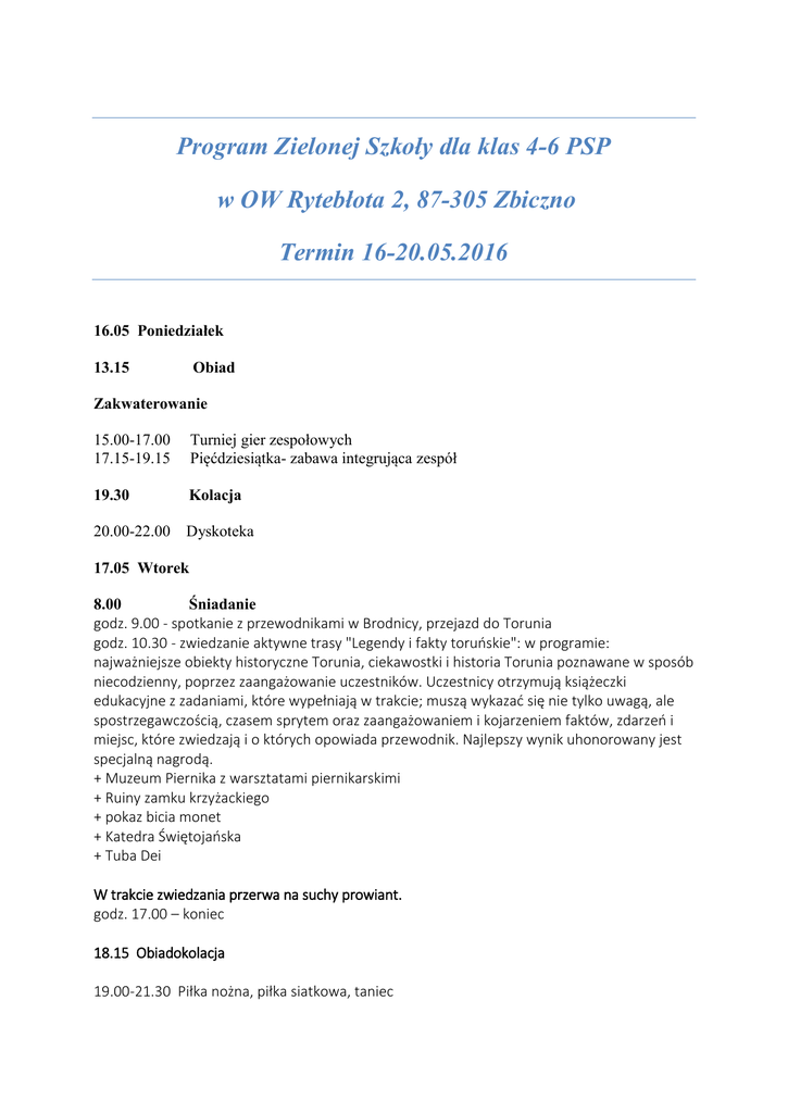 Program Zielonej Szkoły dla klas 4-6 PSP w OW Rytebłota 2, 87-305 Zbiczno Termin 16-20.05.2016 16.05 Poniedziałek 13.15 Obiad Zakwaterowanie 15.00-17.00 17.15-19.15 Turniej gier zespołowych Pięćdziesiątka- zabawa integrująca zespół 19.30 Kolacja 20.00-22.00 Dyskoteka 17.05 Wtorek 8.00 Śniadanie godz. 9.00 - spotkanie z przewodnikami w Brodnicy, przejazd do Torunia godz. 10.30 - zwiedzanie aktywne trasy "Legendy i fakty toruńskie": w programie: najważniejsze obiekty historyczne Torunia, ciekawostki i historia Torunia poznawane w sposób niecodzienny, poprzez zaangażowanie uczestników. Uczestnicy otrzymują książeczki edukacyjne z zadaniami, które wypełniają w trakcie; muszą wykazać się nie tylko uwagą, ale spostrzegawczością, czasem sprytem oraz zaangażowaniem i kojarzeniem faktów, zdarzeń i miejsc, które zwiedzają i o których opowiada przewodnik. Najlepszy wynik uhonorowany jest specjalną nagrodą. + Muzeum Piernika z warsztatami piernikarskimi + Ruiny zamku krzyżackiego + pokaz bicia monet + Katedra Świętojańska + Tuba Dei W trakcie zwiedzania przerwa na suchy prowiant. godz. 17.00 – koniec 18.15 Obiadokolacja 19.00-21.30 Piłka nożna, piłka siatkowa, taniec 18.05 Środa 09.00 Śniadanie Klasy ( IV-VI) cała grupa 10.0 - 12.00 Zabawa integracyjna („Szpiedzy”) 12.15 – 13.15 Baloniada, gry strategiczne, zabawy taneczne 13.15 Obiad 14.30 – 17.00 Zajęcia w lesie (gra terenowa, bazy, sztuka kamuflażu) 17.30- 18.00 Międzyklasowa sportowa rywalizacja 18.30- 21.30 Kolacja przy ognisku, gry i zabawy 19.05 Czwartek (opcja 1) 9.00 Śniadanie 9.45 Zbiórka podział na grupy 10.00- 11.00 10.00- 11.00 10.00- 11.00 Klasa IV Klasy V a,b Klasa VI Paintball wodny Taniec, gry i zabawy przy muzyce Gry i zabawy na wodzie 11.15- 12.15 11.15- 12.15 11.15- 12.15 Klasa VI Klasa IV Klasy Va,b Paintball wodny Taniec, gry i zabawy przy muzyce Gry i zabawy na wodzie 12.30- 13.30 12.30- 13.30 12.30- 13.30 Klasa Va,b Klasa VI Klasa IV Paintball wodny Taniec, gry i zabawy przy muzyce Gry i zabawy na wodzie 14.00 Obiad 15.00-17.00 Całość (klasy IV-VI) aktywność do wyboru (majsterkowanie, piłka nożna taniec, gry i zabawy) Zajęcia w lesie (gra terenowa, bazy, sztuka kamuflażu) 17.15-18.45 19.00 20.00-21.30 Kolacja Zawody sportowe (opcja 2) 9.00 Śniadanie+(suchy prowiant) Zwiedzamy: Brodnica - unikalny trójkątny rynek (pozostałości dawnego, gotyckiego ratusza), - ulica Farna, - kościół św. Katarzyny, - most na Drwęcy, - Wieża Mazurska, - renesansowy spichlerz, - Muzeum w Brodnicy, - Mały Rynek, - Brama Chełmińska, - Park Chopina, - Pałac Anny Wazówny, - pozostałości zamku krzyżackiego. Olsztynek: - zamek z XIX w i fragmenty zabytkowych murów, ok. 1,5 km długości, - Muzeum Budownictwa Ludowego ( Park Etnograficzny w Olsztynku): kilkadziesiąt obiektów, zwierzęta, ogrody, sklepik z pamiątkami - neoklasycystyczny ratusz, - kościół ewangelicki z XIV w, - kamieniczki z przełomu XIX i XX w, 18.30 Obiadokolacja 19.30-21.0 Gry zespołowe Uwaga! W czwartek uczniowie decydują, którą opcje wybierają. 20.05 Piątek 8.15 10.00 -11.00 11.00 -12.00 16.00 Śniadanie Rozdanie nagród Pakowanie, zabieramy suchy prowiant, wyjazd do Warszawy Przyjazd pod szkołę Cena: 5 dni / 680 zł Cena zawiera: - przejazd autokarem o podwyższonym standardzie z pasami bezpieczeństwa, - pełna realizacja powyższego programu, -wszystkie noclegi, - pełne wyżywienie ( śniadanie, obiad, deser, kolacja lub śniadanie, suchy prowiant, obiadokolacja) - wszystkie atrakcje, - bilety wstępu, - przewodnicy, -ubezpieczenie NNW, -opieka pilota, Zajęcia sportowo-rekreacyjne prowadzone przez doświadczonych instruktorów