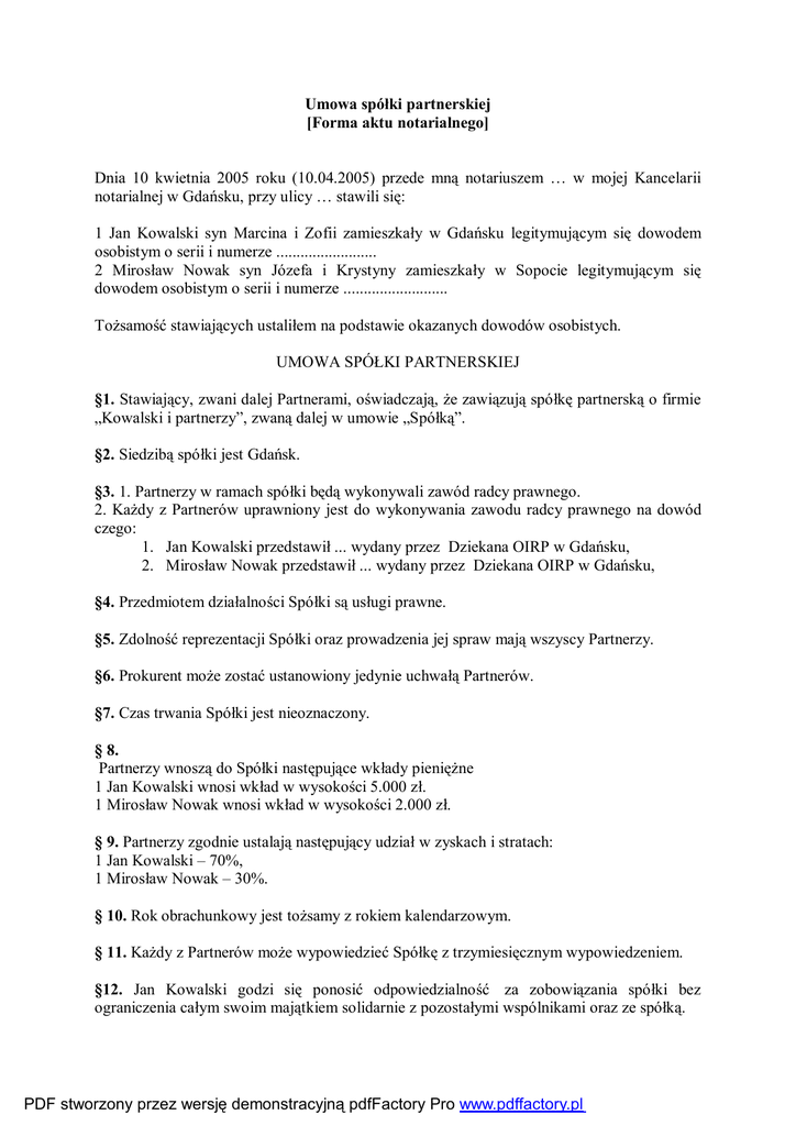 Umowa spółki partnerskiej [Forma aktu notarialnego] Dnia 10 kwietnia 2005 roku (10.04.2005) przede mną notariuszem … w mojej Kancelarii notarialnej w Gdańsku, przy ulicy … stawili się: 1 Jan Kowalski syn Marcina i Zofii zamieszkały w Gdańsku legitymującym się dowodem osobistym o serii i numerze ......................... 2 Mirosław Nowak syn Józefa i Krystyny zamieszkały w Sopocie legitymującym się dowodem osobistym o serii i numerze .......................... Tożsamość stawiających ustaliłem na podstawie okazanych dowodów osobistych. UMOWA SPÓŁKI PARTNERSKIEJ §1. Stawiający, zwani dalej Partnerami, oświadczają, że zawiązują spółkę partnerską o firmie „Kowalski i partnerzy”, zwaną dalej w umowie „Spółką”. §2. Siedzibą spółki jest Gdańsk. §3. 1. Partnerzy w ramach spółki będą wykonywali zawód radcy prawnego. 2. Każdy z Partnerów uprawniony jest do wykonywania zawodu radcy prawnego na dowód czego: 1. Jan Kowalski przedstawił ... wydany przez Dziekana OIRP w Gdańsku, 2. Mirosław Nowak przedstawił ... wydany przez Dziekana OIRP w Gdańsku, §4. Przedmiotem działalności Spółki są usługi prawne. §5. Zdolność reprezentacji Spółki oraz prowadzenia jej spraw mają wszyscy Partnerzy. §6. Prokurent może zostać ustanowiony jedynie uchwałą Partnerów. §7. Czas trwania Spółki jest nieoznaczony. § 8. Partnerzy wnoszą do Spółki następujące wkłady pieniężne 1 Jan Kowalski wnosi wkład w wysokości 5.000 zł. 1 Mirosław Nowak wnosi wkład w wysokości 2.000 zł. § 9. Partnerzy zgodnie ustalają następujący udział w zyskach i stratach: 1 Jan Kowalski – 70%, 1 Mirosław Nowak – 30%. § 10. Rok obrachunkowy jest tożsamy z rokiem kalendarzowym. § 11. Każdy z Partnerów może wypowiedzieć Spółkę z trzymiesięcznym wypowiedzeniem. §12. Jan Kowalski godzi się ponosić odpowiedzialność za zobowiązania spółki bez ograniczenia całym swoim majątkiem solidarnie z pozostałymi wspólnikami oraz ze spółką. PDF stworzony przez wersję demonstracyjną pdfFactory Pro www.pdffactory.pl §13. 1. Partner nie może, bez wyraźnej zgody pozostałych Partnerów, zajmować się interesami konkurencyjnymi, w szczególności uczestniczyć w spółce konkurencyjnej jako wspólnik spółki cywilnej, spółki jawnej, partner, komplementariusz lub członek organu spółki. 2. Za naruszenie zakazu konkurencji Partner zapłaci na rzecz Spółki kwotę 10.000 zł tytułem kary, co nie wyklucza jego odpowiedzialności za szkodę na zasadach ogólnych. § 14. Spadkobierca Partnera może wstąpić na jego miejsce do Spółki, jeżeli wykonuje zawód radcy prawnego, bądź adwokata. § 15. W przypadku rozwiązania Spółki przeprowadza się jej likwidację na zasadach określonych w Kodeksie spółek handlowych. § 16. Zmiany niniejszej umowy wymagają formy aktu notarialnego pod rygorem nieważności. § 17. W kwestiach nie uregulowanych niniejszą umową stosuje się przepisy kodeksu spółek handlowych. § 18. Koszty sporządzenia aktu ponoszą Partnerzy w częściach równych. § 19. Wypisy aktu można wydawać Partnerom w dowolnej liczbie. § 20. Pobrano: Akt ten odczytano, przyjęto i podpisano: [Podpisy wspólników] PDF stworzony przez wersję demonstracyjną pdfFactory Pro www.pdffactory.pl