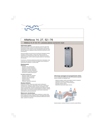 . ky AlfaNova 14, 27, 52 i 76 ky AlfaNova 14, 27, 52 i 76 - Lutowane płytowe wymienniki ciepła Informacje ogólne AlfaNova jest całkowicie nowym typem płytowego wymiennika ciepła (PHE, Plate Heat Exchanger), pierwszym na świecie wykonanym w 100% ze stali kwasoodpornej. Jest on oparty na nowej, rewolucyjnej technologii Alfa Fusion, która jest najwyższym osiągnięciem łączenia elementów wykonanych ze stali kwasoodpornej. Wymienniki AlfaNova są przeznaczone do zastosowań stawiających wysokie wymagania odnośnie czystości, w których jest używany amoniak lub niedozwolone są zanieczyszczenia miedzi i niklu. Wymiennik jest wysoce odporny na korozję, a przez to spełnia wymagania higieniczne i jest przyjazny dla środowiska. W porównaniu z oferowaną wydajnością posiada bardzo małe gabaryty. Jego konstrukcja może wytrzymać niezwykle wymagające warunki spotykane w zastosowaniach związanych z wymianą ciepła. Zastosowania Chłodnictwo: - Chłodzenie oleju sprężarkowego. - Skraplanie czynników chłodniczych. - Odparowanie czynników chłodniczych. - Dochładzanie czynników chłodniczych. - Odzyskciepła od czynników chłodniczych. - Wymienniki do układów absorpcyjnych. Inne główne zastosowania: - Ogrzewanie ciepłej wody użytkowej. . - Chłodzenie mediów w przemyśle. - Chłodzenie oleju hydraulicznego. - Chłodzenie laserów. - Higieniczne/sanitarne. - Chłodzenie i ogrzewanie woda/woda. Zasady działania Powierzchnia wymiany ciepła tworzy pakiet cienkich profilowanych metalowych płyt. Przestrzenie między płytami oraz otwory umieszczone w narożnikach płyt umożliwiają przepływ czynników wymieniających ciepło, zawsze w przeciwprądzie. Czynniki te przepływają przez połączone uszczelki wzdłuż krawędzi płyt. Wymienniki są również połączone w punktach, w których stykają się płyty. Taka konstrukcja zapewnia jednocześnie odpowiednią wytrzymałość mechaniczną wymiennika. Informacje wymagane do przygotowania oferty W celu umożliwienia przedstawicielom Alfa Laval wykonania właściwych obliczeń wymagane są następujące dane: - Natężenie przepływu mediów wymieniających ciepło lub wydajność. Temperatury czynników na zasilaniu i powrocie. Własności Þ zyczne mediów w funkcji temperatury. Wymagane ciśnienie robocze. Maksymalny dopuszczalny spadek ciśnienia. . Wykonanie standardowe Pakiet płyt jest umieszczony między płytami zewnętrznymi, czołową i tylną. Króćce znajdują się na płycie czołowej lub tylnej. Poszczególne płyty pakietu mają charakterystyczne przetłoczenia dla poprawienia efektywności wymiany ciepła i uzyskania ich sztywności. Zasada przepływu w płytowym lutowanym wymienniku ciepła AlfaNova. Atest CE wykres ciśnienie/temperatura (Alfa Nova HP 14) Dane standardowe Minimalna temperatura pracy Maksymalna temperatura pracy Minimalne ciśnienie robocze Maksymalne ciśnienie robocze Objętość kanału, litry/g Maksymalny przepływ *) .. -50ºC (patrz wykres) Próżnia (patrz wykres) 0,02 4,5 m³/h *) Woda przy 5 m/s (prędkość w połączeniach), Standardowe materiały Płyty zewnętrzne Połączenia Płyty Materiał lutu AlfaFusion* Połączenia standardowe . Złącze zewnętrzne gwintu Wymiary standardowe Wymiary w mm . Złącze ’sweat’ S4 S1 Złącze wewnętrzne gwintu S3 S2 A = 7,6 + n x 2,35/0,30 + n + 0,09. Waga w kg: 0,74+ n x 0,046. (n = liczba płyt). Stal nierdzewna AISI 316 Stal nierdzewna AISI 316 Stal nierdzewna AISI 316 Stal nierdzewna AISI 316 Atest CE - wykres ciśnienie/temperatura (Alfa Nova HP 27) Dane standardowe Minimalna temperatura pracy Maksymalna temperatura pracy Minimalne ciśnienie robocze Maksymalne ciśnienie robocze Objętość kanału, litry Maksymalny przepływ *) . -50ºC (patrz wykres) Próżnia (patrz wykres) 0,05 7,5 m³/h *) dla wody przy prędkości w połączeniach 5 m/s. Standardowe materiały Płyty zewnętrzne Połączenia Płyty Materiał lutu AlfaFusion* Połączenia standardowe . B21 Wymiary standardowe Wymiary w mm . H21 H23 A = 14 + n x 2,4. Waga w kg: 1,5 + n x 0,13. (n = liczba płyt). Stal nierdzewna AISI 316 Stal nierdzewna AISI 316 Stal nierdzewna AISI 316 Stal nierdzewna AISI 316 Atest CE - wykres ciśnienie/temperatura (Alfa Nova HP 52) Dane standardowe Minimalna temperatura pracy Maksymalna temperatura pracy Minimalne ciśnienie robocze Maksymalne ciśnienie robocze Objętość kanału, litry Maksymalny przepływ *) . -50ºC (patrz wykres) Próżnia (patrz wykres) 0,095 7,5 m³/h *) dla wody przy prędkości w połączeniach 5 m/s. Standardowe materiały Płyty zewnętrzne Połączenia Płyty Materiał lutu AlfaFusion* Połączenia standardowe . B21 Wymiary standardowe Wymiary w mm . 112 50 S4 24 A H21 S1 H23 466 526 S3 S2 A = 12 + n x 2,4. Waga w kg: 2,2 + n x 0,23. (n = liczba płyt). Stal nierdzewna AISI 316 Stal nierdzewna AISI 316 Stal nierdzewna AISI 316 Stal nierdzewna AISI 316 Atest CE - wykres ciśnienie/temperatura (HP 76) Dane standardowe . Minimalna temperatura pracy Maksymalna temperatura pracy Minimalne ciśnienie robocze Maksymalne ciśnienie robocze Objętość kanału, litry -50ºC (patrz wykres) Próżnia (patrz wykres) 0,25 Maksymalny przepływ *) 34 m³/h *) dla wody przy prędkości w połączeniach 5 m/s. Standardowe materiały Płyty zewnętrzne Połączenia Płyty Materiał lutu AlfaFusion* Stal nierdzewna AISI 316 Stal nierdzewna AISI 316 Stal nierdzewna AISI 316 Stal nierdzewna AISI 316 Połączenia standardowe . B23 Wymiary standardowe (mm) . D21 J23 . A = 14 + n x 2,85. Waga w kg: 9,0 + n x 0,44 with feet. (n = liczba płyt). PD66430PL 0801 Alfa Laval Polska Sp. z o.o. ul. Rzymowskiego 34, 02-697 Warszawa tel.: (22) 549-64-64, fax: (22) 549-64-60 www.alfalaval.pl The information contained herein is correct at the time of issue, but may be subject to change without prior notice.