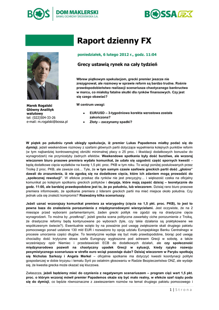 Raport dzienny FX poniedziałek, 6 lutego 2012 r., godz. 11:04 Grecy ustawią rynek na cały tydzień Wbrew piątkowym spekulacjom, grecki premier jeszcze nie zrezygnował, ale rozmowy w sprawie reform są bardzo trudne. Rośnie prawdopodobieństwo realizacji scenariusza chaotycznego bankructwa w marcu, co miałoby fatalne skutki dla rynków finansowych. Czy jest się czego obawiać? Marek Rogalski GG Główny Analityk walutowy tel: (022)504-33-26 e-mail: [email protected] W centrum uwagi: EUR/USD – 3-tygodniowa korekta wzrostowa została zakończona? Złoty – zaczynamy spadki? W piątek po południu rynek ubiegły spekulacje, iż premier Lukas Papademos miałby podać się do dymisji, jeżeli weekendowe rozmowy z szefami głównych partii dotyczące wypełnienia kolejnych punktów reform (w tym najbardziej kontrowersyjnej obniżki minimalnej płacy o 25 proc. i likwidacji dodatkowych bonusów do wynagrodzeń) nie przyniosłyby żadnych efektów. Weekendowe spotkania były dość burzliwe, ale wczoraj wieczorem biuro prasowe premiera wydało komunikat, że udało się uzgodnić część spornych kwestii – będą dodatkowe cięcia wydatków na kwotę 1,5 pkt. proc. PKB w tym roku. To wciąż poniżej postulowanych przez Troikę 2 proc. PKB, ale zawsze coś… Tyle, że w tym samym czasie szefowie greckich partii dość „głośno” dawali do zrozumienia, iż nie zgodzą się na dodatkowe cięcia, które ich zdaniem mogą prowadzić do „społecznej rewolucji”. W efekcie przekaz dla rynków nie jest precyzyjny… i większość czeka na oficjalny komunikat po kolejnym spotkaniu greckich polityków i decyzje, które mają zapaść dzisiaj – teoretycznie do godz. 11:00, ale bardziej prawdopodobne jest to, że po południu, lub wieczorem. Dzisiaj rano biuro prasowe premiera informowało, że spotkanie premiera z liderami greckich partii ma mieć miejsce około południa. Czy jednak uda się znaleźć kompromis? Rozważmy kilka scenariuszy. Jeżeli uznać wczorajszy komunikat premiera za wiarygodny (cięcia na 1,5 pkt. proc. PKB), to jest to pewna baza do znalezienia porozumienia z międzynarodowymi wierzycielami. Jest oczywiste, że na 2 miesiące przed wyborami parlamentarnymi, żaden grecki polityk nie zgodzi się na drastyczne cięcia wynagrodzeń. To można by „przełknąć”, jeżeli grecka scena polityczna zawarłaby ciche porozumienie z Troiką, że drastyczne reformy będą kontynuowane po wyborach (tyle, czy takie działania są praktykowane we współczesnym świecie?). Ewentualnie wzięto by na poważnie pod uwagę zwiększenie skali drugiego pakietu pomocowego ponad ustalone 130 mld EUR i rozważono by opcję udziału Europejskiego Banku Centralnego w procesie umorzenia części długów. To teoretycznie wydaje się być mało prawdopodobne, biorąc pod uwagę chociażby dość krytyczne słowa szefa Eurogrupy wygłoszone pod adresem Grecji w sobotę, a także wcześniejszy opór Niemiec i przedstawicieli ECB do dodatkowych działań, ale czy społeczność międzynarodowa pozwoli na chaotyczny upadek Grecji w sytuacji, kiedy ryzyko rozwoju pesymistycznego scenariusza w strefie euro wciąż pozostaje duże? Dzisiaj wieczorem w Paryżu spotkają się Nicholas Sarkozy i Angela Merkel – oficjalnie spotkanie ma dotyczyć kwestii koordynacji polityki gospodarczej w dobie kryzysu i tematu Syrii po ostatnim głosowaniu w Radzie Bezpieczeństwa ONZ, ale wydaje się, że kwestia grecka może okazać się kluczowa. Zwłaszcza, jeżeli będziemy mieć do czynienia z negatywnym scenariuszem – program cięć wart 1,5 pkt. proc. o którym wczoraj mówił premier Papademos okaże się być mało realny, w efekcie szef rządu poda się do dymisji, co będzie równoznaczne z zawieszeniem rozmów na temat drugiego pakietu pomocowego i 1|Strona porozumienia z prywatnymi wierzycielami w temacie umorzenia ponad 70 proc. długu. Reakcja rynków będzie w takiej sytuacji dramatyczna – zwracałem na to uwagę już w piątek po południu http://bossafx.pl/popup.jsp?layout=fx_popup&page=ap&news_id=28503&news_cat_id=3031 Strach przed nieuporządkowanym bankructwem Grecji doprowadzi do negatywnych ruchów na europejskim rynku długu, powrotu obaw związanych z kondycją banków, a także szybko przesunie zainteresowanie rynków na Portugalię, która ma duże szanse zostać kolejną „czarną owcą” w Europie. EUR/USD – 3-tygodniowa korekta wzrostowa została zakończona? Spadki jakie miały miejsce dzisiaj rano sprowadziły notowania w okolice 1,3028. Teoretycznie, zatem obroniliśmy dolne ograniczenie kluczowej strefy wsparcia 1,3030-80, ale nie w stylu, który daje szanse na jego trwalszą obronę. Układ zaczyna być mocno spadkowy, co jednocześnie wspiera ujęcie tygodniowe koszyków BOSSA_EUR i BOSSA_USD (wszystkie 3 wykresy poniżej). Jeżeli przyjąć, że obserwowane na przestrzeni ostatnich 3 tygodni odreagowanie EUR/USD w górę było tylko ruchem powrotnym do linii szyi widocznej formacji głowy i ramion, to teraz czeka nas dość gwałtowny ruch w dół w ciągu najbliższych tygodni. A problemów będzie coraz więcej, na co zwracałem uwagę w tygodniowej analizie – http://bossafx.pl/_gAllery/aid28509/Raport_tygodniowy_04_02_2012.pdf. Wykres dzienny EUR/USD Kluczowe wsparcia: 1,3145; 1,3100; 1,3080; 1,3030 Kluczowe opory: 1,3000; 1,2985; 1,2940; 1,2890 2|Strona Wykres tygodniowy EUR/USD Wykres tygodniowy BOSSA_EUR 3|Strona Wykres tygodniowy BOSSA_USD Złoty – zaczynamy spadki? Realizacja negatywnego scenariusza dla Grecji w oczywisty sposób podcięłaby dotychczasowy optymizm wokół złotego, który jeszcze dzisiaj rano był kontynuowany (echa piątkowych bardzo dobrych danych z amerykańskiego rynku pracy). Szczegółowo o scenariuszu technicznym dla złotego pisaliśmy już dzisiaj rano: http://bossafx.pl/index.jsp?layout=fx_13&page=0&news_cat_id=3030&news_id=28520 Niemniej warto na chwilę spojrzeć na koszyk złotego (BOSSA_PLN), który właśnie generuje 