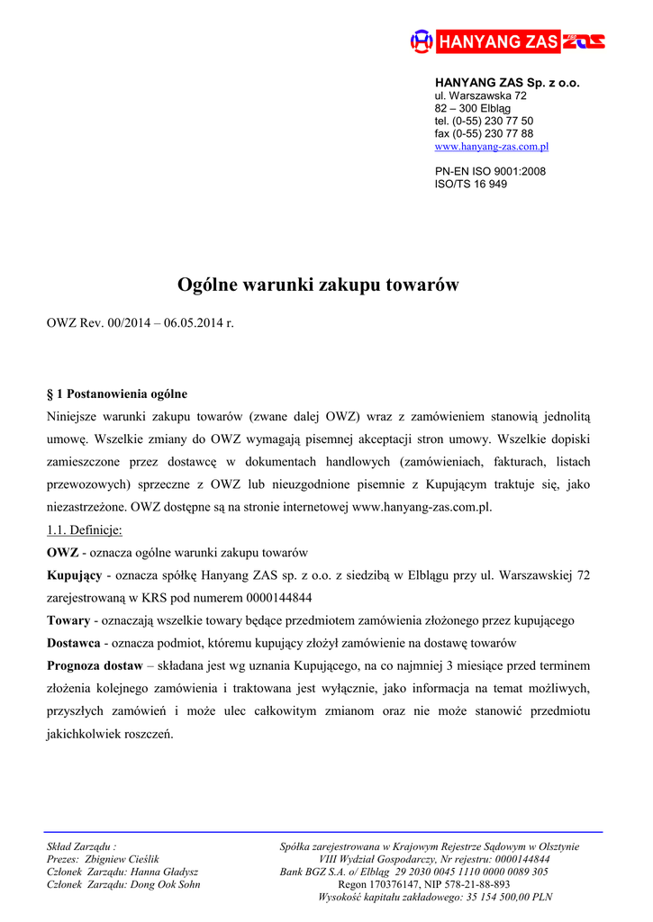 HANYANG ZAS Sp. z o.o. ul. Warszawska 72 82 – 300 Elbląg tel. (0-55) 230 77 50 fax (0-55) 230 77 88 www.hanyang-zas.com.pl PN-EN ISO 9001:2008 ISO/TS 16 949 Ogólne warunki zakupu towarów OWZ Rev. 00/2014 – 06.05.2014 r. § 1 Postanowienia ogólne Niniejsze warunki zakupu towarów (zwane dalej OWZ) wraz z zamówieniem stanowią jednolitą umowę. Wszelkie zmiany do OWZ wymagają pisemnej akceptacji stron umowy. Wszelkie dopiski zamieszczone przez dostawcę w dokumentach handlowych (zamówieniach, fakturach, listach przewozowych) sprzeczne z OWZ lub nieuzgodnione pisemnie z Kupującym traktuje się, jako niezastrzeżone. OWZ dostępne są na stronie internetowej www.hanyang-zas.com.pl. 1.1. Definicje: OWZ - oznacza ogólne warunki zakupu towarów Kupujący - oznacza spółkę Hanyang ZAS sp. z o.o. z siedzibą w Elblągu przy ul. Warszawskiej 72 zarejestrowaną w KRS pod numerem 0000144844 Towary - oznaczają wszelkie towary będące przedmiotem zamówienia złożonego przez kupującego Dostawca - oznacza podmiot, któremu kupujący złożył zamówienie na dostawę towarów Prognoza dostaw – składana jest wg uznania Kupującego, na co najmniej 3 miesiące przed terminem złożenia kolejnego zamówienia i traktowana jest wyłącznie, jako informacja na temat możliwych, przyszłych zamówień i może ulec całkowitym zmianom oraz nie może stanowić przedmiotu jakichkolwiek roszczeń. Skład Zarządu : Prezes: Zbigniew Cieślik Członek Zarządu: Hanna Gładysz Członek Zarządu: Dong Ook Sohn Spółka zarejestrowana w Krajowym Rejestrze Sądowym w Olsztynie VIII Wydział Gospodarczy, Nr rejestru: 0000144844 Bank BGZ S.A. o/ Elbląg 29 2030 0045 1110 0000 0089 305 Regon 170376147, NIP 578-21-88-893 Wysokość kapitału zakładowego: 35 154 500,00 PLN § 2 Warunki zawarcia umowy 2.1. Umowę uważa się za zawartą, gdy dostawca potwierdzi pisemnie lub za pomocą poczty elektronicznej, iż zapoznał się z OWZ i potwierdzi otrzymanie zmówienia lub rozpocznie dostawę. Potwierdzenie otrzymania kolejnych zamówień w ramach tej samej umowy przez dostawcę może odbywać się za pośrednictwem poczty elektronicznej. 2.2. Przyjmuje się, że OWZ znajdują zastosowanie do wszystkich kolejnych zamówień złożonych przez kupującego danemu dostawcy bez konieczności ich powtórnego doręczania. 2.3. Dostawca najpóźniej przy pierwszej dostawie zobowiązany jest dostarczyć kupującemu następujące dokumenty - odpis aktualnego KRS - zaświadczenie o nadaniu numeru NIP i REGON 2.4. Kupujący ma prawo anulować zamówienie, jeśli dostawca nie potwierdzi go w ciągu 3 dni od otrzymania lub w tym terminie nie rozpocznie dostawy. § 3 Zamówienia 3.1. Rodzaje towarów, ilość, cena, wymagane specyfikacje, które mają być dostarczone wraz z towarem, oraz termin dostawy określone są w zamówieniu. 3.2. Zamówienia są składane przez kupującego w formie pisemnej lub za pośrednictwem poczty elektronicznej. Ustne zamówienia są ważne o ile zostały potwierdzone na piśmie lub za pośrednictwem poczty elektronicznej przez kupującego. § 4 Realizacja umowy 4.1. Dostawca zobowiązany jest wraz z towarem dostarczyć specyfikacje wysyłkowe, wraz z liczbą, wagą, wymiarami, wszelkie wymagane prawem atesty, certyfikaty, karty gwarancyjne, instrukcje obsługi itp. 4.2. Ryzyko związane z transportem towaru ( zniszczenie, uszkodzenie, utrata) spoczywa na dostawcy do momentu odbioru towaru przez osoby upoważnione do odbioru ze strony kupującego. 4.3. Towar przeznaczony do sprzedaży powinien być właściwie zabezpieczony w sposób uniemożliwiający jego uszkodzenie podczas transportu. 4.4. Dostawa przed ustalonym terminem może mieć miejsce tylko za zgodą kupującego z zastrzeżeniem, że zapłata będzie miała miejsce zgodnie z terminem ustalonym w zamówieniu. 4.5. Dostawca na swój koszt ma obowiązek dokonać rozładunku towarów po uzyskaniu zgody osób upoważnionych przez kupującego i w miejscu przez nich wyznaczonym. 4.6. Towar powinien być wstępnie sprawdzony przez kupującego niezwłocznie po jego odebraniu. W Skład Zarządu : Prezes: Zbigniew Cieślik Członek Zarządu: Hanna Gładysz Członek Zarządu: Dong Ook Sohn Spółka zarejestrowana w Krajowym Rejestrze Sądowym w Olsztynie VIII Wydział Gospodarczy, Nr rejestru: 0000144844 Bank BGZ S.A. o/ Elbląg 29 2030 0045 1110 0000 0089 305 Regon 170376147, NIP 578-21-88-893 Wysokość kapitału zakładowego: 35 154 500,00 PLN razie widocznych uszkodzeń lub widocznych braków w ilości dostarczonego towaru dających się zauważyć przy odbiorze, z czynności odbioru sporządza się protokół zdawczo – odbiorczy Kopię protokołu niezwłocznie wysyła się do dostawcy i wzywa do niezwłocznego dostarczenia brakującego towaru lub dostarczenia towaru nieuszkodzonego. W razie braku niezwłocznego dostarczenia towaru kupujący ma prawo do domagania się kary umownej w wysokości 20 % wartości danego zamówienia i/lub odszkodowania za wynikłą szkodę. § 5 Reklamacje i odpowiedzialność sprzedawcy 5.1. Dostawca gwarantuje, że dostarczona ilość i jakość towaru będzie zgodna z zamówieniem i OWZ oraz, że towar jest wolny od wad prawnych. W przypadku wady prawnej, dostawca przyjmuje na siebie obowiązki wynikające z roszczeń osób trzecich. 5.2. W przypadku dostawy niezgodnej z zamówieniem pod względem ilości lub warunkami jakościowo- technicznymi, kupujący ma prawo reklamować towar w terminie 30 dni od dnia dostawy, a przypadku wad ukrytych w terminie 30 dni od dnia ich wykrycia. 5.3. W przypadku stwierdzenia wad towaru określonych w pkt 4.2 kupujący ma prawo według własnego wyboru: 5.3.1. Zwrócić zakwestionowany towar na koszt sprzedającego i żądać zwrotu ceny 5.3.2. Zatrzymać towar z żądaniem upustu cenowego 5.3.3. Zwrócić zakwestionowany towar na koszt sprzedawcy i żądać dostarczenia towaru wolnego od wad w terminie wskazanym przez kupującego oraz domagać się kar umownych w wysoko