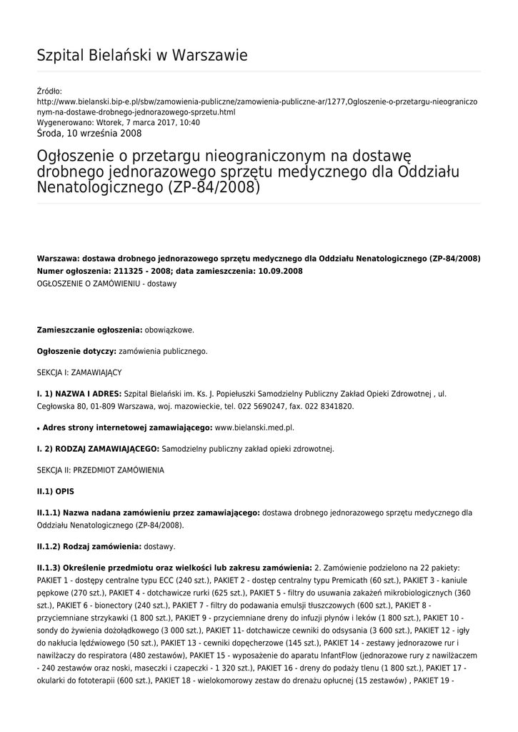 Szpital Bielański w Warszawie Źródło: http://www.bielanski.bip-e.pl/sbw/zamowienia-publiczne/zamowienia-publiczne-ar/1277,Ogloszenie-o-przetargu-nieograniczo nym-na-dostawe-drobnego-jednorazowego-sprzetu.html Wygenerowano: Wtorek, 7 marca 2017, 10:40 Środa, 10 września 2008 Ogłoszenie o przetargu nieograniczonym na dostawę drobnego jednorazowego sprzętu medycznego dla Oddziału Nenatologicznego (ZP-84/2008) Warszawa: dostawa drobnego jednorazowego sprzętu medycznego dla Oddziału Nenatologicznego (ZP-84/2008) Numer ogłoszenia: 211325 - 2008; data zamieszczenia: 10.09.2008 OGŁOSZENIE O ZAMÓWIENIU - dostawy Zamieszczanie ogłoszenia: obowiązkowe. Ogłoszenie dotyczy: zamówienia publicznego. SEKCJA I: ZAMAWIAJĄCY I. 1) NAZWA I ADRES: Szpital Bielański im. Ks. J. Popiełuszki Samodzielny Publiczny Zakład Opieki Zdrowotnej , ul. Cegłowska 80, 01-809 Warszawa, woj. mazowieckie, tel. 022 5690247, fax. 022 8341820. ● Adres strony internetowej zamawiającego: www.bielanski.med.pl. I. 2) RODZAJ ZAMAWIAJĄCEGO: Samodzielny publiczny zakład opieki zdrowotnej. SEKCJA II: PRZEDMIOT ZAMÓWIENIA II.1) OPIS II.1.1) Nazwa nadana zamówieniu przez zamawiającego: dostawa drobnego jednorazowego sprzętu medycznego dla Oddziału Nenatologicznego (ZP-84/2008). II.1.2) Rodzaj zamówienia: dostawy. II.1.3) Określenie przedmiotu oraz wielkości lub zakresu zamówienia: 2. Zamówienie podzielono na 22 pakiety: PAKIET 1 - dostępy centralne typu ECC (240 szt.), PAKIET 2 - dostęp centralny typu Premicath (60 szt.), PAKIET 3 - kaniule pępkowe (270 szt.), PAKIET 4 - dotchawicze rurki (625 szt.), PAKIET 5 - filtry do usuwania zakażeń mikrobiologicznych (360 szt.), PAKIET 6 - bionectory (240 szt.), PAKIET 7 - filtry do podawania emulsji tłuszczowych (600 szt.), PAKIET 8 przyciemniane strzykawki (1 800 szt.), PAKIET 9 - przyciemniane dreny do infuzji płynów i leków (1 800 szt.), PAKIET 10 sondy do żywienia dożołądkowego (3 000 szt.), PAKIET 11- dotchawicze cewniki do odsysania (3 600 szt.), PAKIET 12 - igły do nakłucia lędźwiowego (50 szt.), PAKIET 13 - cewniki dopęcherzowe (145 szt.), PAKIET 14 - zestawy jednorazowe rur i nawilżaczy do respiratora (480 zestawów), PAKIET 15 - wyposażenie do aparatu InfantFlow (jednorazowe rury z nawilżaczem - 240 zestawów oraz noski, maseczki i czapeczki - 1 320 szt.), PAKIET 16 - dreny do podaży tlenu (1 800 szt.), PAKIET 17 okularki do fototerapii (600 szt.), PAKIET 18 - wielokomorowy zestaw do drenażu opłucnej (15 zestawów) , PAKIET 19 - serwety jałowe (240 szt.), PAKIET 20 - zestaw do transfuzji wymiennej noworodka (25 zestawów). PAKIET 21 - worki do pobierania moczu (200 szt.), PAKIET 22 - kaniule do naczyń obwodowych (2 000 szt.).. II.1.4) Wspólny Słownik Zamówień (CPV): 33.14.10.00-0. II.1.5) Czy dopuszcza się złożenie oferty częściowej: Tak, liczba części: 22. II.1.6) Czy dopuszcza się złożenie oferty wariantowej: Nie. II.2) CZAS TRWANIA ZAMÓWIENIA LUB TERMIN WYKONANIA: Okres w miesiącach: 12. SEKCJA III: INFORMACJE O CHARAKTERZE PRAWNYM, EKONOMICZNYM, FINANSOWYM I TECHNICZNYM III.1) WARUNKI DOTYCZĄCE ZAMÓWIENIA Informacja na temat wadium: Zamawiajacy nie wymaga wniesienia wadium III.2) WARUNKI UDZIAŁU ● Opis warunków udziału w postępowaniu oraz opis sposobu dokonywania oceny spełniania tych warunków: Ocena spełniania warunków wymaganych od Wykonawców zostanie dokonana wg formuły: spełnia - nie spełnia na podstawie analizy dokumentów wymaganych O udzielenie zamówienia mogą ubiegać się wykonawcy, którzy: 1. posiadają uprawnienia do wykonywania określonej działalności lub czynności, jeżeli ustawy nakładają obowiązek posiadania takich uprawnień; 2. posiadają niezbędną wiedzę i doświadczenie oraz dysponują potencjałem technicznym i osobami zdolnymi do wykonania zamówienia 3. znajdują się w sytuacji ekonomicznej i finansowej zapewniającej wykonanie zamówienia; 4. nie podlegają wykluczeniu z postępowania o udzielenie zamówienia.. ● Informacja o oświadczeniach i dokumentach, jakie mają dostarczyć wykonawcy w celu potwierdzenia spełniania warunków udziału w postępowaniu: I. Dla potwierdzenia spełnienia warunków Wykonawcy przedkładają niżej wymienione dokumenty: 1. Oświadczenie o spełnieniu warunków: 1.1. określonych w art. 22 ust. 1 pkt 1-3 ustawy Pzp na formularzu zgodnym z treścią załącznika nr 2a do formularza oferty. 1.2. określonych w art. 24 ust. 1 i 2 ustawy Pzp na formularzu zgodnym z treścią załącznika nr 2b do formularza oferty. 2. Aktualny odpis z właściwego rejestru albo aktualne zaświadczenie o wpisie do ewidencji działalności gospodarczej, jeżeli odrębne przepisy wymagają wpisu do rejestru lub zgłoszenia do ewidencji działalności gospodarczej, Powyższy dokument musi być wystawiony nie wcześniej niż 6 miesięcy przed upływem terminu składania ofert. 3. Jeżeli wykonawca ma siedzibę lub miejsce zamieszkania poza terytorium Rzeczypospolitej Polskiej, zamiast dokumentu, o którym mowa w pkt 2. składa dokument wystawiony w kraju, w którym ma siedzibę lub miejsce zamieszkania, potwierdzający, że nie otwarto wobec niego likwidacji ani nie ogłoszono upadłości, wystawiony nie wcześniej niż 6 miesięcy przed upływem terminu składania ofert. Jeżeli w kraju pochodzenia osoby lub w kraju, w którym wykonawca ma siedzibę lub miejsce zamieszkania nie wydaje się w/w dokumentu, zastępuje się go dokumentem zawierającym oświadczenie złożone przed notariuszem, właściwym organem sądowym, administracyjnym albo organem sądowym, administracyjnym albo organem samorządu zawodowego lub gospodarczego odpowiednio kraju pochodzenia osoby lub kraju, w którym wykonawca ma siedzibę lub miejsce zamieszkania, wystawiony nie wcześniej niż 6 miesięcy przed upływem terminu składania ofert. II. Dokumenty potwierdzające, że oferowane dostawy odpowiadają wymaganiom określonym przez Zamawiającego. 1. dokument dopuszczaj