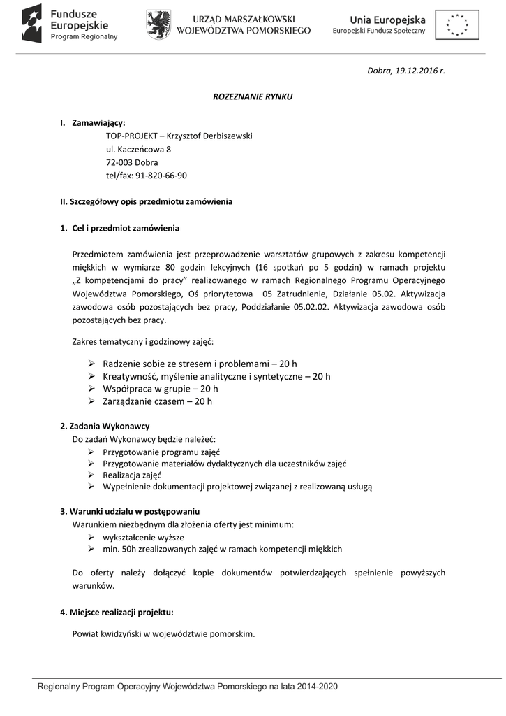 Dobra, 19.12.2016 r. ROZEZNANIE RYNKU I. Zamawiający: TOP-PROJEKT – Krzysztof Derbiszewski ul. Kaczeńcowa 8 72-003 Dobra tel/fax: 91-820-66-90 II. Szczegółowy opis przedmiotu zamówienia 1. Cel i przedmiot zamówienia Przedmiotem zamówienia jest przeprowadzenie warsztatów grupowych z zakresu kompetencji miękkich w wymiarze 80 godzin lekcyjnych (16 spotkań po 5 godzin) w ramach projektu „Z kompetencjami do pracy” realizowanego w ramach Regionalnego Programu Operacyjnego Województwa Pomorskiego, Oś priorytetowa 05 Zatrudnienie, Działanie 05.02. Aktywizacja zawodowa osób pozostających bez pracy, Poddziałanie 05.02.02. Aktywizacja zawodowa osób pozostających bez pracy. Zakres tematyczny i godzinowy zajęć: Radzenie sobie ze stresem i problemami – 20 h Kreatywność, myślenie analityczne i syntetyczne – 20 h Współpraca w grupie – 20 h Zarządzanie czasem – 20 h 2. Zadania Wykonawcy Do zadań Wykonawcy będzie należeć: Przygotowanie programu zajęć Przygotowanie materiałów dydaktycznych dla uczestników zajęć Realizacja zajęć Wypełnienie dokumentacji projektowej związanej z realizowaną usługą 3. Warunki udziału w postępowaniu Warunkiem niezbędnym dla złożenia oferty jest minimum: wykształcenie wyższe min. 50h zrealizowanych zajęć w ramach kompetencji miękkich Do oferty należy dołączyć kopie dokumentów potwierdzających spełnienie powyższych warunków. 4. Miejsce realizacji projektu: Powiat kwidzyński w województwie pomorskim. 5. Termin realizacji zamówienia: Styczeń-luty 2017 r. 6. Forma współpracy: Realizacja zajęć na podstawie umowy cywilno-prawnej (umowa zlecenia). 7. Wymagania wobec oferty: Oferty należy przesyłać drogą elektroniczną na adres [email protected] lub składać osobiście u Zamawiającego do 27.12.2016 r. do godz. 16.00 Miejsce złożenia oferty: adres korespondencyjny, numer faksu i adres mailowy: Ul. Ściegiennego 25/16, 70-354 Szczecin Faks: 91-820-66-90 Mail: [email protected] Ofertę należy sporządzić wg formularza ofertowego stanowiącego Załącznik nr 1. Oferta cenowa Wykonawcy powinna zawierać wszelkie obciążenia (ZUS, podatek) oraz załącznik – CV i kopie dokumentów potwierdzających spełnienie warunków udziału w postępowaniu. 8. Warunki wyboru Wykonawcy 1) W celu zapewnienia porównywalności wszystkich ofert, Zamawiający zastrzega sobie prawo do skontaktowania się z właściwymi Oferentami w celu uzupełnienia lub doprecyzowania ofert. 2) Po dokonaniu wyboru Wykonawcy, Zamawiający zastrzega sobie prawo negocjacji warunków zamówienia. 3) Zamawiający zastrzega sobie prawo do odpowiedzi tylko na wybraną ofertę. 4) Niniejsza oferta nie jest ogłoszeniem w rozumieniu ustawy Prawo zamówień publicznych. 5) Zamówienie zostanie sfinansowane przez Unię Europejską ze środków Europejskiego Funduszu Społecznego oraz ze środków budżetu państwa w ramach Regionalnego Programu Operacyjnego Województwa Pomorskiego Załącznik nr 1 do Rozeznania rynku z dn. 19.12.2016 r. DANE WYKONAWCY: ………………………………………………………………..…………………….….. Nazwa firmy/imię i nazwisko ………………………………………………………………..…………………….….. Ulica, nr domu/mieszkania, kod pocztowy, miejscowość ………………………………………………………………..…………………….….. Telefon kontaktowy ………………………………………………………………..…………………….….. Adres e-mail OFERTA CENOWA NA REALIZACJĘ WARSZTATÓW GRUPOWYCH Z ZAKRESU KOMPETENCJI MIĘKKICH w ramach projektu „Z kompetencjami do pracy” realizowanego w ramach Regionalnego Programu Operacyjnego Województwa Pomorskiego, Oś priorytetowa 05 Zatrudnienie, Działanie 05.02. Aktywizacja zawodowa osób pozostających bez pracy, Poddziałanie 05.02.02. Aktywizacja zawodowa osób pozostających bez pracy. 1. Oferuję wykonanie usługi objętej zamówieniem za: a. kwota brutto wynosząca (należy podać do dwóch miejsc po przecinku) ………………..…… PLN, (słownie zł ………………………..........................................................................................................) 2. Zostałem/am poinformowany/a o przedmiocie zamówienia. Załącznikami do niniejszej oferty są: 1. CV. 2. Kopia dokumentów potwierdzająca spełnienie warunków udziału w postępowaniu. ……………………………………, dnia ……………………….. (czytelny podpis)