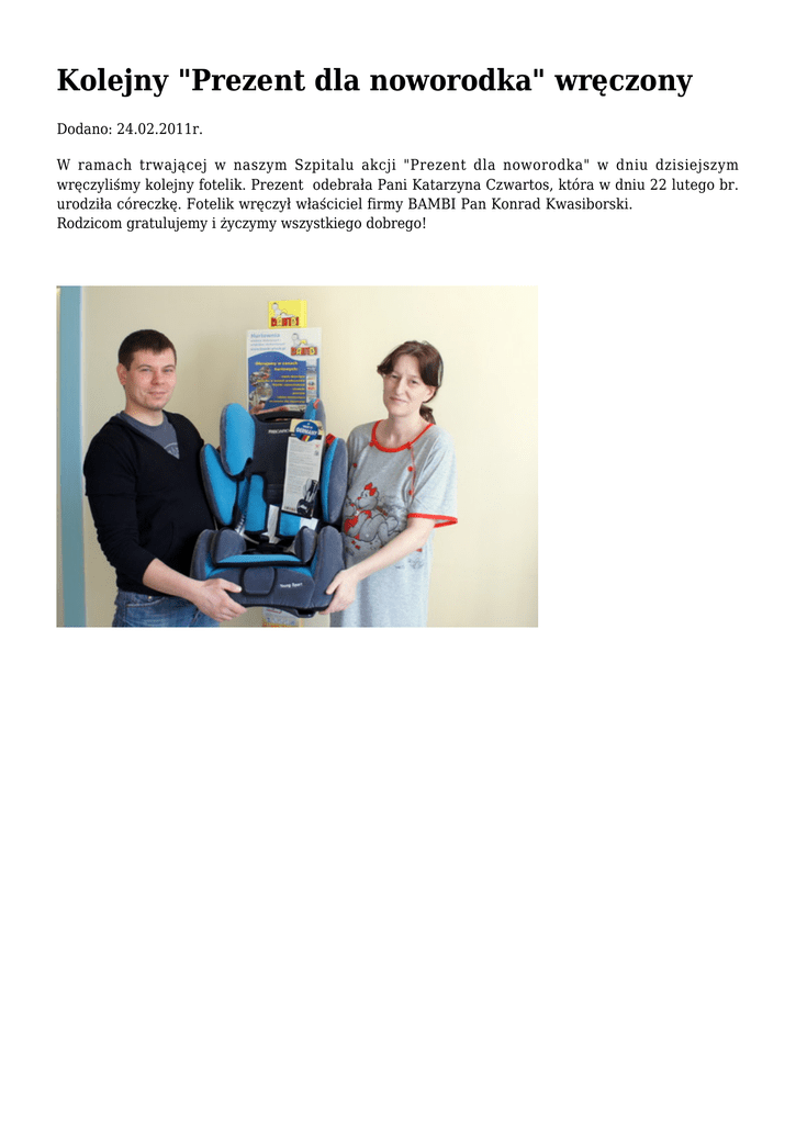 Kolejny "Prezent dla noworodka" wręczony Dodano: 24.02.2011r. W ramach trwającej w naszym Szpitalu akcji "Prezent dla noworodka" w dniu dzisiejszym wręczyliśmy kolejny fotelik. Prezent odebrała Pani Katarzyna Czwartos, która w dniu 22 lutego br. urodziła córeczkę. Fotelik wręczył właściciel firmy BAMBI Pan Konrad Kwasiborski. Rodzicom gratulujemy i życzymy wszystkiego dobrego!
